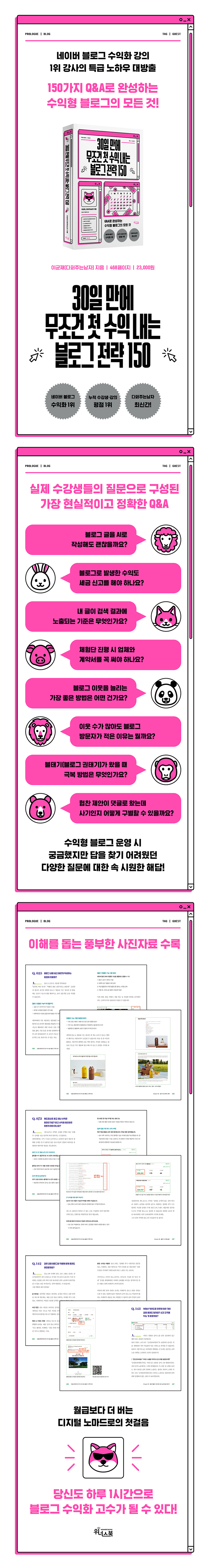 ù ¹øÂ° Àú¼ ¡¸0¿øÀ¸·Î ½ÃÀÛÇØ¼ ¿ù 1,000¸¸ ¿ø ¹ö´Â ºí·Î±×¡¹¸¦ ÅëÇØ ¼ö¸¹Àº µ¶ÀÚ¿Í ¼ö°»ý¿¡°Ô À¯¿ëÇÑ Áö½ÄÀ» ÀüÇØ È£ÆòÀ» ¹ÞÀº À̱ÕÀç ÀúÀÚÀÇ µÎ ¹øÂ° Àú¼°¡ Ãâ°£µÇ¾ú´Ù. À̹ø Ã¥¿¡¼´Â ÀúÀÚ°¡ ½ÇÁ¦ °ÀǸ¦ ÁøÇàÇÏ¸ç ¼ö°»ýµé¿¡°Ô ÀÚÁÖ ¹ÞÀº Áú¹®µé°ú óÀ½ ºí·Î±× ¼öÀÍȸ¦ µµÀüÇÏ´Â »ç¶÷µéÀÌ ±Ã±ÝÇØÇÒ ¹ýÇÑ Áú¹®µéÀ» ¸ð¾Æ ±×¿¡ ´ëÇÑ ÀúÀÚÀÇ ³ëÇϿ찡 °¡µæ ´ã±ä ´äº¯À» ´Þ¾Ò´Ù. ÃÑ 150°³ÀÇ Áú¹®°ú ÀÀ´äÀ¸·Î ¿Ï¼ºµÈ ¹®´äÁýÀÌÀÚ ÇØ°á¼ÀÎ ÀÌ Ã¥Àº ºí·Î±× Ãʺ¸ºÎÅÍ °í¼ö±îÁö, ºí·Î±×¸¦ ¿î¿µÇÏ¸ç ¸¶ÁÖÇÒ ¼ö ÀÖ´Â ´Ù¾çÇÑ »óȲ°ú °í¹ÎÀ» ´ã¾Æ ¾î¶² »óȲ¿¡¼µç µµ¿òÀ» ¾òÀ» ¼ö ÀÖµµ·Ï Çß´Ù. ºí·Î±× ±âº» ¼³Á¤ºÎÅÍ ÄÜÅÙÃ÷ Á¦ÀÛ ÆÁ, °Ë»ö ³ëÃâ, ÀÌ¿ô °ü¸®, üÇè´Ü ¹× ±¤°í ÁøÇà µî ºí·Î±×¸¦ ¿î¿µÇÏ¸ç ±Ã±ÝÁõÀÌ »ý±æ ¶§¸é ¾ðÁ¦µç ÆîÃ帰í Á¶¾ðÀ» ¾òÀ» ¼ö Àִ åÀÌ´Ù. ºí·Î±× ¼öÀÍȸ¦ ÅëÇØ µðÁöÅÐ ³ë¸¶µåÀÇ ²ÞÀ» ½ÇÇöÇÏ°í ½ÍÀº ºí·Î±× ¿î¿µÀÚ¶ó¸é Çʼö ¼ÒÀåÇÏ¿© ³×À̹ö ºí·Î±× °ÀÇ 1À§ °»çÀÇ °æÇè°ú ³ëÇϿ츦 ³» °ÍÀ¸·Î ¸¸µé¾î º¸ÀÚ.