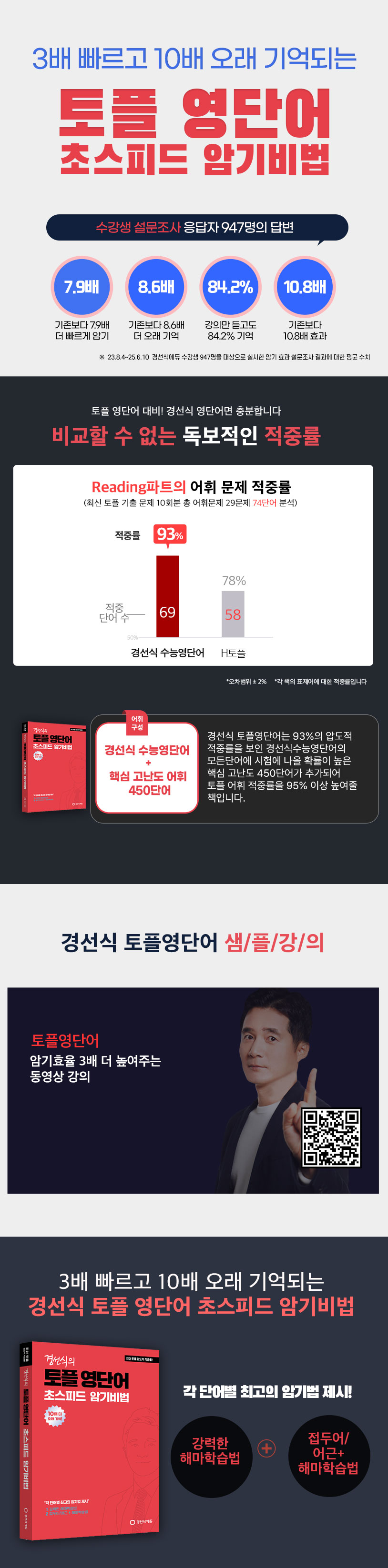 ¡º°æ¼±½Ä ¿µ´Ü¾î¡» ½Ã¸®Áî´Â 2003³â¿¡ óÀ½ Ãâ°£µÈ ÈÄ 360¸¸¸í ÀÌ»óÀÇ ÇлýµéÀÌ º¸¾Æ¿Â ½ºÅ׵𼿷¯ÀÌ´Ù. °æ¼±½Ä ÅäÇà ¿µ´Ü¾î ÃʽºÇÇµå ¾Ï±âºñ¹ý¿¡´Â ÅäÇà ¼öÇè ¿µ¾î¿¡ ²À ÇÊ¿äÇÑ ¼ö´É ¾îÈÖ 3,000¿©°³, °í³µµ ¾îÈÖ 340°³. ÃÑ 3,400¿©°³ÀÇ Áß¿ä´Ü¾î¸¦ ¿ì¼±¼øÀ§¿¡ µû¶ó ¼ö·ÏÇÏ¿´´Ù. ƯÈ÷ ÃֽŠÅäÇà ½ÃÇèÀ» ¿Ïº® ºÐ¼®ÇÏ¿© ¿©Å¸ ÅäÇà µµ¼ ´ëºñ ¾ÐµµÀû ÀûÁß·üÀ» º¸ÀδÙ. ¶ÇÇÑ ¾Ï±âÈ¿À²À» 3¹è ´õ ³ô¿©ÁÖ´Â µ¿¿µ»ó °ÀÇ ¹× °ÀÇ ¼Ó 2,500¿©°³ÀÇ ¿¬»ó ¸¸È¸¦ Ȱ¿ëÇϸé, ÅäÇà ¿µ´Ü¾î 3,400´Ü¾î¸¦ 4~8ÀÏ ¿Ï¼ºÀÌ °¡´ÉÇϵµ·Ï ±¸¼ºÇÏ¿´´Ù.