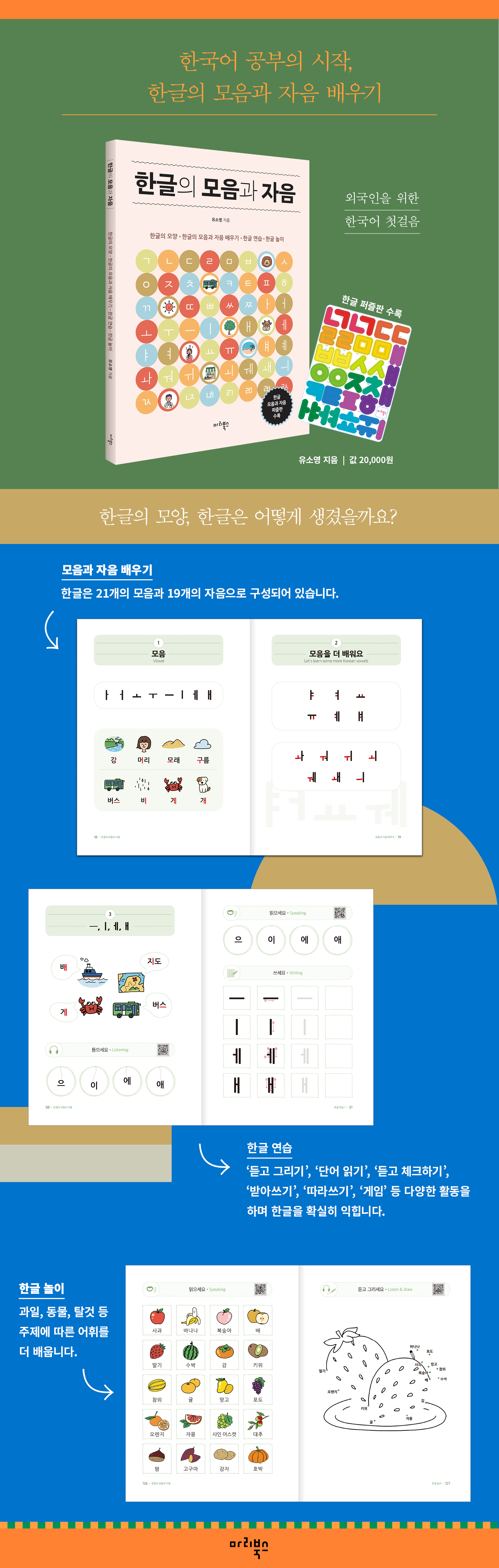 ¡¶ÇѱÛÀÇ ¸ðÀ½°ú ÀÚÀ½¡·Àº Ã¥°ú ºÎ·ÏÀÎ ÇÑ±Û ÆÛÁñÆÇÀ¸·Î ±¸¼ºµÇ¾î ÀÖ´Ù. Ã¥¿¡¼ ¹è¿î ÇѱÛÀÇ ÀÚ¸ð, ±×¸®°í ¾îÈÖ¸¦ ÆÛÁñÆÇÀ¸·Î ¸¸µé¾î º½À¸·Î½á ´õ¿í Àç¹ÌÀÖ°Ô °øºÎÇϰí, ´õ¿í ¿À·¡µµ·Ï ±â¾ïÇÒ ¼ö ÀÖ°Ô Çß´Ù. ÆÛÁñÆÇÀ¸·Î ÇѱÛÀÇ ¸ðÀ½°ú ÀÚÀ½À» ¿ä¸®Á¶¸® ¿òÁ÷¿© ¾îÈÖ¸¦ ¸¸µé¾î º¸¸é¼ ÀÔüÀûÀÎ Çѱ¹¾î °øºÎ¸¦ ÇÒ ¼ö ÀÖ°Ô Çß´Ù.
