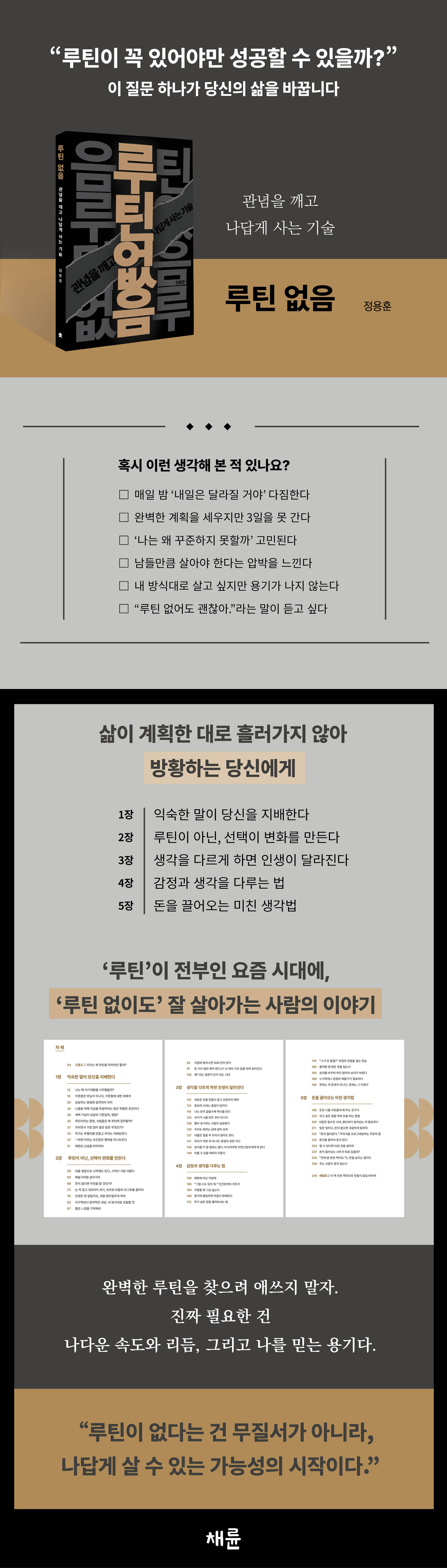 ÀÌ Ã¥À» ¾´ Á¤¿ëÈÆ ÀÛ°¡´Â ¡¶·çƾ ¾øÀ½¡·À» ÅëÇØ, ·çƾÀ» ÁöŰÁö ¸øÇß´Ù¸ç ÀÚÃ¥ÇØ ¿Â »ç¶÷µé¿¡°Ô ÀüÇô ´Ù¸¥ ½Ã¼±À» °Ç³Ù´Ù. ¡®³²µé󷳡¯À̶ó´Â °¹Ú¿¡¼ ¹þ¾î³ª, ¡®³ª´Ù¿î¡¯ ¸®µëÀ» ã´Â °ÍÀ¸·Î »îÀº ÃæºÐÈ÷ ÇູÇÏ°í ´Ü´ÜÇØÁú ¼ö ÀÖ´Ù°í ¸»ÀÌ´Ù.