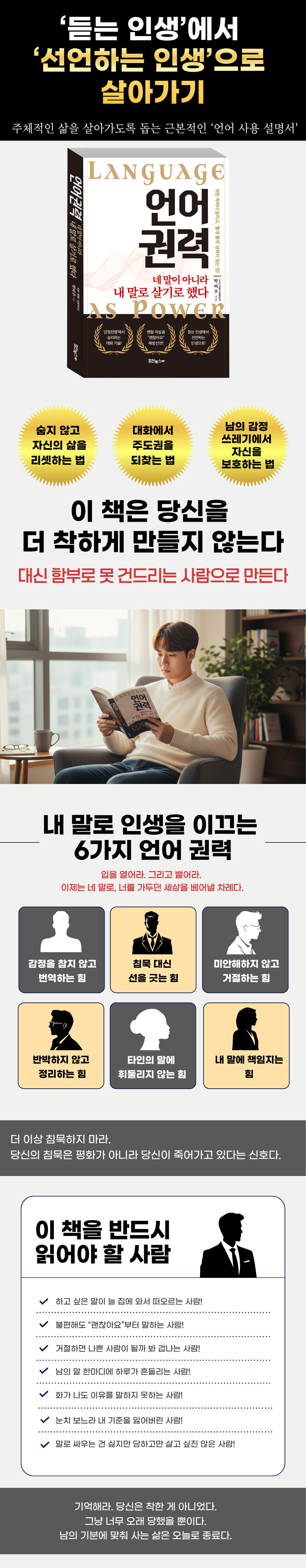 ¡¶¾ð¾î ±Ç·Â¡·Àº ŸÀÎÀÇ ¸»¿¡ ²ø·Á´Ù´Ï´Â ¡®µè´Â Àλý¡¯¿¡¼ ¹þ¾î³ª ÀÚ±âÀÇ ¸»·Î ¡®¼±¾ðÇÏ´Â Àλý¡¯À» »ì¾Æ°¡±â À§ÇÑ ¸ðµç ÁöħÀ» ´ã°í ÀÖ´Ù. ÀÌ Ã¥Àº °¨Á¤À» ¾ï´©¸£´Â ÇàÀ§°¡ ¾ó¸¶³ª ÆÄ±«ÀûÀÎ °á°ú¸¦ ÃÊ·¡ÇÏ´ÂÁö ³ÃöÇÏ°Ô Áø´ÜÇÑ´Ù. ¡®±âºÐ ³ª»Ý¡¯Àº °ø°ÝÀÌ ¾Æ´Ï¶ó ¡®±âÁØÀÇ ½ÅÈ£¡¯À̸ç, À̸¦ ¹«½ÃÇÏ°í »ïŰ´Â °ÍÀº ¸¶À½ÀÇ ½Ã½ºÅÛÀ» °íÀå ³»´Â ÇàÀ§¶ó°í °æ°íÇÑ´Ù. ²Ú ´·¯ ´ãÀº °¨Á¤Àº °á±¹ ¾û¶×ÇÑ °÷¿¡¼ Æø¹ßÇϰųª, ÀÚ½ÅÀ» ÇâÇØ º´µç È»ì·Î µ¹¾Æ¿Í ¿ì¿ï°ú ÀÚ±âÇø¿À·Î À̾îÁø´Ù. ÀÌ Ã¥Àº ºÐ³ë¶ó´Â ¿øÃÊÀûÀÎ °¨Á¤À» ¹®ÀåÀ̶ó´Â Á¤±³ÇÑ ¾ð¾î·Î ¹ø¿ªÇÏ´Â ±â¼ú, Áï ¡°³ª´Â Áö±Ý [»ó´ë¹æÀÇ ÇൿÀ̳ª ¸»] ¶§¹®¿¡ [³ªÀÇ °¨Á¤ »óÅÂ]¸¦ ´À³¤´Ù¡±´Â ¡®³ª-Àü´Þ¹ý¡¯ ±¸Á¶¸¦ ÀÍÇô °¨Á¤À» ³ÃöÇϰí ó¸® °¡´ÉÇÑ µ¥ÀÌÅÍ·Î ¹Ù²Ù¶ó°í Á¦¾ÈÇÑ´Ù. ÀÌ´Â ´õ ÀÌ»ó °¨Á¤ÀÌ ¾ðÁ¦ ÅÍÁúÁö ¸ð¸£´Â ½ÃÇÑÆøÅºÀÌ ¾Æ´Ï¶ó, ³ªÀÇ »óȲÀ» Áø´ÜÇÒ ¼ö ÀÖ´Â ¾ð¾îÀû µµ±¸ÀÓÀ» ¾Ë·ÁÁØ´Ù.