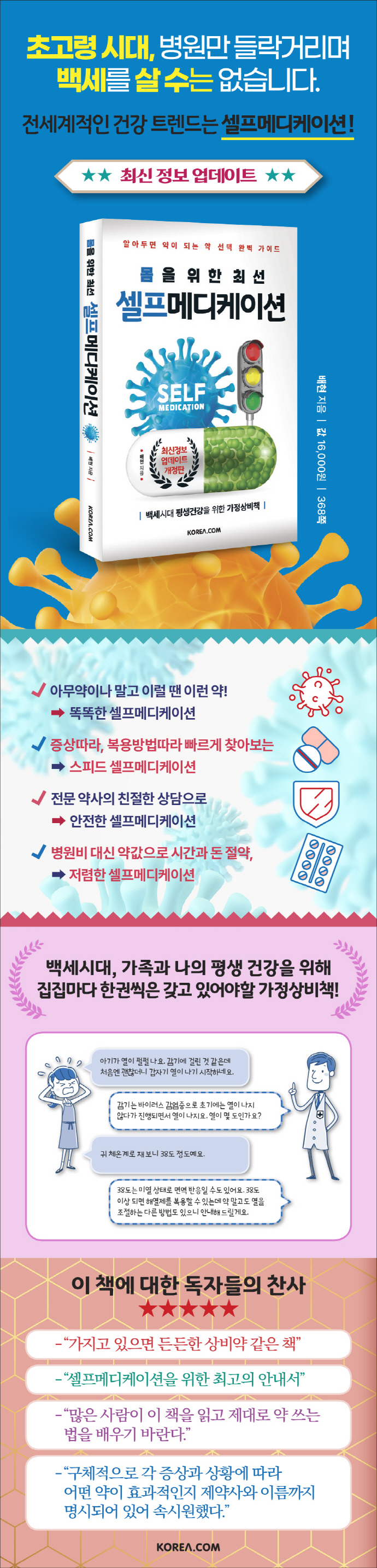 °Ç°À» ÁöŰ´Â ù ¹øÂ° ¹æ¹ýÀ¸·Î Àڱ⠸öÀÇ »óŸ¦ ½º½º·Î ÆÄ¾ÇÇϰí, °¡Àå ÀûÇÕÇÑ ¾àÀ» ã¾Æ ´Ù½º¸®´Â ¡®¼¿ÇÁ¸ÞµðÄÉÀ̼ǡ¯À» Áß¿ä½ÃÇÑ´Ù. ÀÎÅͳݿ¡ ³ÑÃijª´Â À߸øµÈ Á¤º¸¸¦ ¹Ù·Î Àâ°í, ½±°Ô ±¸ÇÏ´Â ¾àÀ» ÅëÇØ Àú·ÅÇϸ鼵µ ¾ÈÀüÇÑ ÀÚ°¡ Ä¡·á ¹æ¹ýÀ» Á¦½ÃÇϱâ À§ÇØ ¡´°æÇâ½Å¹®¡µ¿¡ ¡°¹èÇö ¾à»çÀÇ ¼¿ÇÁ¸ÞµðÄÉÀ̼ǡ±À̶ó´Â Ä®·³À» ¿¬ÀçÇϰí ÀÖ´Ù. Ä®·³ÀÌ Å« µµ¿òÀÌ µÈ´Ù´Â µ¶ÀÚµéÀÇ È£ÀÀ¿¡ ÈûÀÔ¾î °¡Á·ÀÇ °Ç°À» À§ÇÑ »óºñÃ¥ÀÌ µÉ ¼ö ÀÖµµ·Ï ÇÑ ±ÇÀÇ Ã¥À¸·Î ¿«¾î ¡¶¸öÀ» À§ÇÑ ÃÖ¼±, ¼¿ÇÁ¸ÞµðÄÉÀ̼ǡ·À̶õ Á¦¸ñÀ¸·Î Æì³»°Ô µÇ¾ú´Ù. ¾à±¹À» ãÀº ÇÑ »ç¶÷ ÇÑ »ç¶÷°ú ¼ÒÅëÇÏ¸é¼ ÁøÁ¤À» ´ÙÇØ »ó´ãÇÏ´Â ¾à»çÀÇ Áø½ÉÀ» ´ã¾Ò´Ù. °¡Àå ÈçÈ÷ ã´Â µÎÅë¾à, ¼ÒÈÁ¦¿¡¼ºÎÅÍ Æ¯º°ÇÑ Áõ»ó¿¡ ´ëÇÑ ¾à±îÁö ¼¿ÇÁ¸ÞµðÄÉÀ̼ÇÀÌ °¡´ÉÇÑ ¹üÀ§¿Í ÇÔ²² ½º½º·Î°¡ Àڱ⿡°Ô ¸Â´Â ¾àÀ» ¼±ÅÃÇϱ⿡ ÃæºÐÇÑ ¼¼¼¼ÇÑ Á¤º¸¿Í ºñ±³·Î Ä£ÀýÇÏ°Ô »ó´ãÇÑ´Ù.