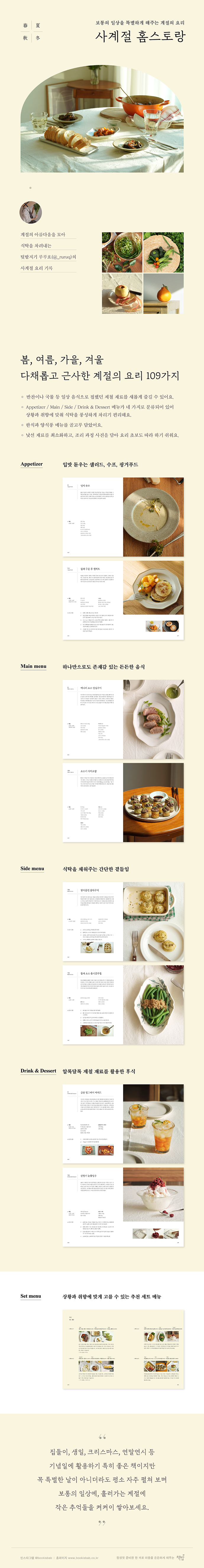 Ȩ½ºÅä¶ûÀÇ ¸Þ´º¸¦ ²Ù¸± ¶§ °èÀýÀÇ ¸ÀÀ» ´õÇϸé Á¶±Ý ´õ Ưº°ÇÑ Ãß¾ïÀ» ¸¸µé ¼ö ÀÖ½À´Ï´Ù. º½¿¡´Â »ê¶æÇÑ º½³ª¹°°ú º½Á¶°³¸¦, ¿©¸§¿¡´Â ¾Ë·Ï´Þ·Ï ¿¸Åä¼Ò¿Í û·®ÇÑ °úÀÏÀ», °¡À»¿¡´Â £Àº dz¹ÌÀÇ »Ñ¸®Ã¤¼Ò¿Í ÇØ»ê¹°À», °Ü¿ï¿¡´Â ¹¬Á÷ÇÑ ÀúÀåä¼Ò¿Í ½ÃÆ®·¯½º °úÀÏÀ» Ȱ¿ëÇÏ´Â ½ÄÀ¸·Î¿ä. ¡´»ç°èÀý Ȩ½ºÅä¶û¡µÀº ÀÌ·¯ÇÑ ±â»ÝÀ» ´©¸± ¼ö ÀÖ°Ô µµ¿ÍÁÖ´Â ¿ä¸®Ã¥ÀÔ´Ï´Ù. Çѽİú ¾ç½Ä ±¸ºÐ ¾øÀÌ ´Ùä·Î¿î °èÀýÀÇ ¿ä¸®°¡ ¹«·Á 109°¡Áö ¼Ò°³µÇ¾î ÀÖÀ¸¸ç, ¸Þ´º°¡ Appetizer / Main / Side / Drink & Dessert·Î ºÐ·ùµÇ¾î ÀÖ¾î »óȲ°ú ÃëÇâ¿¡ ¸Â°Ô Ȱ¿ëÇϱâ ÁÁ½À´Ï´Ù. ²À Ưº°ÇÑ ³¯ÀÌ ¾Æ´Ï´õ¶óµµ Æò¼Ò ÀÌ Ã¥À» ÀÚÁÖ ÆîÃÄ º»´Ù¸é º¸ÅëÀÇ ÀÏ»ó¿¡, Èê·¯°¡´Â °èÀý¿¡ ¼Ò¼ÒÇÑ Ãß¾ïµéÀÌ ÄÑÄÑÀÌ ½×ÀÏ °Å¿¹¿ä.