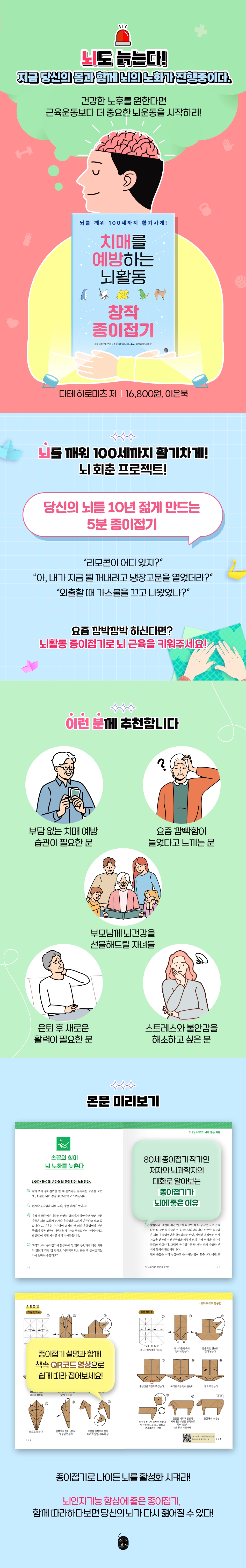 °í·ÉȰ¡ ºü¸£°Ô ÁøÇàµÇ¸é¼ ¡®Ä¡¸Å ¿¹¹æ¡¯Àº ´õ ÀÌ»ó Æ¯Á¤ÃþÀÇ °úÁ¦°¡ ¾Æ´Ï´Ù. ±â¾ï·Â°ú ÁýÁß·ÂÀº »ýȰ ¼Ó Àڱؿ¡ µû¶ó ´Þ¶óÁö´Âµ¥, ¹«¾ùº¸´Ù Áß¿äÇÑ °ÍÀº ¡°²ÙÁØÈ÷ ÇÒ ¼ö ÀÖ´Â ·çƾ¡±ÀÌ´Ù. ÀÌ Ã¥Àº Á¾ÀÌÁ¢±â¸¦ ´Ü¼øÇÑ Ãë¹Ì°¡ ¾Æ´Ï¶ó ¼Õ³¡¡¤½Ã°¢¡¤±â¾ï¡¤»ó»ó·ÂÀ» µ¿½Ã¿¡ ¾²´Â ¡®º¹ÇÕÀûÀÎ ³úȰµ¿¡¯À¸·Î º¸°í, ´©±¸³ª Àϻ󿡼 ½ÇõÇÒ ¼ö ÀÖµµ·Ï ¼³°èÇß´Ù. ¿©±â¿¡ ³ú°úÇÐÀÚ ´Ï½Ã ŸÄÉÀ¯Å°ÀÇ °¨¼ö°¡ ´õÇØÁ®, Á¾ÀÌÁ¢±âÀÇ È¿°ú¸¦ ³ú ±â´É °üÁ¡¿¡¼ ÀÌÇØÇϱ⠽±°Ô Ç®¾î³Â´Ù.