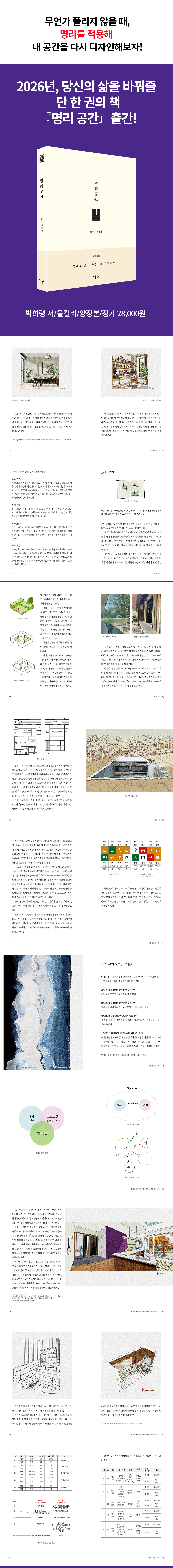 ¸í¸®ÇÐÀº ÀÚ¿¬ÀÇ ¡®½Ã°£(Àý±â)¡¯À» ¹ÙÅÁÀ¸·Î Àΰ£ÀÌ Çàµ¿ÇØ¾ß ÇÒ ¡®½Ã±â¡¯¸¦ ÆÄ¾ÇÇϰíÀÚ Çß´ø Çй®ÀÌ´Ù. ÈçÈ÷ ¸»ÇÏ´Â ¡®»çÁÖÆÈÀÚ¡¯´Â ³× °³ÀÇ ±âµÕ(ÞÌñº)°ú ±âµÕ¸¶´Ù µé¾î Àִ õ°£(ô¸ÊÎ)°ú ÁöÁö(ò¢ò¨)¿¡ ÇØ´çÇÏ´Â µÎ ±ÛÀÚ¸¦ ÃÑĪÇÏ´Â ¸»ÀÌ´Ù. ´Ù½Ã ¸»ÇØ ±âµÕ¸¶´Ù µÎ ±ÛÀÚ¾¿ µé¾î ÀÖÀ¸´Ï±î ¡®4X2=8¡¯, ±×·¡¼ ¡®»çÁÖÆÈÀÚ¡¯ÀÎ °ÍÀÌ´Ù. ¿©±â¼ ±âµÕÀº ÅÂ¾î³ ¿¬¿ùÀϽÿ¡ ÇØ´çÇÏ´Â ¡®½Ã°£¡¯À» ¶æÇÑ´Ù. P. 18 °ø°£À» ¼³°èÇϰųª µðÀÚÀÎÇÒ ¶§ ¾î¶² °ø°£ÀÌ ½ÃÀÛ °ø°£ÀÎÁö »ý°¢ÇØ º¸¸é Á» ´õ ½±°Ô ¸ñÀÇ °ø°£¿¡ Á¢±ÙÇÒ ¼ö ÀÖ´Ù. ¿¹ÄÁ´ë Àþ°í »õ·Î¿î °ø°£Àº ´©±¸¸¦ À§ÇÑ °ÍÀ̰í, ¼ºÀåÇÏ´Â °ø°£Àº ´©±¸¸¦ À§ÇÑ °ÍÀÎÁö µûÁ®º¸´Â °ÍÀÌ´Ù. ÀÌó·³ ¸ñÀÇ ¿ÀÇà Æ¯¼ºÀ» ±×´ë·Î °ø°£ ÄܼÁÆ®¿¡ Á¢¸ñÇØ º¸¸é ¸í¸® °ø°£Àû ÇØ¼®ÀÌ °¡´ÉÇÏ´Ù. P. 25 ÈÀÇ °ø°£Àº ¿Á¤°ú Ȱ±â, âÁ¶¼ºÀ» °Á¶ÇÒ ¶§ Áß¿äÇÑ ¿ªÇÒÀ» ÇÒ¼ö ÀÖ´Ù. ÀûÀýÈ÷ Ȱ¿ëÇÏ¸é °ÇÃà °ø°£À» Ȱ±âÂù ȯ°æÀ¸·Î ¹Ù²ãÁÖ°í, âÁ¶Àû ºÐÀ§±â¸¦ Á¶¼ºÇØÁØ´Ù. »ç¶÷µéÀÇ ¿Á¤°ú âÀÇ·ÂÀ» ÀÚ±ØÇϱ⠶§¹®ÀÌ´Ù. P. 47 ¸í¸®Çп¡¼ ¹°»ó¿¡ ´ëÀÔÇØ ¿ÀÇàÀ» ÀÌÇØÇϵíÀÌ °ø°£µµ ¿ÀÇàÀûÀ¸·Î ÇØ¼®ÇÒ ¼ö ÀÖ´Ù. ½Ã°ø°£À» ´Ù·ç´Â °ÇÃà¿¡¼ ½Ã°¢ÀûÀ¸·Î µå·¯³ª´Â °ÍÀº ¹Ù·Î °ø°£ÀÌ´Ù. ¸í¸®ÇÐÀÇ ¿ÀÇàÀû ÇØ¼®À¸·Î °ø°£À» ÆÄ¾ÇÇÏ´Â ÀÏÀÌ °¡´ÉÇÑ ÀÌÀ¯°¡ ¿©±â¿¡ ÀÖ´Ù. ±×µ¿¾È °ÇÃà°¡ÀÌÀÚ °ø°£ µðÀÚÀ̳ʷΠÀÏÇØ¿À¸é¼ °ø°£À» ¿ÀÇàÀ¸·Î ºÐ¼®ÇØ µðÀÚÀÎÇÏ´Â ÀÏÀº ±×´ÙÁö ¾î·ÆÁö ¾Ê´Ù´Â °ÍÀ» ¸ö¼Ò üÇèÇß´Ù. ½±°Ô ¸»ÇØ °ÇÃà°¡´Â °ø°£À» ¼³°èÇÒ ¶§ ¸ÕÀú °³³äÀ» ¸¸µé¾î ³õ´Âµ¥, À̶§ °¢ ¿ÀÇàÀÇ ¹°»ó ¶Ç´Â À̹ÌÁö¸¦ °³³äÈÇÏ¿© °ø°£À» µðÀÚÀÎÇÒ ¼ö ÀÖ´Ù. P. 65 Åä´Â »çÀÌÀÌ¸ç ¸¶µð¸¦ ¸¸µç´Ù. ´ë³ª¹«ÀÇ ¸¶µð¿Í °°´Ù. Àá½Ã ¸Ó¹°°Ô ÇÏ´Â ÈûÀÌ´Ù. ¸ØÃß±â, Áß°³(ÁßÀç)Çϱâ. Åä°¡ ¾àÇÑ »ç¶÷Àº ¿ÏÃæ ÀÛ¿ëÀÌ ¾ø¾î µèÀÚ¸¶ÀÚ ¹Ù·Î ¸»ÇÑ´Ù. Åä°¡ ¸¹À¸¸é ¿©À¯°¡ ÀÖ°í, Åä°¡ ¾àÇϸé Á¶±ÞÇÏ´Ï ½ÉÈ£ÈíÀ» ÇØ¼ ¿©À¯¸¦ °¡Á®¾ß ÇÑ´Ù. ¸»ÇÒ ¶§µµ Áß°£¿¡ ½¬¾î°¡¸ç °è¼ÓÇØ¾ß ÇÑ´Ù. Ç×»ó ¿©À¯·Ó°í Â÷ºÐÇÏ°Ô Çàµ¿ÇØ¾ß ÇÑ´Ù. Åä°¡ ¸¹Àºµ¥µµ Á¶±ÞÇϸé Ȱ¡ ¾ø±â ¶§¹®ÀÌ´Ï ¾à°£ÀÇ È±â°¡ ÀÖ¾î¾ß ÇÑ´Ù. P. 98 ±ÝÀº Á¤¸®ÇÏ´Â Èû, ¼öÃàÇÏ´Â ÈûÀÌ¾î¼ ºÒÇÊ¿äÇß´ø °ÍÀÌ ¶³¾îÁ® ³ª°¡°í ¾Ë°»À̸¸ ³²´Â´Ù. ±ÝÀÇ Æ¯¼ºÀº ºÐº°·ÂÀε¥ ¡®È±Ø±Ý¡¯ÀÌ µÇ¾î¾ß ¹ßÈÖÇÒ ¼ö ÀÖ´Ù. ±Ý ¿ÀÇàÀ» Àß ¾²¸é È¿À²¼ºÀÌ ÁÁ´Ù. ±ÝÀÌ ºÎÁ·ÇÏ¸é »ý°¢ÀÌ ¶°¿Ã¶óµµ Á¤¸®µÇÁö ¾ÊÀ¸´Ï ±Û¾²±â°¡ µµ¿òÀÌ µÈ´Ù. ³»Àû Ȱµ¿ÀÌ ÁÁÀ¸¸ç ¼ö±â¿î°ú È ±â¿îÀÇ µµ¿òÀÌ ÇÊ¿äÇÏ´Ù. ÈÞ½ÄÀº ¼ö ±â¿îÀ» º¸ÃæÇØÁÖ´Ï ¶§·Î´Â ½¬´Â °Íµµ ÁÁÀº ¹æ¹ýÀÌ´Ù. P. 121 ¼ö´Â ¿ÏÀüÈ÷ ¸ØÃß°Ô ÇØ ¸ðµç °ÍÀ» Á¤Áö½ÃŲ´Ù. Á×À½À̰í ÀáÀÌ´Ù. ÇÑÆíÀ¸·Î ÁöÇý³ª À¯¿¬ÇÔÀ» ÀǹÌÇϱ⵵ ÇÑ´Ù. ¼ö°¡ ºÎÁ·ÇÏ¸é ¼ö¸éÀÇ ÁúÀÌ ÁÁÁö ¾Ê´Ù. ÃæºÐÈ÷ ÀÚµµ ȸº¹µÇÁö ¾Ê´Â´Ù. ¼ö°¡ ºÎÁ·ÇÏ¸é ¸í»óÀ» Çϰųª ¸ÛÇÏ´Ï ½Ã°£À» º¸³»°Å³ª Â÷ºÐÇÑ À½¾Ç(¶Ç´Â ½ÌÀ׺¼ ¼Ò¸®, ¹°¼Ò¸®, ºø¼Ò¸®, ÈÀÌÆ® ³ëÀÌÁî µî)À» µè´Â °ÍÀÌ µµ¿òÀÌ µÈ´Ù. ¼ö´Â ³ú¸¦ ½¬°Ô ÇÑ´Ù. Ãë¹Ì·Î ¼¿¹, ͏®±×·¡ÇǸ¦ ¹è¿ì´Â °Íµµ ÁÁ´Ù. P. 150 ÃâÆÇ»ç ¼Æò¿ÀÇàÀ¸·Î Àд °ø°£ÀÇ ºñ¹Ð