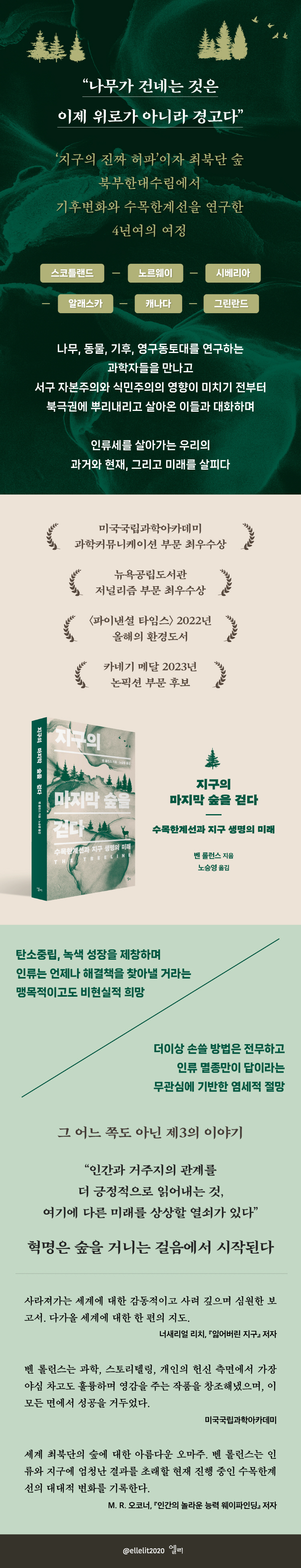 ¡ºÁö±¸ÀÇ ¸¶Áö¸· ½£À» °È´Ù¡»´Â ±âÈĺ¯È ´ëÀÀÀÇ ´çÀ§¼ºÀ» Àü¸é¿¡ ³»¼¼¿ì±âº¸´Ù ±âÈĺ¯È·Î ÀÎÇÑ ¸ð¼øµÈ ÀÚ¿¬ Çö»ó(½£ ¿µ¿ªÀÇ È®Àå)°ú ±×¿¡ µû¸¥ °á°ú(Áö±¸¿Â³È °¡¼ÓÈ¿Í ¿µ±¸µ¿Åä´ë¿¡ ÀúÀåµÈ ¸Þź°¡½º ¹èÃâ·® ±ÞÁõ)¸¦ ÀÖ´Â ±×´ë·Î ±â·ÏÇÑ´Ù. ÀÌ¿¡ ´ëÀÀÇÏ·Á »ç½¿À» Á×ÀÌ°í ³ª¹«¸¦ º£¾î¾ß ÇÏ´Â ¡®¾î·Á¿î¡¯ ¼±ÅÃÁöµé ¶ÇÇÑ ³íÇÑ´Ù. Àΰ£ÀÌ ÀÚ¿¬À» ¸ÁÃÆ´Ù´Â ¼ÓÁË, ȤÀº ¿ì¸®´Â ±âÈĺ¯ÈÀÇ ÇÇÇØÀÚ¶ó´Â ´ÜÀÏÇϸ鼵µ ´Ü¼øÇÑ Á¤Ã¼È¸¦ ³Ñ¾î, ¡°½£ÀÌ ¿©´À »ý¸í°ú ¸¶Âù°¡Áö·Î °ø»ý°èÀÌÀÚ ¿ªµ¿Àû °úÁ¤ÀÌ¸ç »ç¹°À̳ª º°°³ Á¸ÀçµéÀÇ ÁýÇÕÀÌ ¾Æ´Ï¡±µí Àΰ£Àº ½£°ú °øÍìÁøÈÇÑ (½£ÀÇ) »ý¸íüÀÓÀ» °Á¶ÇÑ´Ù. ³ª¾Æ°¡, º¯ÈÇϴ ȯ°æÀÇ ½Ç»óÀ» ´©±¸º¸´Ù ¿À·¡ °ÞÀº ¼ö¸ñÇѰ輱¿¡¼ »ì¾Æ°¡´Â »ç¶÷µéÀÇ ¿ª»ç¿¡¼ ´ë¾ÈÀ» ã°í ¹Ì·¡¸¦ »ó»óÇÒ ¿¼è¸¦ Á¦½ÃÇÑ´Ù.