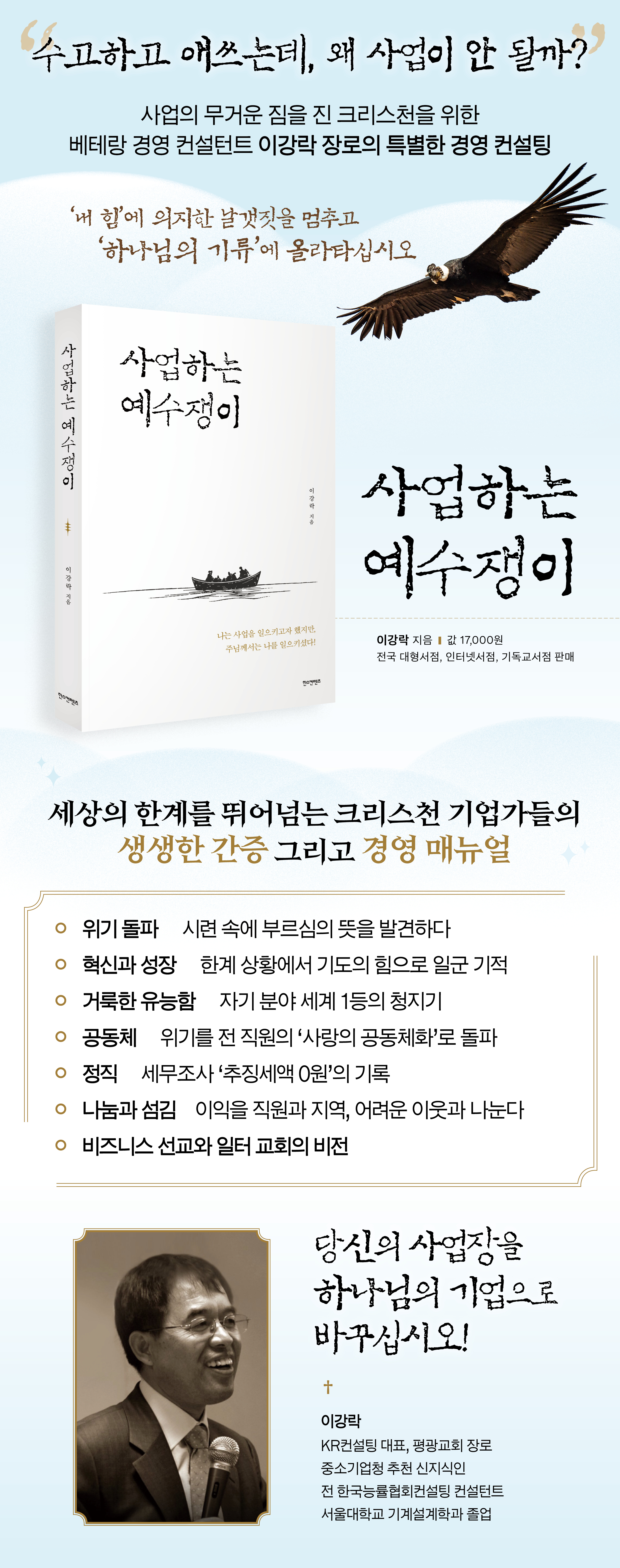 °æ¿µ ÄÁ¼³ÅÏÆ®·Î¼ ±¹³»¿Ü ¼ö¸¹Àº ±â¾÷ÀÇ °æ¿µ Çõ½ÅÀ» À̲ø¾î¿Â KRÄÁ¼³ÆÃ À̰¶ô ´ëÇ¥°¡ Å©¸®½ºÃµ °æ¿µÀÚµéÀ» À§ÇÑ ½Å¾Ó°ú °æ¿µÀÇ ÅëÇÕ Áöħ¼ ¡º»ç¾÷ÇÏ´Â ¿¹¼öÀïÀÌ¡»(ÇѽºÄÁÅÙÃ÷)¸¦ Ãâ°£Çß´Ù. ÀÌ Ã¥Àº ¡®¿¹¼öÀïÀÌ¡¯°¡ »ç¾÷Çϱâ ô¹ÚÇÑ ¼¼»ó¿¡¼, »ç¾÷°¡¿Í °æ¿µÀڷμ °í³ú¿Í ¿Ü·Î¿ò, µÎ·Á¿ò°ú À§±â, °í´ÞÇ ½Ã·ÃÀ» ±Øº¹ÇÏ°í °Å·èÇÑ °æ¿µÀ¸·Î ³ª¾Æ°¡´Â ±æÀ» ¸ð»öÇϰí ÀÖ´Ù. ¶ÇÇÑ, ¾î¶»°Ô ½Å¾ÓÀÇ ¿øÄ¢À» ÁöŰ¸ç ¼º°øÀûÀÎ °æ¿µÀ» ÇÒ ¼ö ÀÖ´ÂÁö¿¡ ´ëÇÑ ½ÇõÀû ÇØ¹ýÀ» ´ã°í ÀÖ´Ù.