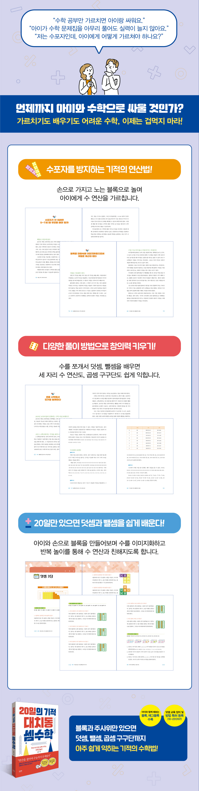¡¶20ÀÏÀÇ ±âÀû ´ëÄ¡µ¿ ¼À¼öÇС·Àº 10´Ü ºí·Ï¼À¿¡ ´ëÇØ Å©°Ô 2ºÎ·Î ³ª´²¼ ¼Ò°³ÇÏ°í ±× ¹æ¹ýÀ» ¼³¸íÇÑ´Ù. 1ºÎ¿¡¼´Â ¿Ö ¼öÇÐ °øºÎ¸¦ ½ÃÄÑ¾ß Çϰí, ¾î¶»°Ô ÇØ¾ß ¾ÆÀ̵éÀÌ ¼öÇÐ °øºÎ¸¦ Àç¹Õ°Ô ÇÒ ¼ö ÀÖ´ÂÁö¸¦ ´ã¾Ò´Ù. ¶ÇÇÑ ºí·Ï ³îÀ̰¡ ÁÖ´Â È¿°ú¸¦ ¼³¸íÇÏ¸é¼ ºí·ÏÀ¸·Î ¼öÇÐÀ» ¹è¿ì´Â ºí·Ï¼ÀÀÇ ÀåÁ¡À» ¼³¸íÇÑ´Ù. ±×¸®°í ¼ö¸®»ùÀÇ 10´Ü ºí·Ï¼À ¿¬»êÀ» ÅëÇØ ¼öÇÐ ÇнÀ¿¡¼ Å« ¼º°ú¸¦ ³½ ¾ÆÀ̵éÀÇ »ç·Ê¸¦ ¼Ò°³Çß´Ù.
