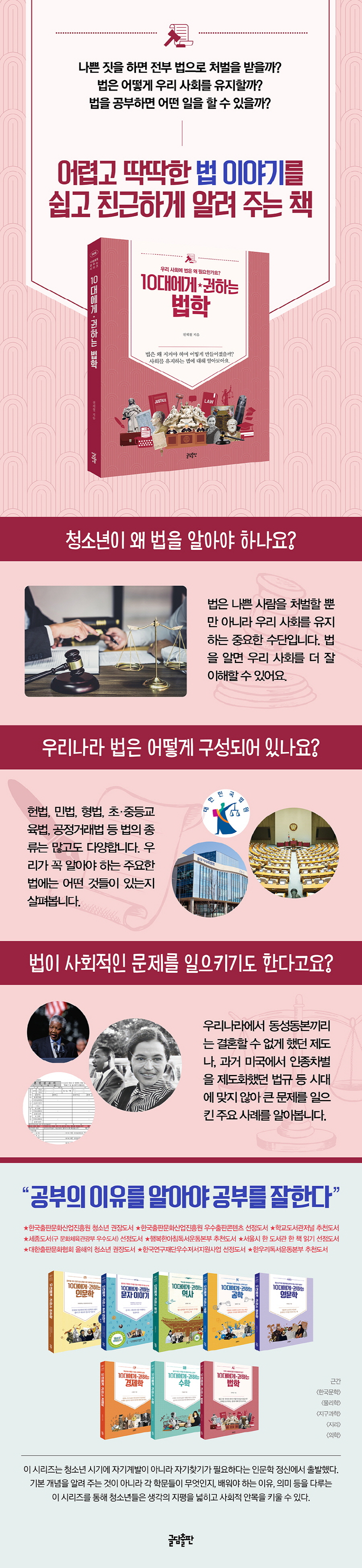 û¼Ò³âÀ» À§ÇÑ Àι®ÇÐ ±³¾ç¼ ¡´10´ë¿¡°Ô ±ÇÇÏ´Â ½Ã¸®ÁÀÇ 8±Ç. ºÎ»ê±³À°´ëÇб³ »çȸ±³À°°ú ÀüÁ¦Ã¶ ±³¼ö°¡ û¼Ò³âÀÇ ´«³ôÀÌ¿¡¼ ¹ýÀ̶õ ¹«¾ùÀ̰í, Àü¹®°¡°¡ ¾Æ´Ñ û¼Ò³âµµ ¿Ö ¹ýÀ» ¾Ë¾Æ¾ß ÇÏ´ÂÁö ¼Ò°³ÇÑ´Ù. ¹ýÀº ÆÇ»ç³ª °Ë»ç, º¯È£»çó·³ Àü¹®°¡µé¸¸ ¾Æ´Â ¾î·Á¿î Áö½Äó·³ ´À²¸ÁöÁö¸¸, ½Ã¹ÎÀ̶ó¸é ¸ðµÎ°¡ ¾Ë°í ÀÖ¾î¾ß ÇÏ´Â Áö½ÄÀÌ´Ù. ¡¶10´ë¿¡°Ô ±ÇÇÏ´Â ¹ýÇС·Àº °¡Á¤°ú Çб³, Áö¿ª»çȸ, ´õ ³ª¾Æ°¡ ±¹°¡±îÁö ¿ì¸®°¡ ¼ÓÇØ ÀÖ´Â »çȸÀÇ ¸ðµç ¿µ¿ªÀÌ ¹ý¿¡ ÀÇÇØ ±ÔÀ²µÇ°í ÀÖ´Ù´Â »ç½ÇÀ» ¾Ë·ÁÁØ´Ù.