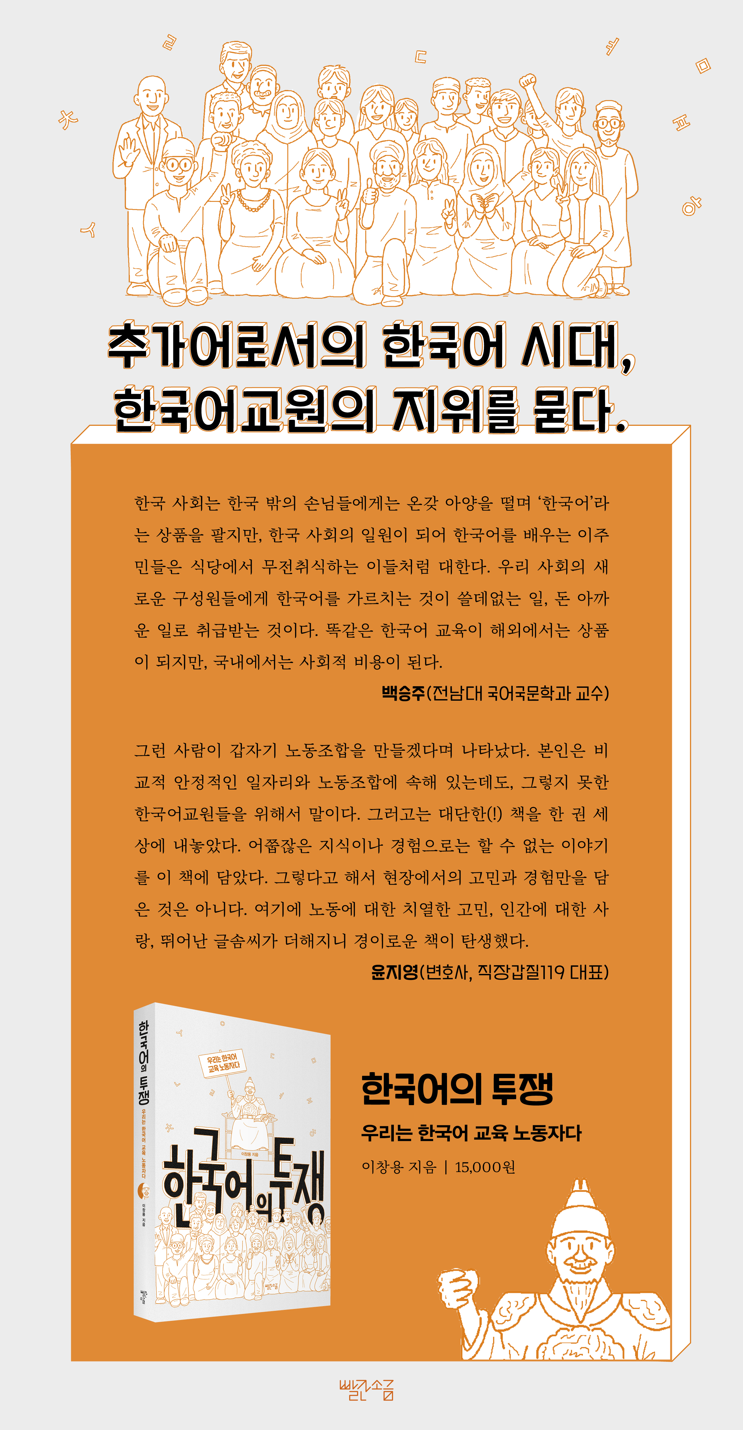 À̵鿡°Ô Çѱ¹¾î¸¦ °¡¸£Ä¡´Â »ç¶÷µéÀÌ ¹Ù·Î Çѱ¹¾î±³¿øÀÌ´Ù. ±¹³»¿¡¼¸¸ 7,000¿© ¸íÀÌ È°µ¿ÇÑ´Ù. ¾îÇдçÀ» ºñ·ÔÇØ ÃÊÁßµîÇб³, °¡Á·¼¾ÅÍ, »çȸÅëÇÕÇÁ·Î±×·¥, ¿Ü±¹Àγ뵿ÀÚÁö¿ø¼¾ÅÍ¿¡¼ °¡¸£Ä¡´Ï »ç¿ëÀÚ´Â ´ëÇаú Á¤ºÎ´Ù. ÇÏÁö¸¸ Çö½ÇÀÌ ¿¾ÇÇÏ´Ù. Çϳª°°ÀÌ 1³â ¹Ì¸¸ °è¾à, ÁÖ 15½Ã°£ ¹Ì¸¸ ¼ö¾÷ÀÌ´Ù. »ç¿ëÀÚ´Â ¼ö¾÷ ½Ã°£¸¸ µûÁ® Ãʴܽð£³ëµ¿ÀÚ¶ó°í ÁÖÀåÇÑ´Ù. 4´ë º¸Çèµµ ÅðÁ÷±Ýµµ ¾øÀÌ µÎ¼¼ °÷À» ¿À°¡¸ç ¼ö¾÷ÇÏÁö¸¸ Æò±Õ ¿¬ºÀÀÌ 1,357¸¸ ¿øÀÌ´Ù. ´Ùµé ºÒÀÌÀÍÀÌ µÎ·Á¿ö ³ëµ¿Á¶ÇÕÀº ¾öµÎµµ ¸ø ³½´Ù. ´ëÇгëÁ¶´Â ÁÁÁö¸¸, ÇѰ谡 ÀÖ´Ù. ÀÌ Ã¥Àº »ç¿ëÀÚÀÇ ÁöÈÖ¡¤°¨µ¶ ¾Æ·¡ ¼ö¾÷ÇÏ´Â ³ëµ¿ÀÚÀÓ¿¡µµ ÇÁ¸®·£¼·Î ¡®À߸ø ºÐ·ùµÈ¡¯ Çѱ¹¾î±³¿øµéÀÌ ÀÚ½ÅÀÇ ÁöÀ§¸¦ Á¦ÀÚ¸®·Î µ¹·Á³õ±â À§ÇØ ³ëµ¿Á¶ÇÕÀ» ¸¸µé¾î ½Î¿ì´Â À̾߱â´Ù.