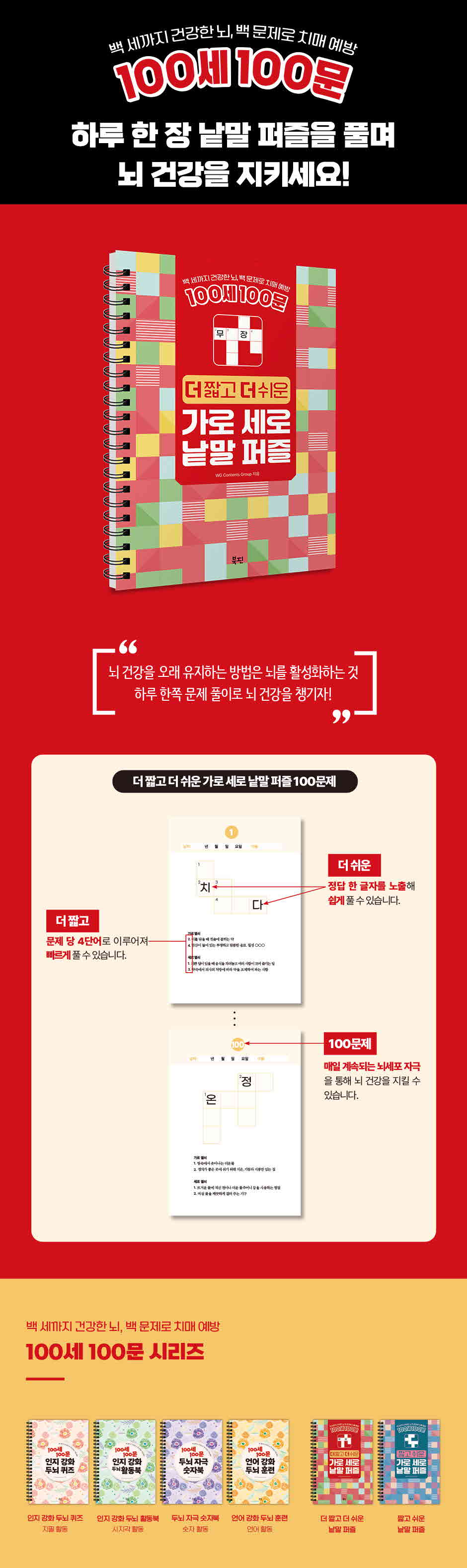 ¾î¸£½Å ¼¼´ë¿¡ Àͼ÷ÇÑ ÆÛÁñÀÎ °¡·Î ¼¼·Î ³¹¸» ÆÛÁñÀ» Ç®¸é¼ ³ú °Ç°À» ÁöŰ°í ¾ð¾î ÀÎÁö ´É·ÂÀ» °ÈÇÒ ¼ö ÀÖ´Â 100¹®Á¦·Î ±¸¼ºÇÑ ÆÛÁñ Ã¥ÀÌ´Ù. ¾î¸£½ÅµéÀÇ ÀÎÁö ´É·Â ¼öÁØÀÌ Àú¸¶´Ù ´Ù¸¥ Á¡À» °í·ÁÇÏ¿© 4~5°³ÀÇ Âª°í ½¬¿î ´Ü¾î·Î ±¸¼ºµÈ ¹®Á¦¿Í ÇѵΠ±ÛÀÚÀÇ Á¤´ä ³ëÃâÀ» Ãß°¡ÇÏ¿´´Ù. ±ä ½Ã°£ ÁýÁß·ÂÀ» ¿ä±¸ÇÏÁö ¾Ê¾Æ ÇǷΰ¨Àº ÁÙÀÌ°í ¼ºÃë°¨À» ³ôÀÏ ¼ö ÀÖ´Ù. ½Ã´Ï¾îÀÇ ´«³ôÀÌ¿¡ ¸Â´Â ´Ü¾îµéÀ» ¼±º°ÇÏ¿´À¸¸ç, Å« ±Û¾¾¿Í ³ÐÀº ºóÄ, ´Ü¾î¸¦ ¶°¿Ã¸®°Ô µµ¿ÍÁÖ´Â ÈùÆ® µîÀ» Á¦°øÇÑ´Ù.