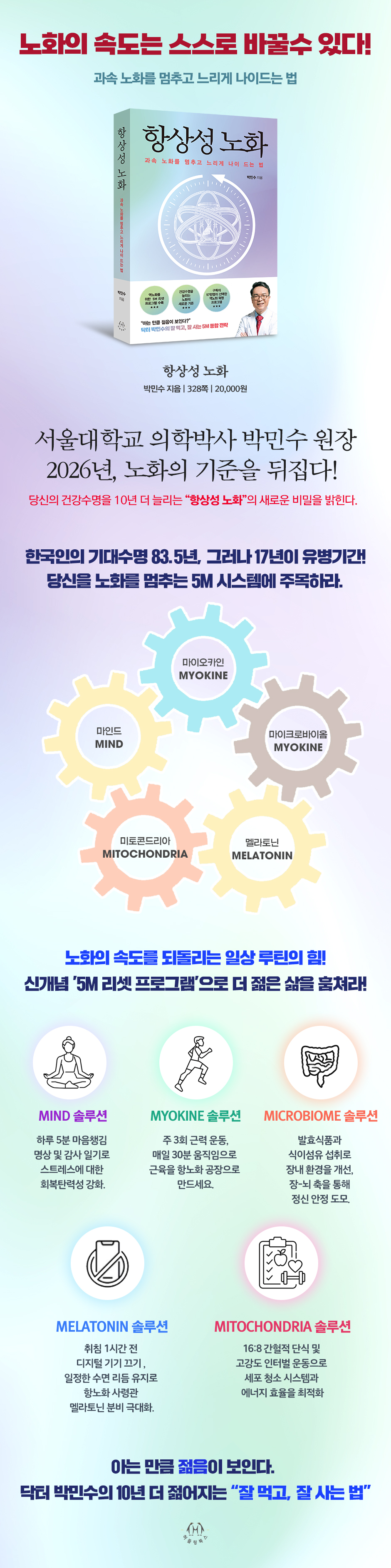 ±× ÇØ¹ýÀ¸·Î Á¦½ÃÇÏ´Â °ÍÀÌ ¡®5M ½Ã½ºÅÛ¡¯ÀÌ´Ù. ¸¶À½(Mind), ±ÙÀ°¿¡¼ ºÐºñµÇ´Â ¸¶ÀÌ¿ÀÄ«ÀÎ(Myokine), Àå³» ¹Ì»ý¹° »ýŰèÀÎ ¸¶ÀÌÅ©·Î¹ÙÀÌ¿È(Microbiome), ¼ö¸é È£¸£¸ó ¸á¶óÅä´Ñ(Melatonin), ¼¼Æ÷ ¹ßÀü¼Ò ¹ÌÅäÄܵ帮¾Æ(Mitochondria)ÀÇ ´Ù¼¸ ÃàÀ» ÇϳªÀÇ ³×Æ®¿öÅ©·Î ¹¾î ÅëÇÕ °ü¸®ÇÏ´Â Àü·«ÀÌ´Ù. ÀÌ ´Ù¼¸ ÃàÀÌ Åé´Ï¹ÙÄûó·³ ¸Â¹°·Á µ¹¾Æ°¥ ¶§ ºñ·Î¼Ò ³ëÈÀÇ ¼Óµµ¸¦ ´ÊÃß°í, ³ª¾Æ°¡ µÇµ¹¸®´Â ¿ª³ëÈÀÇ °¡´É¼ºÀÌ ¿¸°´Ù°í °Á¶ÇÑ´Ù.