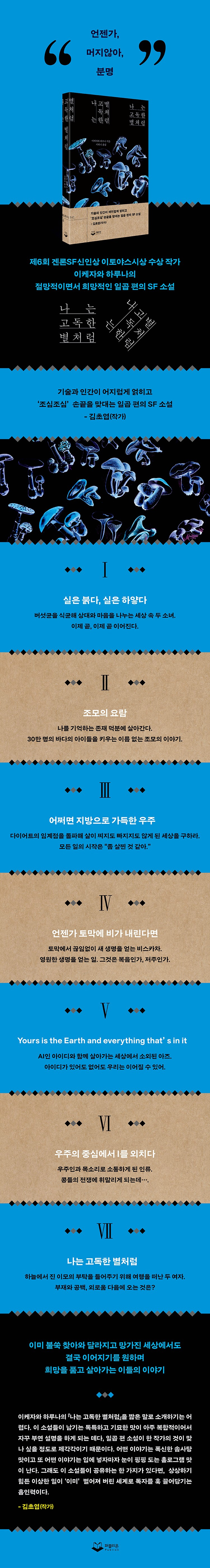 ¾î¸° ½ÃÀý ¾î·ÅDzÀÌ ±×·Áº¸´Â ¾î¸¥ÀÌ µÇ¾úÀ» ¶§ÀÇ ¹Ì·¡. ±×°Íó·³ ¿ì¸®´Â Á¾Á¾ ¾ÆÁ÷ ¿ÀÁö ¾ÊÀº ÇÏÁö¸¸ ¾ðÁ¨°¡ ºÐ¸íÈ÷ ´Ù°¡¿Ã ¹Ì·¡¿¡ ´ëÇØ »ó»óÇϰï ÇÑ´Ù. ÀÌ Ã¥ ¡º³ª´Â °íµ¶ÇÑ º°Ã³·³¡»Àº ÀϺ»SFÀÛ°¡Å¬·´ ȸÀåÀ» Áö³½ ¼º¿ìÀÌÀÚ ÀÛ°¡ ÀÌÄÉÀÚ¿Í ÇϷ糪ÀÇ Ã¹ SF ¼Ò¼³ÁýÀ¸·Î, ÀÌ¹Ì Ã£¾Æ¿Â Àú¸¶´Ù ´Ù¸¥ »ó»ó ¼Ó Àϰö °¡Áö ¼¼»óÀ¸·Î ¿ì¸®¸¦ ¼ø°£À̵¿½ÃŲ´Ù. Á¦6ȸ °Õ·ÐSF½ÅÀλó ÀÌÅä¾ß½º½Ã»óÀ» ¹ÞÀº Ç¥Á¦ÀÛ ¡¸³ª´Â °íµ¶ÇÑ º°Ã³·³¡¹¿¡¼´Â ¸ê¸ÁÇØ°¡´Â ÄݷδϿ¡¼ ¼¼»óÀ» ¶°³ À̸𸦠Ã߸ðÇÏ´Â ¿©ÇàÀ» ¶°³ª´Â µÎ ¿©¼ºÀ» ÅëÇØ Á×À½°ú »ó½Ç, ³²°ÜÁø À̵éÀÇ Èñ¸Á¿¡ °üÇØ À̾߱âÇϸç, ¡¸½ÇÀº ºÓ´Ù, ½ÇÀº ÇϾé´Ù¡¹¿¡¼´Â ¹ö¼¸±ÕÀ» ¸ö¿¡ ½É¾î »ó´ëÀÇ ¸¶À½À» Àд °ø°¨¿¡ ´ëÇÑ ±â´ë¿Í °øÆ÷, »ç¶û µîÀÌ »çÃá±â ½ÃÀýÀÇ µÎ ¼Ò³àÀÇ ´«À¸·Î ¼¶¼¼ÇÏ°Ô ÆîÃÄÁø´Ù. ¡¸Á¶¸ðÀÇ ¿ä¶÷¡¹Àº ¹Ù´Ù¿¡ ¶° ÀÖ´Â °Å´ëÇÑ ÇØÆÄ¸® ¸ð¾çÀÇ ³²ÀÚÀÏ ¼öµµ ¿©ÀÚÀÏ ¼öµµ ÀÖ´Â ¸ðÈ£ÇÑ ¼ºº°ÀÇ ¡®Á¶¸ð¡¯¶ó´Â Á¸À縦 ÅëÇØ »î°ú Á×À½À» ºñ·ÔÇØ Á¨´õ, Ãâ»ê, À°¾Æ µî¿¡ ´ëÇØ ´Ù½Ã »ý°¢Çغ¼ ¼ö ÀÖ°Ô ÇÑ´Ù. ¶ÇÇÑ ¡¸¾î¼¸é Áö¹æÀ¸·Î °¡µæÇÑ ¿ìÁÖ¡¹¿Í ¡¸¿ìÁÖÀÇ Á߽ɿ¡¼ I¸¦ ¿ÜÄ¡´Ù¡¹´Â ´ÙÀÌ¾îÆ®¸¦ ÁÖÁ¦·Î µÎ ÆíÀÇ À̾߱Ⱑ ¼·Î ¾û۸ç À̾îÁö´Â Äڹ̵ð SF·Î, Àڱ⠸ð½À¿¡ ¸¸Á·ÇÏÁö ¸øÇÏ´Â Àηù¿¡°Ô °æÁ¾À» ¿ï¸°´Ù. ´ÄÁöµµ Á×Áöµµ ¾Ê°í Áö±ÝÀÇ »óŰ¡ ±×´ë·Î À¯ÁöµÇ´Â ¿µ¿øÇÑ »ý¸íÀ» ¾ò¾úÀ» ¶§ ±×°ÍÀÌ °ú¿¬ ÃູÀÏÁö »ý°¢ÇÏ°Ô ÇÏ´Â ¡¸¾ðÁ¨°¡ Å丷¿¡ ºñ°¡ ³»¸°´Ù¸é¡¹°ú žÀÚ¸¶ÀÚ ¸ö¿¡ À̽ĵǴ AI°¡ ¸ðµç »ç°í¿Í ÀÏÀ» Áö¿øÇÏ´Â ¼¼»ó¿¡¼ AI¿Í Àΰ£Àº ¾î¶»°Ô °ü°è¸¦ ¸Î°í »ì¾Æ¾ß ÇÒÁö Áú¹®À» ´øÁö´Â ¡¸Yours is the Earth and everything that¡¯s in it¡¹±îÁö. ÀÌ Ã¥¿¡¼ ÆîÃÄÁö´Â Àϰö ÆíÀÇ À̾߱â´Â ÀÌ¹Ì ´Ù°¡¿Â ±â¼ú°ú Àΰ£ÀÌ µÚ¾ûŲ ¼¼»ó¿¡¼ »ì¾Æ°¡´Â À̵éÀÇ ¸ð½ÀÀ» ÅëÇØ ¿ì¸® ±íÀº °÷¿¡ ÀÚ¸®ÇÑ ¼ö¸¹Àº °¨Á¤À» ÀÚ±ØÇÏ¸ç ¿ì¸®°¡ ¿øÇÏ´Â ¹Ì·¡´Â °ú¿¬ ¹«¾ùÀÎÁö ÀÚ²Ù¸¸ Áú¹®À» ´øÁö°Ô ¸¸µç´Ù.
