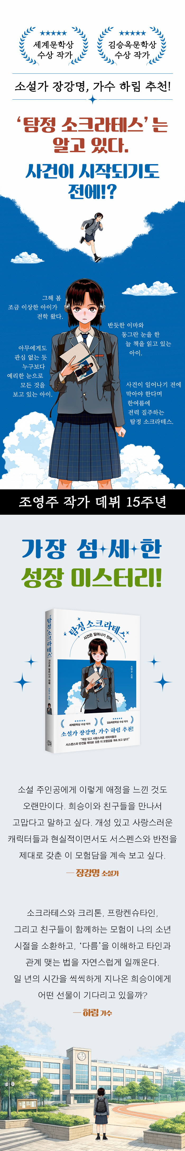 ¡¶Å½Á¤ ¼ÒÅ©¶óÅ×½º¡·´Â ¡®ÁßÇб³¡¯¶ó´Â ÀÛÀº ¼¼°è¸¦ ¹è°æÀ¸·Î, Æò¹üÇÑ ÀÏ»ó ¼Ó¿¡¼ ºú¾îÁö´Â ¹Ì¹¦ÇÑ ±Õ¿°ú ±× Æ´¿¡¼ ¼·Î¸¦ ¾Ë¾Æº¸°í ¿ìÁ¤À» ½×¾Æ°¡´Â ºû³ª´Â ¼ø°£µéÀ» ¼¶¼¼ÇÏ°Ô ±×¸° ¼ºÀå ¹Ì½ºÅ͸®´Ù. ÀÚÆó½ºÆåÆ®·³ Ư¼ºÀÌ ÀÖ´Â Èñ½ÂÀº ¶Ç·¡ ¾ÆÀ̵é°ú ´Ù¸¥ ¹æ½ÄÀ¸·Î ¼¼»óÀ» ¹Þ¾ÆµéÀÌÁö¸¸, ´ë½Å ´©±¸º¸´Ù ¿¹¸®ÇÑ °üÂû·ÂÀ» Áö³æ´Ù. »ç¼ÒÇÑ º¯È¿Í ÀÛÀº ´Ü¼¸¦ ³õÄ¡Áö ¾Ê´Â ƯÀ¯ÀÇ ´É·ÂÀ¸·Î ¿©·¯ Â÷·Ê Ä£±¸µéÀ» À§±â¿¡¼ ±¸ÇÑ Èñ½ÂÀº ¡®Å½Á¤ ¼ÒÅ©¶óÅ×½º¡¯¶ó´Â º°¸íÀ» ¾ò´Â´Ù. °¡¼ö Çϸ²Àº ¡°¡®´Ù¸§¡¯À» ÀÌÇØÇϰí ŸÀΰú °ü°è ¸Î´Â ¹ýÀ» ÀÚ¿¬½º·´°Ô Àϱú¿î´Ù¡±°í ÀÌ Ã¥À» ÃßõÇß´Ù. ¼Ò¼³°¡ Àå°¸í ¿ª½Ã ¡°°³¼º ÀÖ°í »ç¶û½º·¯¿î ij¸¯Å͵é°ú Çö½ÇÀûÀ̸鼵µ ¼½ºÆæ½º¿Í ¹ÝÀüÀ» Á¦´ë·Î °®Ãá ÀÌ ¸ðÇè´ãÀ» °è¼Ó º¸°í ½Í´Ù¡±°í ÆòÇß´Ù.