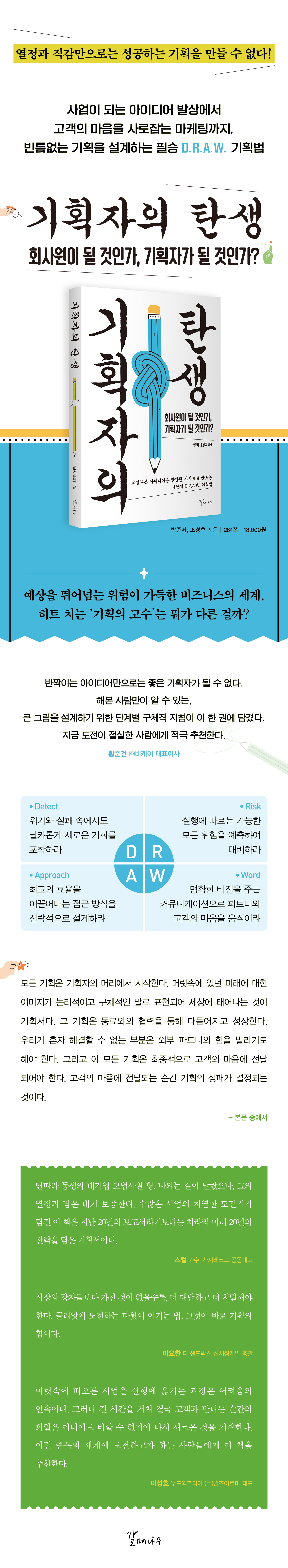 ȸ»ç¿øÀ¸·Î ¶Ç »ç¾÷°¡·Î, ÁÖµµÀûÀΡ®±âȹÀÚÀÇ »î¡¯À» ¸ö¼Ò ½ÇÇöÇØ ¿Â µÎ ÀúÀÚ´Â ±âȹÀ̶ó´Â ¾î·ÆÁö¸¸ °¡½¿ ¼³·¹´Â ÀÏ¿¡ µµÀüÇϰíÀÚ Ã¹¹ßÀ» ¶¾ »ç¶÷µéÀ» ÀÀ¿øÇÏ´Â ½ÉÁ¤À¸·Î ÀÌ Ã¥À» ½è´Ù. ÇöÀå¿¡¼ ¾ò¾î³½ »ý»ýÇÑ ³ëÇϿ츦 Àü¼öÇÏ¿© ½ÃÇàÂø¿À¸¦ ÁÙÀÌ°í ¼º°øÀÇ ±â»ÝÀ» ¾È°ÜÁÖ°íÀÚ ÇÏ´Â ¸¶À½À̾ú´Ù. 2000³â´ë Áß¹Ý ´ë±â¾÷ ÀÎÀç ¾ç¼º ½Ã½ºÅÛÀÇ Æ¯±ÇÀ» ´©·È´ø ¼¼´ë·Î¼, ü°èÀûÀÎ ±³À° ½Ã½ºÅÛ ¾Æ·¡¼ ¾÷¹«¸¦ ¹è¿ï ¿©°ÇÀÌ Á¡Á¡ »ç¶óÁö´Â Çö »óȲ¿¡¼ ´À³¤ ¾ÈŸ±î¿ò°ú Ã¥ÀÓ°¨µµ ÇѸòÇß´Ù. Ã¥ÀÇ µÞºÎºÐ¿¡ µÎ ÀúÀÚ°¡ ¿î¿µÇÏ´Â ¡®±âȹÀÚ Ä¿¹Â´ÏƼ¡¯·ÎÀÇ ÃÊ´ë QR Äڵ带 ½Ç¾î ¼±¹è ¶Ç´Â µ¿·á ±âȹÀÚµé°ú Á÷Á¢ ¼ÒÅëÇÒ Ã¢±¸¸¦ ¸¶·ÃÇÑ °Íµµ ÀÌ·¯ÇÑ »ý°¢¿¡¼´Ù.