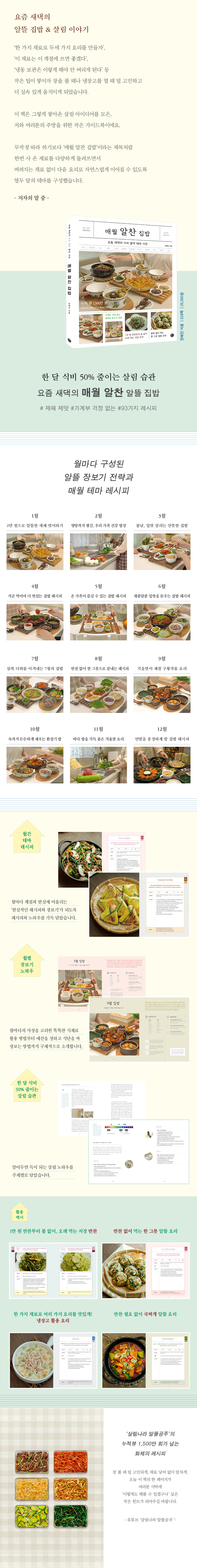 ÀÌ Ã¥Àº ±×·± À庸±â ½ºÅ³°ú ¸ÀÀÖ´Â ·¹½ÃÇÇ, ³ª¾Æ°¡ '»ì¸² ±â¼ú'±îÁö ÀÍÈú ¼ö ÀÖµµ·Ï ÀÌ ºÐ¾ßÀÇ 'Àü¹®°¡'ÀÎ ÀÛ°¡ÀÇ Àα⠸¸Á¡ ·¹½ÃÇǵé°ú ¸Å¿ù ¸Þ´º ±¸¼º ¹× À庸±â ³ëÇÏ¿ì, ÁÖ¹æ û¼Ò¸¦ ½±°Ô ÇÏ´Â ¹ý µî »ì¸² ±â¼úÀ» Àϸñ¿ä¿¬ÇÏ°Ô Á¤¸®ÇØ ´ã¾Ò´Ù. ¸Å¿ù °èÀý°ú ³¯¾¾, Çà»ç µî ´Ù¸¥ »óȲ¿¡ ¸ÂÃç ¸Þ´º¸¦ ±¸¼ºÇÏ°í ½Äºñ Àý¾àÀ» À§ÇÑ À庸±â Àü·«À» ¼Ò°³Çß´Ù. ¶ÇÇÑ, 1¸¸ ¿øÀ¸·Î ¸¸µé ¼ö ÀÖ´Â ¾Ë¶ã ¹ÝÂùºÎÅÍ ºÒ ¾øÀÌ ¿ä¸®Çϰųª ¿À·¡ ¸ÔÀ» ¼ö ÀÖ´Â ÀúÀå ¹ÝÂù, ¾Ë¶ãÇÏ°Ô ¹ÝÂù ¾øÀÌ ¸ÔÀ» ¼ö ÀÖ´Â ÇÑ ±×¸© ¿ä¸®, ¸Å¿ù »ýȰºñ ÁÙÀÌ´Â Å׸¶ ·¹½ÃÇÇ µî ÀÛ°¡ÀÇ ½Ã±×³Êó ·¹½ÃÇǵéÀ» ¾Æ³¦ ¾øÀÌ ´ã¾Æ Ãʺ¸ ÁֺκÎÅÍ º£Å×¶û »ì¸²²Û±îÁö µÎ·çµÎ·ç ÀÐÀ¸¸ç Ȱ¿ëÇÒ ¼ö ÀÖµµ·Ï Çß´Ù.
