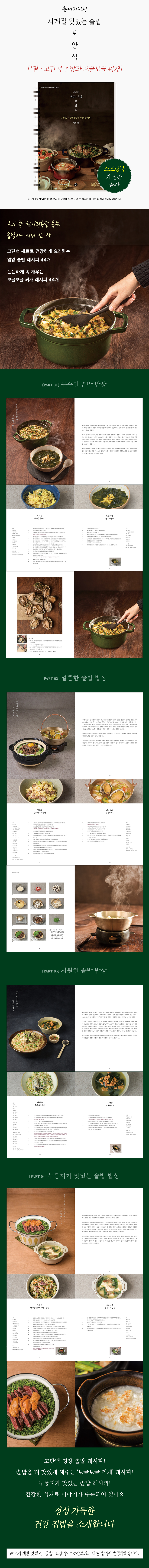 Áý¿¡ ±ÍÇÑ ¼Õ´ÔÀÌ ¿À°Å³ª °¡Á·µéÀÇ ¿ø±âȸº¹ÀÌ ÇÊ¿äÇÒ ¶§¸¶´Ù Àü±â¹ä¼Ü ´ë½Å ¼ÜÀ¸·Î Á÷Á¢ ¹äÀ» ÇϽôø ¾î¸Ó´ÏÀÇ Á¤¼ºÀ» ±×´ë·Î µû¶óÇÒ ¼ö ÀÖ´Â ·¹½ÃÇǸ¦ ¾ö¼±Çß´Ù. ÇϾé°í °í½½°í½½ÇÑ Èò½Ò¹ä¿¡ ºñŸ¹Î°ú ¹«±âÁúÀÌ °¡µæÇÑ Ã¤¼Ò¿Í ´Ü¹éÁú ÇÔ·®ÀÌ ³ôÀº ½ÄÀç·áµéÀ» °¡µæ ¿Ã·Á ¿µ¾çÀ» ¸ÂÃá ¡®º¸¾ç½Ä ¼Ü¹ä¡¯ ·¹½ÃÇÇ´Ù. ¸Å ¼Ü¹ä¿¡ ²À ÇѵΠ°¡Áö ÀÌ»óÀÇ Ã¤¼Ò¿Í °í´Ü¹é ½ÄÀç·á, À̸¦ Å×¸é °í±â³ª ÇØ»ê¹° °°Àº Àç·á¸¦ ÇÔ²² ±¸¼ºÇØ, ¾î¶² ¼Ü¹äÀ» °ñ¶ó ¹äÀ» Áþ´õ¶óµµ ź¼öȹ°, ´Ü¹éÁú, Áö¹æ ±×¸®°í ºñŸ¹ÎÀ» °ñ°í·ç ¼·ÃëÇÒ ¼ö ÀÖµµ·Ï Çß´Ù. ¿¾³¯ ¾î¸Ó´Ï°¡ Â÷·ÁÁֽôø ¹ä»ó¿¡¾ß °í±â¸é °í±â, »ý¼±ÀÌ¸é »ý¼± ȤÀº ´Þ°¿ µî °í´Ü¹é ¿ä¸®°¡ ´Ã ÇÔ²² ÀÖ¾î ¿µ¾çÀ» ±ÕÇü ÀÖ°Ô ¼·ÃëÇÒ ¼ö ÀÖ¾úÁö¸¸, ¹ä Çϳª µ¥¿ì±â ±ÍÂú¾Æ Áï¼®¹äÀ¸·Î ¶§¿ì±â ½Ê»óÀÎ ¿ì¸®°¡ ¾ðÁ¦ ±×·¸°Ô °¢°¢ ¿ä¸®ÇØ ¸ÂÃç ¸ÔÀ» ¼ö Àְڴ°¡. ±×·¸±â¿¡ ÀÌ Ã¥Àº ¼Ü¿¡ ¡®Åº´ÜÁö¡¯¸¦ °ñ°í·ç °®Ãá Àç·á¸¦ ÇÑ ¹ø¿¡ ³Ö°í ¿ä¸®ÇÒ ¼ö ÀÖµµ·Ï ¡®±ÕÇü¡¯°ú ¡®°£´Ü¡¯ ±×¸®°í ¡®¸À¡¯¿¡ ÃÊÁ¡À» ¸ÂÃè´Ù.
