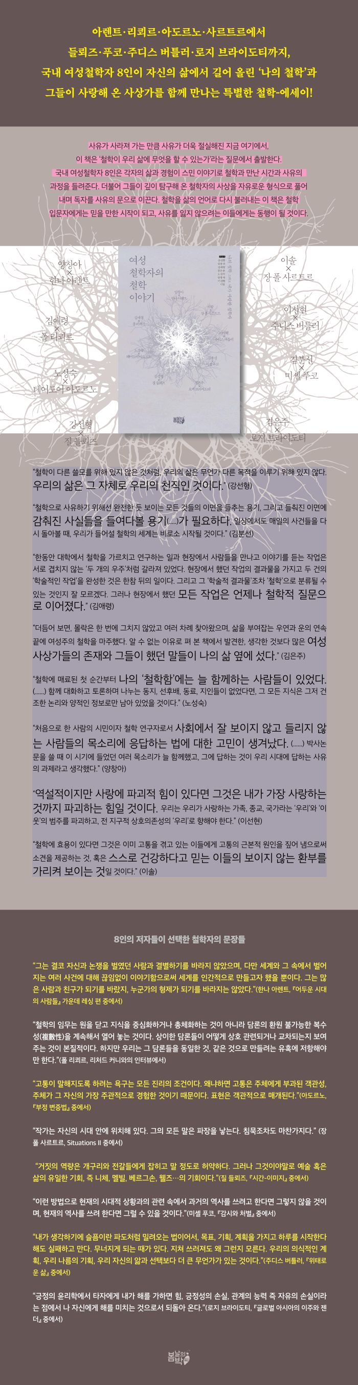 ÀÌ Ã¥¿¡ ¸ðÀÎ ¿©¼ºÃ¶ÇÐ(¿¬±¸)ÀÚµéÀº Çϳª°°ÀÌ ¿ì¸®ÀÇ »îÀ» ´Ù½Ã »çÀ¯ÇÏ°Ô ¸¸µé°í, ´ç¿¬ÇÏ°Ô ¿©°Ü ¿Â °æ°è¿¡ Áú¹®À» ´øÁö¸ç, ÀÌÁúÀûÀÎ Á¸Àçµé°úÀÇ ¿¬°áÀ» »çÀ¯ÇÏ´Â ÀÛ¾÷À» ÇØ¿À°í ÀÖ½À´Ï´Ù. Áö±Ý ¿ì¸®¿¡°Ô ³Ê¹«µµ Àý½ÇÇÑ ÀÌ ÀÛ¾÷µéÀ» öÇÐÀÚ ÀÚ½ÅÀÇ °æÇè°ú ÇÔ²² µé·ÁÁÖ´Â ÀÌ Ã¥ÀÌ, ´Ü ÇÑ ¸íÀÇ µ¶ÀÚ¶óµµ ÀÚ½ÅÀÇ »îÀ» ´õ »çÀ¯ÇÏ´Â ÂÊÀ¸·Î, ¿ì¸®¿¡°Ô ±×¾îÁø °æ°è¸¦ ÀǽÉÇÏ´Â ÂÊÀ¸·Î, ¡®¿ì¸® °øµ¿Ã¼¡¯ ¹Ù±ùÀÇ Á¸À縦 »ó»óÇÏ´Â ÂÊÀ¸·Î ³ª¾Æ°¥ ¼ö ÀÖ°Ô ÇÑ´Ù¸é, ±âȹÀڷμ ´õ ÀÌ»óÀÇ ¹Ù¶÷Àº ¾øÀ» °ÍÀÔ´Ï´Ù.¡±
