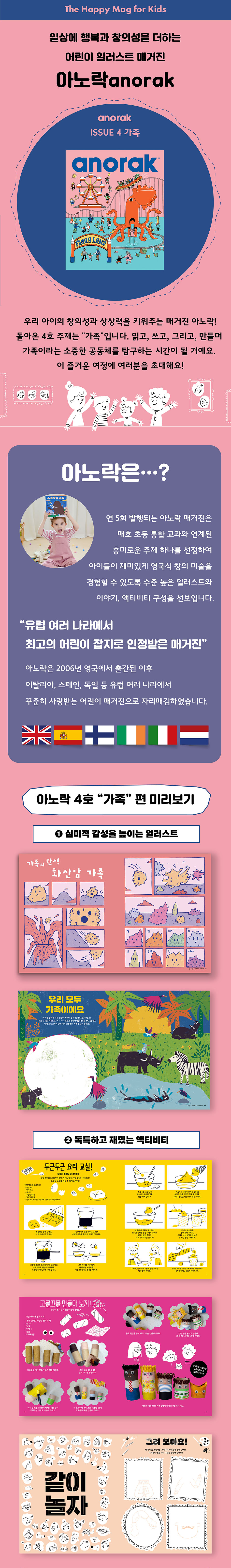 ¾Æ³ë¶ôÀº ¾ÆÀ̵éÀÇ Ã¢ÀǼº Çâ»óÀ» µ½´Â ÀÏ·¯½ºÆ® Áß½ÉÀÇ ¸Å°ÅÁøÀÔ´Ï´Ù. ¿µ±¹ÀÇ À¯¸í ÀÏ·¯½ºÆ®·¹ÀÌÅÍ¿´´ø ÄÉÀ̽ô ¾ÆÀ̵éÀ» À§ÇÑ ÀÏ·¯½ºÆ® ¸Å°ÅÁøÀÌ ¾øÀ½À» ¾ÈŸ±õ°Ô ¿©°å¾î¿ä. ¾ÆÀ̵éÀÌ º¸´Ù ½±°Ô °¨°¢ÀûÀÎ ÀÏ·¯½ºÆ®¸¦ Á¢Çϰí, Àڽŵ鸸ÀÇ ¹æ½ÄÀ¸·Î ³»¸éÀÇ »ó»óÀ» Ç¥ÇöÇØ³»±â¸¦ ¹Ù¶ó´Â ¸¶À½¿¡¼ ÀÌ ¸ÚÁø ¸Å°ÅÁøÀ» ¸¸µé¾ú´ä´Ï´Ù. 'The Happy Mag for Kids'¶ó´Â ½½·Î°Ç¿¡ °É¸Â°Ô ¾Æ³ë¶ô ÆäÀÌÁö °÷°÷¿¡´Â ¾û¶×ÇÏ°íµµ À§Æ®ÀÖ´Â ³ó´ã°ú ±×¸²µéÀÌ ÀÜ¶à µé¾îÀÖ¾î¿ä. À¯Ä¡¿ø¿¡ ´Ù´Ï´Â ¾ÆÀ̵éºÎÅÍ ÃʵîÇб³ ÀúÇгâ Çлýµé±îÁö Èï¹Ì¸¦ ÀÒÁö ¾Ê°í, ¾Æ³ë¶ôÀÌ Á¦°øÇÏ´Â ±³À°ÀûÀÎ ÄÜÅÙÃ÷µéÀ» Áñ±æ ¼ö ÀÖÀ» °Å¿¹¿ä. ±×Àú Àб⸸ ÇÏ´Â °ÍÀÌ ¾Æ´Ï¶ó Á÷Á¢ ¾²°í ±×¸²À¸·Î½á, µ¶Ã¢ÀûÀÎ ¸Å°ÅÁøÀ» ¿Ï¼ºÇÒ ¼ö ÀÖ´Ù´Â Á¡ÀÌ ¾Æ³ë¶ôÀÇ Å« ÀåÁ¡ÀÌÁÒ. °Ô´Ù°¡ ¿¬ 5ȸ ¹ßÇàµÇ±â ¶§¹®¿¡, ÇÑ ±ÇÀ¸·Î ³¡³ª´Â °ÍÀÌ ¾Æ´Ï¶ó Àç¹Ì³ ÁÖÁ¦µéÀ» °ñ¶ó¼ ±×¶§±×¶§ ²¨³» Àд Àç¹Ì±îÁö ´õÇØÁø´ä´Ï´Ù.