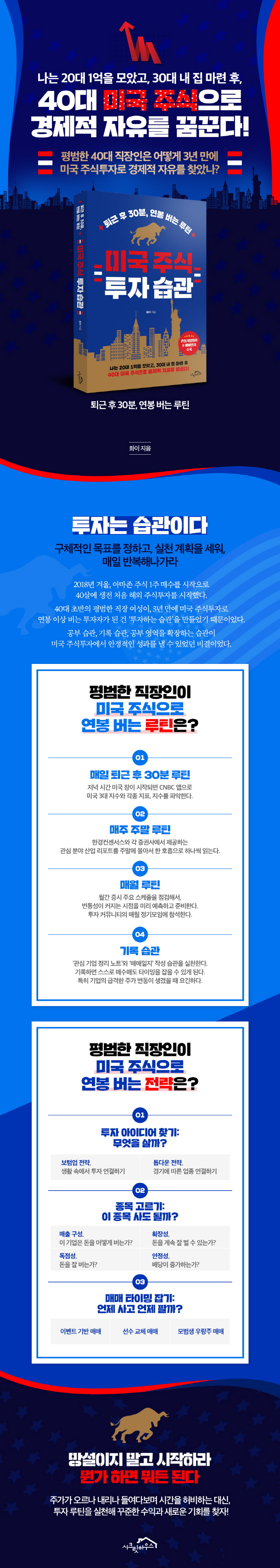 Ã¥ ¡¶¹Ì±¹ ÁÖ½Ä ÅõÀÚ ½À°ü¡·Àº Æò¹üÇÑ Á÷ÀåÀÎÀÎ ÀúÀÚ°¡ 20´ë¿¡ 1¾ïÀ» ¸ðÀ¸°í, 30´ë¿¡ ³» ÁýÀ» ¸¶·ÃÇÑ ÈÄ, 40´ë¿¡ ÁÖ½ÄÀ¸·Î Á¦2ÀÇ ¿ù±ÞÀ» ¸¸µé±â±îÁö ½ÇõÇß´ø ´Ù¾çÇÑ ³ëÇÏ¿ìµéÀ» ´ãÀº Ã¥ÀÌ´Ù. ƯÈ÷ 40´ë¿¡ ¹Ì±¹ ÁÖ½ÄÅõÀÚ¿¡ ÀÔ¹®ÇØ ¾î¶² ÅõÀÚ ½À°üÀ» ¸¸µé°í, À¯ÁöÇß´ÂÁö ÀÚ¼¼È÷ ¼Ò°³ÇÑ´Ù. ±×¸®°í ÅõÀÚ ¾ÆÀ̵ð¾î ¹ß±¼ºÎÅÍ ¸Å¸Å±îÁöÀÇ ½ÇÀü ÅõÀÚ Àü·«À» ¾È³»Çϸç, ÀÌ·¯ÇÑ Àü·«À» Ȱ¿ëÇÑ ±¸Ã¼ÀûÀÎ ÅõÀÚ ¼º°ø »ç·Ê¸¦ ¼Ò°³ÇÑ´Ù. ¶ÇÇÑ ÅõÀÚ ½ÇÆÐ »ç·Êµµ ÇÔ²² °ø°³ÇÏ¸ç ´ç½Ã ±ú´ÞÀº ±³ÈƵµ ¼ÖÁ÷ÇÏ°Ô ´Ù·é´Ù. ±×¸®°í °ü½É ±â¾÷ Á¤¸® ³ëÆ®¿Í ¸Å¸ÅÀÏÁö ÀÛ¼º ³ëÇÏ¿ì¿Í ÇÔ²², ¹Ì±¹ ÁÖ½ÄÅõÀÚ ·çƾÀ» ¸¸µå´Âµ¥ Ȱ¿ëµµ°¡ ³ôÀº »çÀÌÆ®¿Í Âü°í µµ¼µµ ÃßõÇÑ´Ù.