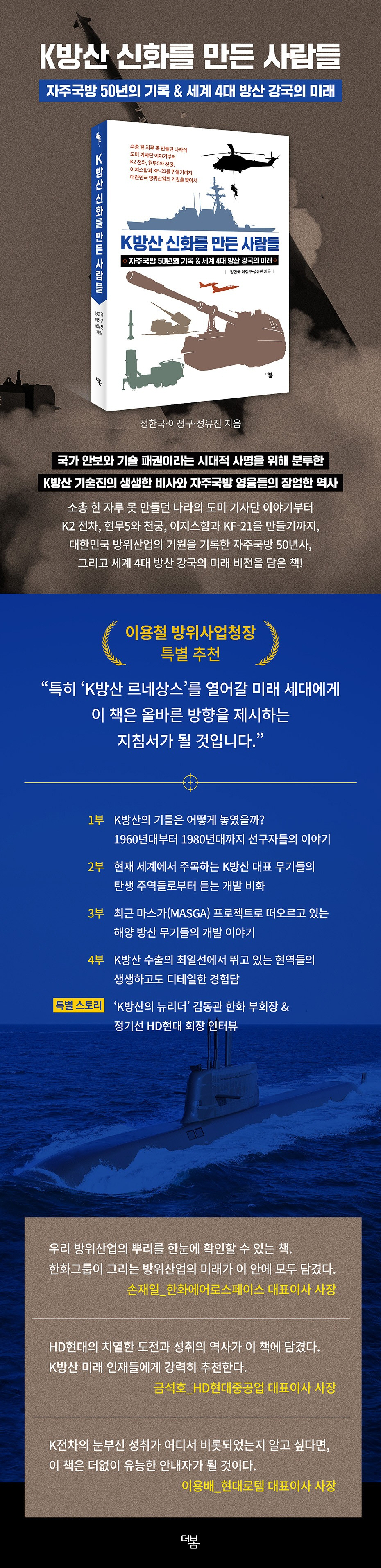 ¶§¸¶Ä§ Á¶¼±ÀϺ¸ »ê¾÷ºÎ°¡ ÁýÇÊÇÑ ¡ºK¹æ»ê ½Åȸ¦ ¸¸µç »ç¶÷µé¡»ÀÌ Ãâ°£µÆ´Ù. ÀÌ Ã¥Àº ¼ÒÃÑ ÇÑ ÀÚ·ç ¸ø ¸¸µé´ø ³ª¶ó°¡ K2 ÀüÂ÷, Çö¹«5¿Í õ±Ã, ÀÌÁö½ºÇÔ°ú KF-21À» ¸¸µé±â±îÁö, ¡®K¹æ»ê¡¯À̶ó´Â À̸§ µÚ¿¡ ¼û¾î ÀÖ´ø 50³âÀÇ ÃàÀûµÈ ±â¼ú, »ê¾÷ »ýŰè, ±×¸®°í À̸¦ Àϱº »ç¶÷µéÀÇ Ä¡¿ÇÑ ±â·ÏÀ» ÃÖÃÊ·Î º»°Ý Á¤¸®ÇÑ »ê¾÷ ´ÙÅ¥¸àÅ͸®´Ù.