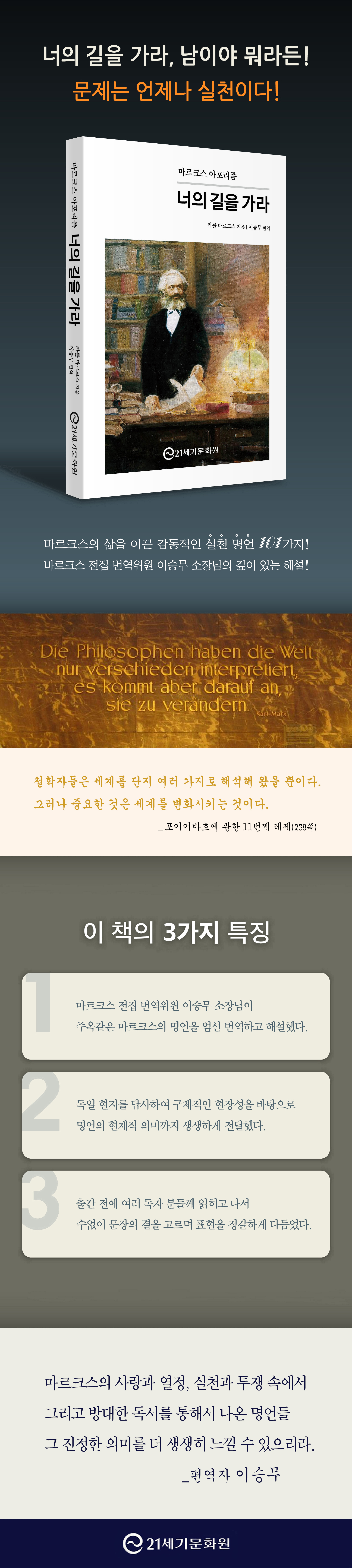 Ã¥¼ÓÀ¸·Î¸¶¸£Å©½º´Â ¹µ»ç¶÷¿¡°Ô °·ÄÇÑ ÀλóÀ» ÁÖ´Â ¾ÆÆ÷¸®ÁòÀ» ¸¹ÀÌ ³²°å´Ù. (p6) ¡®Á¾±³´Â ÀιÎÀÇ ¾ÆÆíÀÌ´Ù!¡¯ ¸¶¸£Å©½º Á¾±³°üÀÌ ´ÜÀûÀ¸·Î µå·¯³ª ÀÖ´Ù. (p43) ¸¶¸£Å©½º öÇÐÀº °üÁ¶°¡ ¾Æ´Ï¶ó ½Çõ¿¡ ÃÊÁ¡À» µÐ´Ù. (p49) ±×´ë°¡ Àû°Ô Á¸ÀçÇÒ¼ö·Ï, »îÀ» Àû°Ô µå·¯³¾¼ö·Ï ±×´ë´Â ´õ ¸¹Àº °ÍÀ» °¡Áö¸ç, ´õ ¸¹Àº °ÍÀ» ½×¾Æ ¿Ã¸°´Ù. (p62) öÇÐÀÌ ¹ÎÁß¿¡°Ô ´êÀ¸·Á¸é ¹«¾ùº¸´Ù ¹ÎÁßÀÇ ¸»·Î ½á¾ß ÇÑ´Ù. (p67) ¸¶¸£Å©½º°¡ ¸»ÇÏ´Â °ÍÀº °³ÀÎÀÌ ¾Æ´Ï¶ó Áý´ÜÀÌ´Ù. ¿¹¿Ü ¾ø´Â ¹ýÄ¢ÀÌ ¾Æ´Ï¶ó °³¿¬¼º ÀÖ´Â °¡¼³ÀÌ´Ù. (p71) Áö±Ý±îÁö ¸ðµç »çȸÀÇ ¿ª»ç´Â °è±ÞÅõÀïÀÇ ¿ª»çÀÌ´Ù. (p80) ¡ºÀÚº»¡»Àº ÀÚº»ÀÇ ²ûÂïÇÑ Åº»ý ½Åȸ¦ µé·ÁÁÖÁö¸¸, ÀÚº»Àº ¾ÆÁ÷µµ ±× ½ÄÀÎÀûÀÎ ÇàŸ¦ Áö±¸ÃÌ °÷°÷¿¡¼ °è¼Ó º¸À̰í ÀÖ´Ù. (p93) Àΰ£¿¡°Ô ÀÌ·Î¿î »çȸ¿Í °æÁ¦ Á¦µµ¸¦ ¼¼¿ì·Á´Â ÅõÀïÀ̾߸»·Î üÁ¦¸¦ ³Ñ¾î ¸ðµç ³ëµ¿ Áß¿¡¼ Á¦ÀÏ °¡Ä¡ ÀÖ´Â ³ëµ¿ÀÌ´Ù. (p103) ÄÉÄɹ¬Àº ¹ýÀ¸·Î »õ·Î¿î Çö½ÇÀ» Àç´ÜÇÒ ¼ö´Â ¾ø´Ù. (p109) ¸ÅÃáÀº ³ëµ¿ÀÚ°¡ Àڱ⠸öÀ» ÆÈ¾Æ¼ ¸Ô°í»ì¾Æ¾ß ÇÏ´Â ÀϹÝÀûÀÎ ¸ÅÃáÀÇ Æ¯¼öÇÑ Ç¥ÇöÀÏ »ÓÀÌ´Ù. (p126) ³ëµ¿·ÂÀº ±â°è¿Í ´Þ¸® ¾î¶² ¿ëµµ¿¡µµ ½±°Ô ÀûÀÀÇÏ´Â ½ÅÃ༺ÀÌ ÀÖ´Ù. (p137) ¡°³»°¡ Á×°í ³ ´ÙÀ½, ¼¼»óÀÌ ¸ÁÇÏµç ¸»µç!¡± À̰ÍÀÌ ¾î´À ÀÚº»°¡³ª ¿ÜÄ¡´Â ±¸È£´Ù. (p146) ÀÚº»°¡´Â ÀΰÝÈµÈ ÀÚº»À̰í, ÀÚº»°¡ÀÇ ¿µÈ¥Àº ÀÚº»ÀÇ ¿µÈ¥ÀÌ´Ù. (p151) ÀÚº»ÁÖÀÇÀû »ý»êÀº ¸ðµç ºÎ°¡ »ù¼Ú´Â ¿øÃµÀÎ ¶¥°ú ³ëµ¿ÀÚ¸¦ ¸Á°¡¶ß¸°´Ù. (p160) ÀÚº»°¡´Â ¿Ö ±â°è¸¦ µµÀÔÇϴ°¡? »ý»ê¼º Çâ»ó¸¸ÀÌ ¾Æ´Ï¶ó ¼÷·Ã ³ëµ¿ÀÚÀÇ ÈûÀ» ²ª±â À§Çؼ´Ù. (p169) °ø»êÁÖÀÇÀÚµéÀÌ Á¶±¹À» ¹ö·È´Ù°í ºñ³¹Þ¾Ò´Ù. ¸¶¸£Å©½º´Â ¹Ý¹ÚÇÑ´Ù. ¾ø´Â °ÍÀ» ¾î¶»°Ô ¹ö¸®´Â°¡? ³ëµ¿ÀÚ´Â Á¶±¹ÀÌ ¾ø´Ù. (p183) Á¤Ä¡±Ç·ÂÀ̶õ ÇÑ °è±ÞÀÌ ´Ù¸¥ °è±ÞÀ» ¾ï¾ÐÇϱâ À§ÇØ Á¶Á÷ÇÑ ±Ç·ÂÀÌ´Ù. (p190) ¸¶¸£Å©½º´Â ¸Á¸íÁö¿¡¼ Á¶±¹À» ±×¸®¿öÇß´Ù. ÀÏÆò»ý Á¶±¹°ú µ¿Æ÷µéÀÌ Ã³ÇÑ Çö½ÇÀ» °í³úÇϸç ÅõÀïÇß´Ù. (p199) ±¹È¸ÀÇ¿ø È帵éÀÇ ¼±°Å öÇÐÀº ´ÜÁö ¿À¸¥¼ÕÀÌ ÇÏ´Â ÀÏÀ» ¿Þ¼ÕÀÌ ¸ð¸£µµ·Ï ÇÏ´Â µ¥ ÀÖ´Ù. ±×·¸°Ô ±×µéÀº ÀڽŵéÀÌ ÁËÁöÀº ÀÏÀÌ ¾ø´Ù´Â Ç¥½Ã·Î µÎ ¼ÕÀ» ´Ù ¾Ä´Â´Ù. (p212) ´É·Â¿¡ µû¶ó ÀÏÇϰí Çʿ信 µû¶ó ¹Þ´Â´Ù. (p227) ¹Ì·¡¸¦ À§ÇÑ ÇÁ·Î±×·¥À» ÀÛ¼ºÇÏ´Â ÀÚ´Â ¹Ýµ¿ÀÌ´Ù. (¡¤¡¤¡¤) ¹Ì·¡´Â µû·Î ÀÖ´Â °Ô ¾Æ´Ï¶ó ÇöÀçÀÇ ÅõÀïÀ¸·Î ¸¸µé¾îÁø´Ù. (p234) öÇÐÀÚµéÀº ¼¼°è¸¦ ´ÜÁö ¿©·¯ °¡Áö·Î ÇØ¼®¸¸ ÇØ ¿ÔÀ» »ÓÀÌ´Ù. ±×·¯³ª Áß¿äÇÑ °ÍÀº ¼¼°è¸¦ º¯È½ÃŰ´Â °ÍÀÌ´Ù. (p238) |