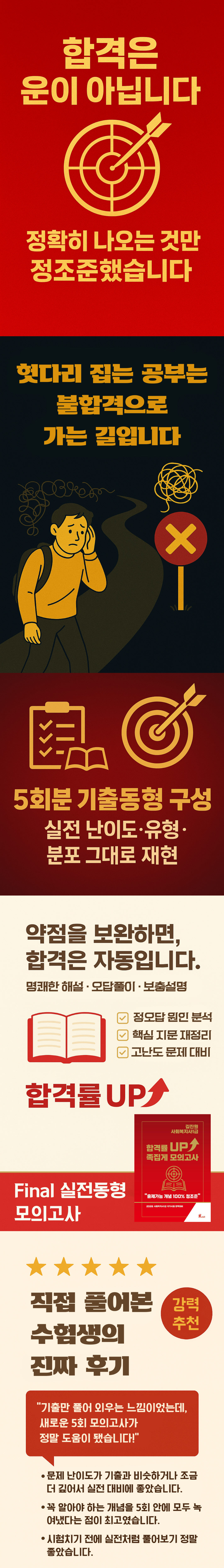 Ã¥¼ÓÀ¸·Î¹ü»ç¿¡ ±âÇÑÀÌ ÀÖ°í õÇϸ¸»ç°¡ ´Ù ÀÌ·ê ¶§°¡ ÀÖ³ª´Ï... For everything there is a season, a time for every activity under heaven. - Ecclesiastes(Àüµµ¼) 3 : 1 - »çȸº¹ÁöÇÐ Á¤Åë Àü°ø±³¼ö°¡ ¡®ÀåÀÎÁ¤½Å¡¯À¸·Î ÁýÇÊÇÑ ÀûÁß¹®Á¦Áý ÃâÁ¦°¡´ÉÇÑ °³³äÀ» ÀüºÎ ´ãÀº ÇÕ°ÝÀ» À§ÇÑ ³¡Àå ¸ðÀǰí»ç!! ¡°¡®¿Ö ±×·±Áö ¸ô¶óµµ µÇ¿ä. °Å±îÁö´Â ¹®Á¦¿¡¼ ¾È ¹°¾î ºÁ¿ä.¡¯ ÀÌ·± ¸»¾¸ÀÌ ¾îÂ µçµçÇÏ´øÁö... ÀÌ°Í Àú°Í ±â¿ô°Å¸®Áö ¸»°í ÀÌ ±³À縸 ¿©·¯ ¹ø º¸¼¼¿ä. ±³¼ö´Ô ¸»¾¸ Ʋ¸°°Å Çϳªµµ ¾ø½À´Ï´Ù.¡± - Á¦23ȸ ÇÕ°Ý ÀÌ¡ÛÈ ¼±»ý´Ô - ¼öÇè»çȸº¹ÁöÇÐ ´ëÇѹα¹ No.1 ÀÎÈ(ìÒûú) ±èÁø¿ø Àλçµå¸³´Ï´Ù. 2003³â Á¦1ȸ »çȸº¹Áö»ç1±Þ ±¹°¡½ÃÇèÀÌ ½ÃÇàµÈ ÀÌÈÄ 2025³â Á¦23ȸ ½ÃÇèÀÌ Ä¡·¯Áö´Â ±â°£ µ¿¾È ÃâÁ¦¼öÁØ ¶ÇÇÑ ³ª³¯ÀÌ Çâ»óµÇ±ä ÇßÁö¸¸, ±×°£ º¹¿øµÇ°í °ø°³µÈ ±âÃâ¹®Á¦°¡ ´©ÀûµÇ¾î ÀÖÀ½¿¡µµ ºÒ±¸Çϰí ÇÕ°Ý·üÀÌ ³ôÁö ¾ÊÀº °¡Àå Å« ÀÌÀ¯´Â ¡®¼öÇèÀûÇÕ¼ºÀÌ ÀÖ´Â Àü¹®ÈµÈ ±³Àç¿Í °ÀÇÀÇ ºÎÀ硯 ¶§¹®ÀÔ´Ï´Ù. ÇÊÀÚ´Â Á¦´ë·Î µÈ ¼öÇè¼Àû°ú ÃÖÀûÈµÈ °ÀǸ¦ ÅëÇØ ´©±¸³ª ´Ü±âÇÕ°ÝÇÒ ¼ö ÀÖµµ·Ï Çϰڴٴ °¡½¿¹÷Âù ¼Ò¸íÀǽÄÀ¸·Î ±³ÀçÁýÇʰú °ÀǸ¦ ½ÃÀÛÇÏ¿´½À´Ï´Ù. ¡°½ÃÇèÀÇ Ã³À½°ú ³¡Àº ±âÃâ¹®Á¦¿¡ ÀÖ½À´Ï´Ù!!¡± ½ÃÇè¿¡ ÀÖ¾î¼ ¡°¸¸°íÀÇ Áø¸®(?)¡±´Â ¹Ù·Î ±âÃâ¹®Á¦¿¡¼ ¹®Á¦°¡ ´Ù½Ã ¹Ýº¹ÃâÁ¦°¡ µÈ´Ù´Â °ÍÀÔ´Ï´Ù. ½ÇÁ¦·Î ½ÃÇèȸÂ÷°¡ ½×Àϼö·Ï ´õ¿í ´õ ¶Ñ·ÇÀÌ ³ªÅ¸³ª°í ÀÖ´Â °ÍÀÌ ¹Ù·Î ¡°6080¹ýÄ¢¡±ÀÔ´Ï´Ù. Áï 60%¸¸ ³Ñ±â¸é µÇ´Â ½ÃÇèÀε¥ 80%ÀÌ»óÀÇ ±âÃâ¹®Á¦¿¡¼ 1ȸ ÀÌ»ó ÃâÁ¦µÈ ³»¿ëÀÌ ¹Ýº¹ÃâÁ¦ µÈ´Ù´Â °ÍÀÔ´Ï´Ù. µû¶ó¼ ±âÃâ¹®Á¦¸¦ ½ÉÃþºÐ¼®ÇÑ ±âÃâ¹®Á¦ÁýÀ¸·Î ±âÃâ³íÁ¡À» °øºÎÇÔÀ¸·Î½á ¹æ´ëÇÑ ÇнÀ·®À» ÁÙÀÌ´Â °ÍÀÌ ÃִܱⰣ Á¤È®ÇÏ°í ¾ÈÁ¤ÀûÀ¸·Î ÇÕ°ÝÇÒ ¼ö ÀÖ´Â ¹æ¹ýÀÔ´Ï´Ù. ¡°6080¹ýÄ¢¡±Àº ¸ðÀǰí»ç¿¡¼µµ Àû¿ëÀÌ µË´Ï´Ù. ½ÃÇè¿¡ ÃâÁ¦µÇÁö ¾ÊÀº ³íÁ¡À¸·Î ¸¸µé¾îÁø ¸ðÀǰí»ç¸¦ Ǫ´Â °ÍÀº Çê´Ù¸®Â¤´Â °øºÎÀ̹ǷÎ, ±âÃâ³íÁ¡À» ¹Ý¿µÇÑ ¸ðÀǰí»ç·Î ½Ç·ÂÀ» Á¡°ËÇÏ°í ¾àÁ¡À» º¸¿ÏÇØ¾ß ÇÕ´Ï´Ù. ÃâÁ¦°¡´ÉÇÑ °³³äÀ» ÀüºÎ ´ãÀº ³¡Àå ¸ðÀǰí»ç·Î¼ ±èÁø¿ø Oikos »çȸº¹Áö»ç1±Þ Final ½ÇÀüµ¿Çü Á·Áý°Ô ¸ðÀǰí»çÀÇ Æ¯Â¡Àº ´ÙÀ½°ú °°½À´Ï´Ù. 01. ÃâÁ¦°¡´É ¡®0¼øÀ§¡¯ ¾ö¼±ÇÑ Çٽɹ®Á¦¸¦ ÅëÇØ ºóÆ´¾øÀÌ ±âÃâ³íÁ¡ Check! ÀÌ¹Ì ÃâÁ¦°¡ µÇ¾ú´ø ±âÃâ³íÁ¡¿¡¼ 80~90%°¡ ´Ù½Ã ÃâÁ¦°¡ µÇ¹Ç·Î ±âÃâ³íÁ¡À» Á¡°ËÇÏ´Â °ÍÀÌ ½ÃÇèÀ» ¾ÕµÎ°í ±²ÀåÈ÷ Áß¿äÇÑ ÀÏÀÔ´Ï´Ù. ¿ª´ë±âÃâ¹®Á¦ÀÇ ±âÃâ³íÁ¡°ú ÃâÁ¦°¡´ÉÇÑ ¡®0¡¯¼øÀ§ ºóÃâ³íÁ¡À» 100% ¹Ý¿µÇÏ¿´À¸¹Ç·Î Á¤´äÀ» ¡®ºü¸£°í Á¤È®È÷¡¯ °ñ¶ó³¾ ¼ö ÀÖ´Â ½ºÄµ´É·Â ¹è¾çÀº ¹°·Ð ¾ÈÁ¤ÀûÀÎ Çհݱâ¹ÝÀ» ´ÙÁú ¼ö ÀÖ½À´Ï´Ù. 02. ºÐÆ÷¡¤À¯Çü¡¤³À̵µ¸¦ ½ÇÁ¦ ½ÃÇè¿¡ ¸ÂÃá µ¿Çü¸ðÀǰí»ç·Î ½ÇÀü Training! ½ÇÀüó·³ ¿¬½ÀÇϵµ·Ï ÃâÁ¦ ºÐÆ÷¤ýÃâÁ¦ À¯Çü¤ý³À̵µ¸¦ ±âÃâ¹®Á¦¿Í À¯»çÇÏ°Ô ±¸¼ºÇÑ ±âÃ⵿Çü¸ðÀǰí»ç¸¦ ¼ö·ÏÇÏ¿´½À´Ï´Ù. ±âÃ⵿Çü ¸ðÀǰí»ç 5ȸºÐÀ» ÅëÇØ ½ÇÀü°¨°¢°ú ÀÀ¿ë´É·ÂÀ» Ű¿ï ¼ö ÀÖÀ¸¸ç, ½ÃÇèÀå¿¡¼ÀÇ Áø°Ë½ÂºÎ¸¦ À§ÇÑ Á¤±³ÇÑ ½Ç·ÂÀ» °®Ãâ ¼ö ÀÖ½À´Ï´Ù. ½ÇÀüó·³ Ç®¾îº¼ ¼ö ÀÖµµ·Ï OMRÄ«µå¸¦ ÀåÂøÇß½À´Ï´Ù. 03. ¸íÄèÇϰí Ä£ÀýÇÑ ÇØ¼³, ¿À´äÇ®ÀÌ, º¸Ãæ¼³¸íÀ¸·Î ½Ç·ÂÁ¡°Ë ¹× Çհݿϼº! ÇØ¼³, ¿À´äÇ®ÀÌ, º¸Ãæ¼³¸íÀ» dzºÎÇϰí Á¤È®ÇÏ°Ô ¼ö·ÏÇϰí, ¼³¸íÀÌ Á» ´õ ÇÊ¿äÇÑ Áß¿äÁö¹®¿¡ ´ëÇØ ÇٽɳíÁ¡À» OIKOS UPÀ¸·Î Á¤¸®ÇÏ¿´½À´Ï´Ù. À̸¦ ÅëÇØ ÀÚ½ÅÀÇ ºÎÁ·ÇÑ Á¡À» °£ÆÄÇÏ¿© ½Ç·ÂÁ¡°ËÀ» ÇÒ ¼ö ÀÖÀ½Àº ¹°·ÐÀÌ°Å´Ï¿Í °í³µµ ¹®Á¦¿¡ ´ëÇÑ ´ëºñ¸¦ °¡´ÉÄÉ ÇÔÀ¸·Î½á ÇÕ°ÝÀ» ¿Ï¼ºÇÒ ¼ö ÀÖ½À´Ï´Ù. ¡°±èÁø¿ø ±³¼ö´ÔÀÇ °ÀǴ óÀ½ºÎÅÍ ³¡±îÁö ¿µÈ¥ÀÌ ÀÖ´Â ºÐÀÔ´Ï´Ù. Á¤¸»ÀÌÁö ±ô¦ ³î¶ú½À´Ï´Ù. ³»°¡ ÇÏ´Â ÀÏ¿¡ ÇÁ·Î°¡ µÈ´Ù´Â °ÍÀ» »ý°¢ÇØ º¸¾Ò°í À̺ÐÀº ÁøÁ¤ ÇÁ·ÎÀ̽ʴϴÙ. ±èÁø¿ø ±³Àç ¼±ÅÃÀÇ °á°ú´Â ½ÅÀÇ ÇÑ ¼ö¿´½À´Ï´Ù.¡± - Á¦22ȸ ÇÕ°Ý È«Çý°æ ¼±»ý´Ô - ±èÁø¿ø Oikos »çȸº¹Áö»ç1±Þ ±³Àç¿Í °ÀǸ¦ ¸¸³ª°Ô µÈ °ÍÀº ¼±»ý´Ô²² Å« Çà¿îÀÔ´Ï´Ù!! ¿À¸®Áö³Î·Î »çȸº¹Áö¸¦ Àü°øÇÑ Á¤ÅëÆÄ Àü°ø±³¼öÀÇ ±³Àç¿Í °ÀÇ·Î ÃִܱⰣ ÇÕ°ÝÀÇ ±â»ÝÀ» °æÇèÇØ º¸½Ê½Ã¿ä! ÀÌ Ã¥À» º¸½Ã´Â ¼±»ý´Ôµé¿¡°Ô Çϳª´ÔÀÇ ÀºÃÑÀÌ Ãæ¸¸ÇÏ½Ã±æ °£ÀýÈ÷ ±â¿øµå¸³´Ï´Ù. 2025³â 12¿ù oikonomos ÀÎÈ(ìÒûú) ±èÁø¿ø |