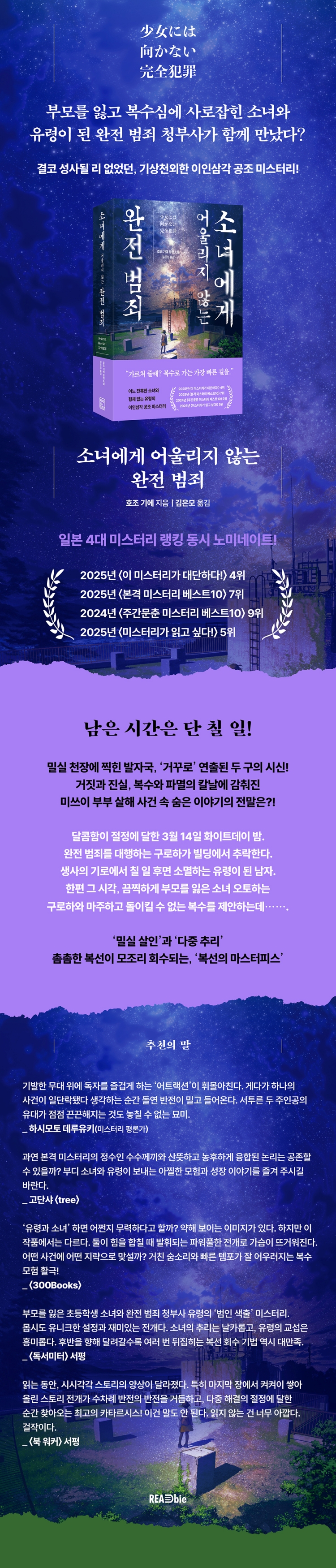 ¡¶¼Ò³à¿¡°Ô ¾î¿ï¸®Áö ¾Ê´Â ¿ÏÀü ¹üÁË¡·´Â ¹Ð½Ç »ìÀΰú ´ÙÁß Ã߸®¸¦ Á¢¸ñÇÑ Æ¯¼ö ¼³Á¤ ¹Ì½ºÅ͸®·Î ¡®º¹¼±ÀÇ ¸¶½ºÅÍÇǽº¡¯¶ó´Â Æò°¡¸¦ ¹Þ°í ÀÖ´Ù. ´Ù±×Ä¡µí µîÀåÇÏ´Â ¼ö¼ö²²³¢µµ º» ÀÛǰÀÇ ¸Å·Â Áß Çϳª. ¸¶Áö¸· Àå¿¡¼´Â Á¦¸ñ±îÁö ¿Ïº®È÷ ȸ¼öµÅ ¹ö¸®´Â ÇüÅ·ΠÇÑ ±ÇÀÇ ¹Ì½ºÅ͸® ¼¼°è°¡ ±ò²ûÈ÷ Á¤¸®µÇ´Â »õ·Î¿î ¹¦¹Ì¸¶Àú ¼±º¸ÀδÙ.