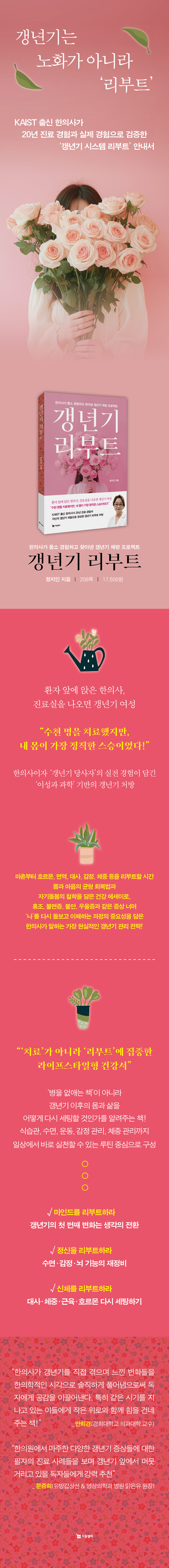 ÀúÀÚ´Â ¿À·£ ±â°£ ¿©¼º Àü¹® ÇÑÀÇ¿øÀ» ¿î¿µÇÏ¸ç °»³â±â, °©»ó¼± Áúȯ, ¸¸¼ºÁúȯ°ú ºñ¸¸ÀÇ ±¸Á¶Àû ¿¬°á¼ºÀ» ¿¬±¸ÇÏ¸é¼ °»³â±â´Â ´Ü¼øÈ÷ Áõ»ó ³ª¿°ú ó¹æ Áß½ÉÀÌ ¾Æ´Ï¶ó ¸ö Àüü¸¦ ´Ù½Ã ¼¼ÆÃÇÏ´Â Àü½Å ¸®ºÎÆ® ÇÁ·Î±×·¥ÀÌ ÇÊ¿äÇÏ´Ù´Â °ÍÀ» ÀνÄÇÏ°Ô µÇ¾ú´Ù. °»³â±â´Â °©»ó¼± ±â´É¡¤Ã¼Áß º¯È¡¤¼ö¸éÀÇ Áú¡¤°¨Á¤ ±âº¹¡¤´ë»ç ½Ã½ºÅÛ¡¤½ºÆ®·¹½º ¹ÝÀÀ µîÀÌ º¹ÇÕÀûÀ¸·Î ¾ôÇô ÀÖÀ¸¸ç, ¾î´À Çϳª¸¸ ÇØ°áÇØ¼´Â º¯È°¡ Áö¼ÓµÇÁö ¾Ê´Â´Ù. µû¶ó¼ ÀÌ Ã¥Àº °³º° Áõ»ó¿¡ ´ëÇÑ ´ÜÆíÀû Á¢±ÙÀÌ ¾Æ´Ï¶ó °»³â±â ÀÌÈÄÀÇ »îÀ» À§ÇÑ ¡®»ç¿ë¼³¸í¼¡¯ÀÌÀÚ ¶óÀÌÇÁ½ºÅ¸ÀÏ À籸Ãà °¡À̵带 Á¦°øÇÑ´Ù.