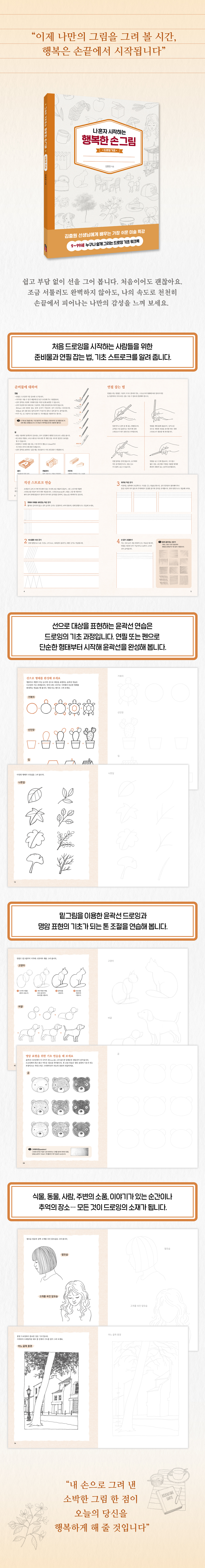 ¡¶³ª È¥ÀÚ ½ÃÀÛÇÏ´Â ÇູÇÑ ¼Õ±×¸²-µå·ÎÀ× ±âÃÊ¡·´Â ±×¸²ÀÌ Ã³À½ÀÎ »ç¶÷µµ ½±°Ô ½ÃÀÛÇÒ ¼ö ÀÖ´Â µå·ÎÀ× ±âÃÊ ¿öÅ©ºÏÀÌ´Ù. Àß ±×¸®´Â °Íº¸´Ù ±×¸®´Â °úÁ¤ÀÇ Áñ°Å¿ò¿¡ ÃÊÁ¡À» ¸ÂÃß¾î ºÎ´ã ¾øÀÌ °¡º±°Ô ¼±À» ±ß´Â °Í¿¡¼ºÎÅÍ Ãâ¹ßÇÑ´Ù. Áغñ¹°°ú ¿¬ÇÊ Àâ´Â ¹ý, ±âº» ½ºÆ®·ÎÅ© ¿¬½ÀºÎÅÍ Â÷±ÙÂ÷±Ù ¾È³»Çϸç, ¿¬Çʰú ÆæÀ» »ç¿ëÇÏ¿© ´Ü¼øÇÑ µµÇü¿¡¼ ½ÃÀÛÇØ ½Ä¹°, µ¿¹°, »ç¹°, Àι°°ú dz°æ±îÁö ´Ù¾çÇÑ ´ë»óÀ» ±×·Á º¼ ¼ö ÀÖ´Ù. µå·ÎÀ×ÀÇ ±âÃʰ¡ µÇ´Â À±°û¼±°ú ¹Ø±×¸² ¿¬½À, ¸í¾Ï Ç¥ÇöÀ» À§ÇÑ Åæ Á¶Àýµµ ÀÚ¿¬½º·´°Ô ÀÍÈù´Ù. ¿¬½À ÆäÀÌÁö¿¡ ÀÖ´Â ¿¯Àº ¹Ø¼±À» µû¶ó ±×·Á º¸°í, ¼Õ°ú ¸¶À½ÀÌ °¡´Â ´ë·Î ÀÚÀ¯·Ó°Ô º¯ÇüÇØ ±×·Á º¼ ¼öµµ ÀÖ´Ù. ¿Ïº®ÇÏÁö ¾Ê¾Æµµ Á¶±Ý ¼Åø·¯µµ ±¦Âú´Ù. ³ªÀÇ ¼Óµµ·Î õõÈ÷ ³ª¾Æ°¡¸ç ¼Õ³¡¿¡¼ ÇǾ´Â ³ª¸¸ÀÇ °¨¼ºÀ» ´À²¸ º»´Ù. ¿À´Ã, ³» ¼ÕÀ¸·Î ±×·Á ³½ ¼Ò¹ÚÇÑ ±×¸² ÇÑ Á¡ÀÌ ³ªÀÇ ÇϷ縦 ÇູÇÏ°Ô ÇØ ÁÙ °ÍÀÌ´Ù.