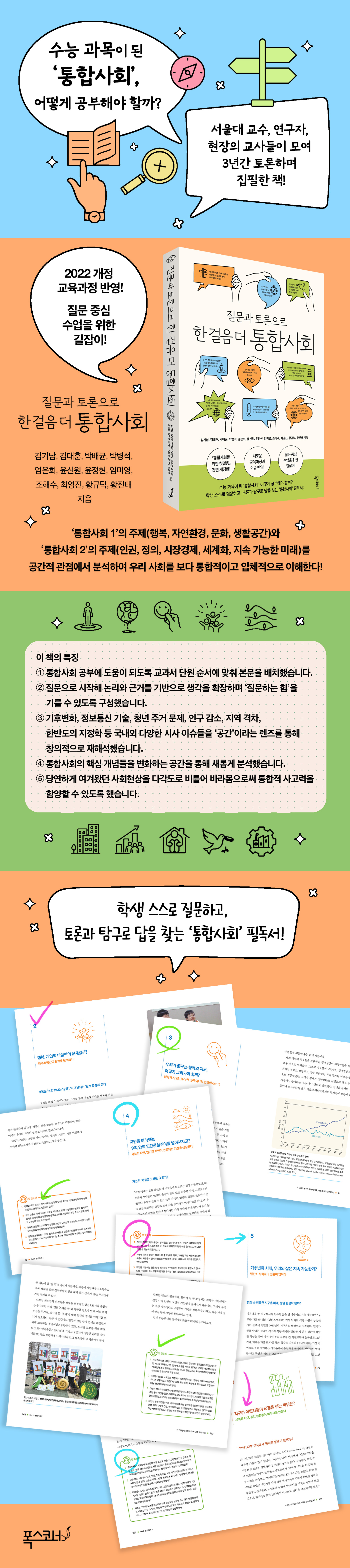 ÀÌ¿¡ ¼¿ï´ë ±³¼ö, ¿¬±¸ÀÚ, ÇöÀå ±³»çµéÀÌ ÇÔ²² ¸ð¿© Ä¡¿ÇÑ Åä·ÐÀ» ÅëÇØ ¿Ï¼ºÇÑ ¡ºÅëÇÕ»çȸ¸¦ À§ÇÑ Ã¹°ÉÀ½¡»ÀÌ ±×°£ ±³À°ÇöÀå¿¡¼ ±³Àç ¹× Çʵ¶¼·Î ³Î¸® ÀÐÇô¿Ô´Ù. À̹ø¿¡ Àü¸é °³Á¤ÇÏ¿© Ãâ°£µÈ ¡ºÁú¹®°ú Åä·ÐÀ¸·Î ÇÑ °ÉÀ½ ´õ ÅëÇÕ»çȸ¡»´Â º¯ÈÇÏ´Â »çȸ Çö½Ç°ú »õ·Î¿î ±³À°°úÁ¤À» Ãæ½ÇÈ÷ ¹Ý¿µÇϰí ÃֽŠÅë°è¿Í ÀÚ·á·Î ³»¿ëÀ» º¸¿ÏÇØ, Áú¹®°ú Åä·Ð Áß½ÉÀÇ Çлý ÁÖµµÇü ÅëÇÕ»çȸ °øºÎÀÇ ±æÀâÀ̰¡ µÉ ¼ö ÀÖµµ·Ï ±¸¼ºÇß´Ù. ´Ù¼Ò ºÒÇÊ¿äÇÑ ³»¿ëÀº °ú°¨È÷ Ãà¾àÇÏ´Â ´ë½Å ÇöÀçÀû Á߿䵵°¡ ´õ ³ô¾ÆÁø ºÎºÐµéÀº º¸´Ù »ó¼¼ÇÏ°Ô ´Ù·ç¾ú´Ù. ¶ÇÇÑ ÃֽŠÀÚ·á¿¡ ±â¹ÝÇØ º»¹®°ú µµÇ¥ µîÀÇ ³»¿ëÀ» ¾÷±×·¹À̵åÇß´Ù.