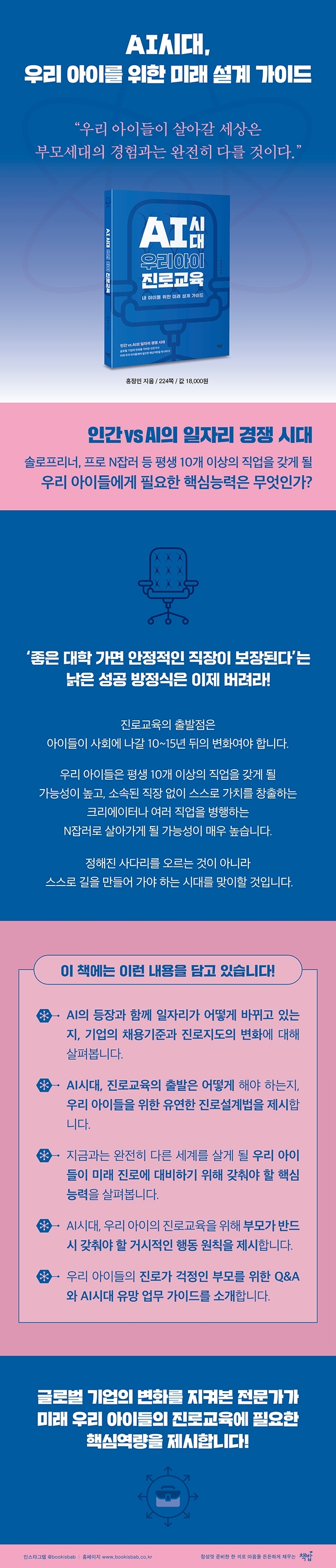 ÇöÀå Àü¹®°¡ÀÇ °æÇè°ú Çö½ÇÀÌ °í½º¶õÈ÷ ´ã±ä ÀÌ Ã¥Àº ´ÙÀ½°ú °°Àº ³»¿ëÀ» ´ã°í ÀÖ½À´Ï´Ù. ¸ÕÀú PART 1¿¡¼´Â AIÀÇ µîÀå°ú ÇÔ²² ¿ì¸® »çȸÀÇ ÀÏÀÚ¸®°¡ ¾î¶»°Ô ¹Ù²î°í ÀÖ´ÂÁö, ±â¾÷ÀÇ Ã¤¿ë±âÁذú Áø·ÎÁöµµÀÇ º¯È¿¡ ´ëÇØ »ìÆìº¸°í, PART 2¿¡¼´Â º¯ÈÇϰí ÀÖ´Â Àϰú ÀÏÀÚ¸®ÀÇ À¯ÇüÀ» Æ÷ÇÔÇØ ¿ì¸® ÁÖº¯¿¡¼ ³ªÅ¸³ª°í ÀÖ´Â »õ·Î¿î ÇüÅÂÀÇ Àϰú °ü·ÃÇÑ ¸ð½ÀµéÀ» dzºÎÇÑ »ç·Ê¿Í ÇÔ²² º¸¿©ÁÝ´Ï´Ù. PART 3¿¡¼´Â AI½Ã´ë, Áø·Î±³À°ÀÇ Ãâ¹ßÀº ¾î¶»°Ô ÇØ¾ß ÇÏ´ÂÁö, ¿ì¸® ¾ÆÀ̸¦ À§ÇÑ À¯¿¬ÇÑ Áø·Î¼³°è¹ýÀ» Á¦½ÃÇϸç, PART 4¿¡¼´Â Áö±Ý°ú´Â ¿ÏÀüÈ÷ ´Ù¸¥ ¼¼°è¸¦ »ì°Ô µÉ ¿ì¸® ¾ÆÀ̵éÀÌ ¹Ì·¡ Áø·Î¿¡ ´ëºñÇϱâ À§ÇØ °®Ãç¾ß ÇÒ Çٽɴɷ¿¡ ´ëÇØ »ìÆìº¾´Ï´Ù. ¸¶Áö¸·À¸·Î PART 5¿¡¼´Â AI½Ã´ë, ¿ì¸® ¾ÆÀÌÀÇ Áø·Î±³À°À» À§ÇØ ºÎ¸ð°¡ °®Ãç¾ß ÇÒ °Å½ÃÀûÀÎ Çൿ ¿øÄ¢À» Á¦½ÃÇØÁÖ°í, ¿©±â¿¡ µ¡ºÙ¿© ºÎ·Ï¿¡¼´Â ¿ì¸® ¾ÆÀ̵éÀÇ Áø·Î°¡ °ÆÁ¤ÀÎ ºÎ¸ð¸¦ À§ÇÑ Q&A¿Í AI½Ã´ë À¯¸Á ¾÷¹« °¡À̵带 ¼Ò°³ÇÕ´Ï´Ù.