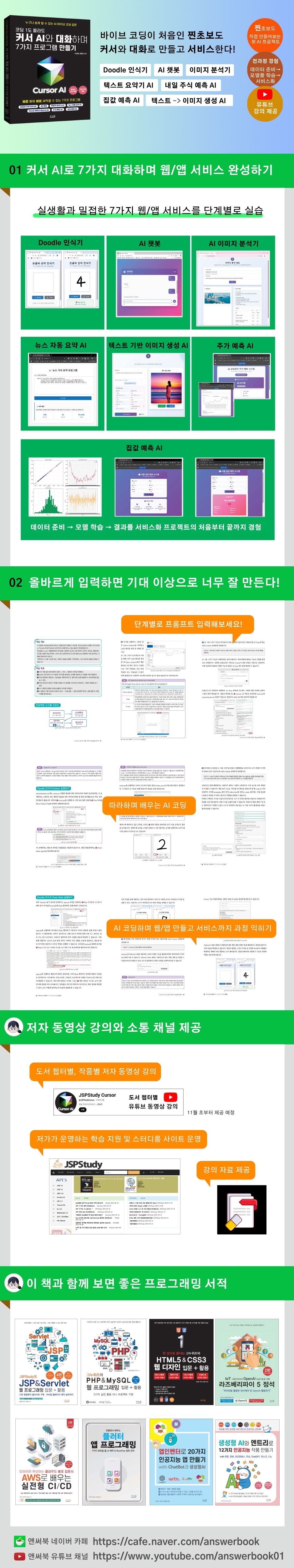 ÀÌ Ã¥Àº Cursor¶ó´Â AI °³¹ß µµ±¸¿Í ChatGPT °°Àº »ý¼ºÇü AI¸¦ Ȱ¿ëÇØ, ´Ü ÇÑ ÁÙÀÇ Äڵ嵵 ¸ð¸£´ø µ¶ÀÚµµ ´ëȸ¸À¸·Î ÇÁ·Î±×·¥À» ¸¸µé ¼ö ÀÖ´Â °æÇèÀ» Á¦°øÇÕ´Ï´Ù. ´Ü¼øÈ÷ µû¶ó¸¸ ÇÏ´Â ¿¹Á¦°¡ ¾Æ´Ï¶ó, Á÷Á¢ AI¿¡°Ô Áú¹®Çϰí Çǵå¹éÀ» ÁÖ¸é¼ 7°¡Áö ½ÇÀü ÇÁ·ÎÁ§Æ®(¼Õ±Û¾¾ ¼ýÀÚ ÀÎ½Ä AI, AI 꺿, À̹ÌÁö ºÐ¼®±â AI, ´º½º ÀÚµ¿ ¿ä¾à AI, ÅØ½ºÆ® À̹ÌÁö »ý¼º AI ¾Û, ÁÖ°¡ ¿¹Ãø AI, Áý°ª ¿¹Ãø AI)¸¦ ¿Ï¼ºÇØ ³ª°©´Ï´Ù