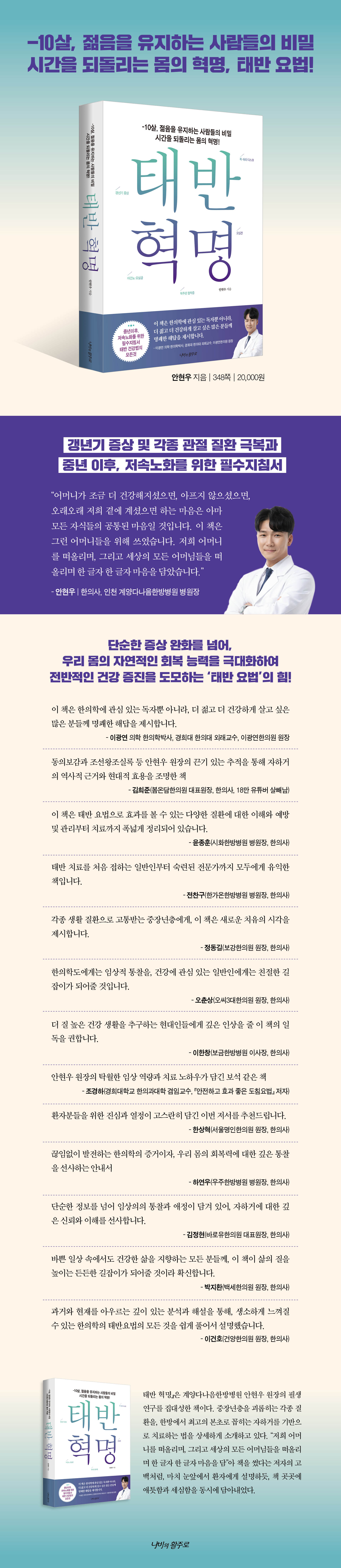´ëÇѹα¹ ³ó±¸ ±¹°¡´ëÇ¥¿´´ø ¼ÀåÈÆ ¼±¼ö°¡ ¹æ¼Û¿¡¼ ¡°¼±¼ö ½ÃÀý ü·ÂÀ» À¯ÁöÇϱâ À§ÇØ ¿Â°® ¹æ¹ýÀ» ¾²´Ù°¡ °á±¹ 1³â¿¡ 50¹ø¾¿ ÅÂ¹Ý Áֻ縦 ¸Â¾Ò´Ù.¡±¶ó°í °í¹éÇßÀ» ¸¸Å ŹÝÀº °·ÂÇÑ »ý¸í·ÂÀ» Áö´Ï°í ÀÖ½À´Ï´Ù. ÇÑÀÇÇп¡¼´Â ŹÝÀ» ¡®ÀÚÇϰš¯¶ó°í ÇÏ¿©, ¾àħ°ú ÇѾàÀç µîÀ¸·Îµµ ¸¹ÀÌ È°¿ëÇϰí ÀÖ½À´Ï´Ù. _p.17 ÀÚÇϰÅ, ¿Ö »ý¸íÀ» ÀÕ´Â À̸§Àϱî¿ä? ÀÌ ¼¼ ±ÛÀÚ, ¡®ÀÚí¹¡¯, ¡®ÇÏùÁ¡¯, ¡®°ÅË硯´Â °¢°¢ °í±ÍÇÔ, »ý¸í·Â, À̵¿°ú Àü´ÞÀ» ÀǹÌÇÕ´Ï´Ù. À̸¦ Á¾ÇÕÇÏ¸é ¡®ÀÚÇϰš¯´Â ¡°¾î¸Ó´ÏÀÇ °í±ÍÇÑ »ý¸í·ÂÀÌ ¼ö·¹¸¦ Ÿ°í È帣´Â °¹°Ã³·³ žƿ¡°Ô Àü´ÞµÇ´Â °Í¡±À» »ó¡ÇÑ´Ù°í º¼ ¼ö ÀÖ½À´Ï´Ù. ´Ü¼øÇÑ Å¹ÝÀ̶ó´Â °³³äÀ» ³Ñ¾î, ÀÚÇϰŴ ¾î¸Ó´Ï°¡ ¾ÆÀ̸¦ ÇâÇØ ÀüÇÏ´Â »ç¶û°ú »ý¸íÀÇ °áÁ¤Ã¼ÀÔ´Ï´Ù. _p.25 ¿Õ½ÇÀÇ ±â·ÏµéÀº ÁßÀüÀÇ Áúº´ Ä¡·á¿Í °Ç° °ü¸®¿¡ ÀÚÇϰŰ¡ ºó¹øÇϰí Áß¿äÇÏ°Ô »ç¿ëµÇ¾úÀ½À» Áõ¸íÇÕ´Ï´Ù. ÀÌ´Â ÀÚÇϰŰ¡ ´Ü¼øÈ÷ ¹Î°£¿¡¼ ÀüÇØ ³»·Á¿À´Â ¾àÀç°¡ ¾Æ´Ï¶ó, Á¶¼± ¿Õ½ÇÀÇ ÃÖ°í ÀÇ·á±â°üÀÎ ³»ÀÇ¿ø¿¡¼ ±× È¿´ÉÀ» °ËÁõÇÏ°í ½Å·ÚÇß´ø ¡®°ø½ÄÀûÀÎ ¸í¾à¡¯À̾úÀ½À» º¸¿©ÁÖ´Â °·ÂÇÑ Áõ°ÅÀÔ´Ï´Ù. _p.39 Çö´ëÀÇÇÐÀÌ °»³â±â¸¦ ÁÖ·Î ¿©¼ºÈ£¸£¸ó °¨¼Ò¶ó´Â ¿äÀÎÀ¸·Î º¸°í È£¸£¸ó º¸Ãæ ¿ä¹ý µîÀ¸·Î Á¢±ÙÇÏ´Â ¹Ý¸é, ÇÑÀÇÇÐÀº À̸¦ Àü½ÅÀûÀÎ º¯È °úÁ¤À¸·Î ¹Ù¶óº¸°í Ä¡·áÇÕ´Ï´Ù. °»³â±â¿¡ ³ªÅ¸³ª´Â ´Ù¾çÇÑ Áõ»óÀº ´Ü¼øÈ÷ È£¸£¸óÀÇ ¹®Á¦°¡ ¾Æ´Ï¶ó, ³ªÀ̰¡ µé¸é¼ ¸ö ÀüüÀÇ ±ÕÇüÀÌ ¹«³ÊÁö°í ¿ÀÀåÀ°ºÎÀÇ ±â´ÉÀÌ ÀúÇÏµÇ¸é¼ ³ªÅ¸³ª´Â ÀÚ¿¬½º·¯¿î °á°ú¹°ÀÔ´Ï´Ù. µû¶ó¼ ÇÑÀÇÇÐÀº Áõ»ó ¾ïÁ¦¿¡ ±×Ä¡Áö ¾Ê°í, ±Ùº» ¿øÀÎÀ» ã¾Æ ¸öÀÇ ±ÕÇüÀ» ȸº¹ÇÏ´Â µ¥ ÁßÁ¡À» µÓ´Ï´Ù. _p.72 ÀÚÇϰÅ, Áï ŹÝÀº ÇÑÀÇÇп¡¼ µû¶æÇÑ ¼ºÁúÀ» °¡Áø ¾àÀç·Î ºÐ·ùµË´Ï´Ù. µû¶ó¼ ÀϹÝÀûÀ¸·Î ¸ö¿¡ ¿ÀÌ ¸¹Àº »ç¶÷º¸´Ù´Â, ¸öÀÌ Â÷°í ÃßÀ§¸¦ ¸¹ÀÌ Å¸´Â »ç¶÷, ƯÈ÷ ¼Õ¹ßÀÌ Â÷°Å³ª ¾Æ·§¹è°¡ ³ÃÇÑ Ã¼Áú¿¡ ´õ Àß ¸Â´Â °ÍÀ¸·Î ¾Ë·ÁÁ® ÀÖ½À´Ï´Ù. ŹÝÀº ¾Æ¹Ì³ë»ê, È¿¼Ò, ºñŸ¹Î, ¼ºÀåÀÎÀÚ µî ´Ù¾çÇÑ »ý¸®È°¼º ¼ººÐÀ» ÇÔÀ¯Çϰí ÀÖ¾î ¼¼Æ÷ ´ë»ç¸¦ Ȱ¼ºÈÇϰí Ç÷¾×¼øÈ¯À» °³¼±ÇÏ´Â µ¥ µµ¿òÀÌ µË´Ï´Ù. ±× °á°ú ü¿Â À¯Áö¿¡ ±â¿©Çϸç, ¸é¿ª·ÂÀ» ³ôÀ̰í ÇǷΠȸº¹À̳ª Àü¹ÝÀûÀÎ ½Åü ±â´É °È¿¡ È¿°ú¸¦ º¸ÀÏ ¼ö ÀÖ½À´Ï´Ù. _p.127 ÇÑÀÇÇп¡¼´Â ôÃß°ü ÇùÂøÁõÀ» ´Ü¼øÈ÷ ôÃßÀÇ ±¸Á¶ÀûÀÎ ¹®Á¦·Î º¸Áö ¾Ê½À´Ï´Ù. ¿ÀÈ÷·Á ü³»ÀÇ ¼øÈ¯°ú ´ë»ç ºÒ±ÕÇü, ±×¸®°í ÀåºÎíôݰ ±â´ÉÀÇ ÀúÇϰ¡ ´©ÀûµÇ¾î ¹ß»ýÇÏ´Â Àü½ÅÀûÀÎ °á°ú·Î ¿©±é´Ï´Ù. ÁÖ¿ä ¿øÀÎ Áß Çϳª´Â ´ãÀ½ÓÃëæÀÔ´Ï´Ù. ´ãÀ½Àº ü³» ¼öºÐ ´ë»ç°¡ ¿øÈ°ÇÏÁö ¾Ê¾Æ »ý±â´Â º´¸®ÀûÀÎ »ê¹°·Î, ´ãÀ½ÀÌ ½×À̸é Àδë¿Í ÁÖº¯ Á¶Á÷ÀÌ µÎ²¨¿öÁö°í À¯¿¬¼ºÀ» ÀÒ°Ô µË´Ï´Ù. ¶ÇÇÑ ¾îÇ÷åÜúì ¿ª½Ã Áß¿äÇÑ ¿øÀÎÀ¸·Î ÀÛ¿ëÇÕ´Ï´Ù. ¾îÇ÷Àº Ç÷¾×ÀÇ ¼øÈ¯ÀÌ ¿øÈ°ÇÏÁö ¸øÇϰí Á¤Ã¼µÈ °ÍÀ» ¸»Çϴµ¥, ÀÌ´Â ¿°ÁõÀ» À¯¹ßÇϰí Á¶Á÷À» ´Ü´ÜÇÏ°Ô ¸¸µé¸ç ÅëÁõ°ú ÀÎ´ë ºñÈĸ¦ ¾ÇȽÃŵ´Ï´Ù. _p.193 ²ÙÁØÈ÷ Ä¡·á¿Í ¿îµ¿À» º´ÇàÇÑ °á°ú ÇÑ ´Þ Á¤µµ Áö³ª¸é¼ ÅëÁõÀÌ Á¡Á¡ ÁÙ¾îµé±â ½ÃÀÛÇß°í, 2°³¿ùÀÌ Áö³ªÀÚ ÅëÁõµµ 80% ÀÌ»ó ÁÙ¾ú½À´Ï´Ù. ¹«¸À» ±¸ºÎ¸®°í Æì´Â µ¿ÀÛµµ ÈξÀ ºÎµå·¯¿öÁ³°í °è´ÜÀ» ³»·Á°¥ ¶§ÀÇ ½ÃÅ«°Å¸®°í ÂÇÑ ´À³¦µµ °ÅÀÇ ¾ø¾îÁ³½À´Ï´Ù. ȯÀÚºÐÀº ¡°Ã³À½¿£ ¼ö¼ú ¸»°í´Â ¹æ¹ýÀÌ ¾øÁö ¾ÊÀ»±î »ý°¢Çߴµ¥, Áö±ÝÀº ÀÏ»ó»ýȰµµ ¹«¸® ¾øÀÌ ÇÏ°í °¡º¿î »êÃ¥±îÁö °¡´ÉÇØ¼ Á¤¸» ¸¸Á·½º·´´Ù.¡±¶ó°í Çϼ̽À´Ï´Ù. ¹Ý¿ù»ó ¿¬°ñÆÇ ÆÄ¿À̶ó°í ÇØ¼ ¸ðµÎ ¼ö¼úÀÌ ÇÊ¿äÇÑ °Ç ¾Æ´Õ´Ï´Ù. ÃʱâÀ̰ųª ºÎºÐ ÆÄ¿ÀÇ °æ¿ì¿¡´Â ȯÀÚºÐó·³ ºñ¼ö¼úÀû Ä¡·á¿Í »ýȰ½À°ü °³¼±¸¸À¸·Îµµ ÃæºÐÈ÷ È£ÀüµÉ ¼ö ÀÖ½À´Ï´Ù. ´Ù¸¸, ²ÙÁØÇÑ °ü¸®¿Í ¹«¸®ÇÏÁö ¾Ê´Â ¿îµ¿ÀÌ ¹Ýµå½Ã ÇÔ²² ÀÌ·ïÁ®¾ß ÇÕ´Ï´Ù. _p.336 ÃâÆÇ»ç ¼ÆòÀÚÇϰÅ(í¹ùÁó³): »ç¶÷ÀÇ Å¹ÝÀ» Çѹ濡¼ À̸£´Â ¸»