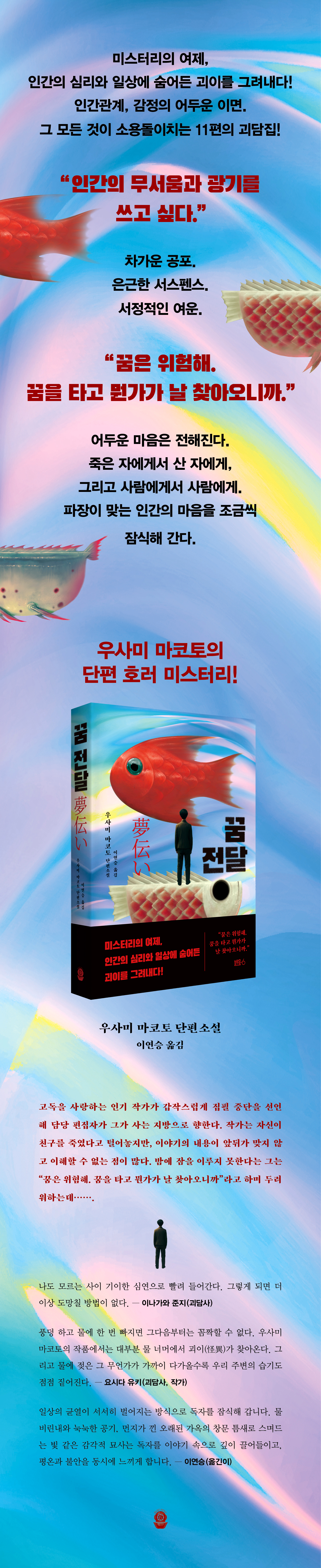 ¡º²Þ Àü´Þ¡»Àº ¿ì»ç¹Ì ¸¶ÄÚÅä°¡ ¼´ÃÇÏ°Ô ½á³»·Á °£ ´ÜÆí È£·¯ ¹Ì½ºÅ͸® 11ÆíÀ» ¿«Àº Ã¥ÀÌ´Ù. ¸ÕÀú Ç¥Á¦ÀÛ ¡¸²Þ Àü´Þ¡¹Àº Àαâ ÀÛ°¡°¡ µ¹¿¬ ÀýÇÊÀ» ¼±¾ðÇÏ¸ç ½ÃÀÛÇÑ´Ù. º¸´Ù¸øÇØ ÀÚ½ÅÀ» ã¾Æ¿Â ÆíÁýÀÚ¿¡°Ô ÀÛ°¡´Â ¡°²ÞÀ» Ÿ°í ¹º°¡°¡ ³ª¸¦ ã¾Æ¿Â´Ù¡±¶ó´Â ±â¹¦ÇÑ ¸»À» ³²±â°í, ÀÌ ÇѸ¶µð¸¦ ±âÁ¡À¸·Î Çö½Ç°ú ¼³¸í ºÒ°¡´ÉÇÑ Çö»óÀÌ ±³Â÷ÇÑ´Ù. ¡¸¼öÁ·¡¹¿¡¼´Â Áö¹æ ¼öÁ·°ü¿¡¼ ÀϾ´Â ¼ö¼ö²²³¢ °°Àº »ç°ÇÀÌ ¹°°ú À°ÁöÀÇ °æ°è¸¦ È帮°Ô Çϰí, ¡¸¿¡¾î Ç÷£Æ®¡¹¿¡¼´Â Èë ¾øÀ̵µ »ì¾Æ°¡´Â ½Ä¹°Ã³·³ °í¸³µÈ »ç¶÷µéÀÇ ÀÏ»ó¿¡ ±âÀÌÇÑ º¯È°¡ ½º¸çµç´Ù. ¡¸Ä§Çϱ³¸¦ °Ç³ÊÀÚ¡¹¿¡¼´Â ¾î¸° ½ÃÀý, ÀÚ½ÅÀÌ ÀúÁö¸¥ Àϰú ÇöÀçÀÇ ºñ±Ø°úÀÇ ¾Ë ¼ö ¾ø´Â ¿¬°ü¼ºÀÌ ¹àÇôÁø´Ù. ±×¹Û¿¡ ¡¸»ç¶ûÀº ±¸ºÐÇÒ ¼ö ¾ø´Ù¡¹, ¡¸³Å»ý¡¹, ¡¸È£Á·¡¹, ¡¸º¸³»´Â ¼ø·ÊÀÚ¡¹, ¡¸³¡¾ø´Â ¼¼»óÀÇ ³¡¡¹, ¡¸º¸¸§´ÞÀÌ ¶á °Å¸®¡¹, ¡¸¾î¸Ó´ÏÀÇ ÀÚȻ󡹱îÁö °¢°¢ÀÇ ¿¡ÇǼҵå´Â ³ª¸§ÀÇ °³¼º°ú µ¶Æ¯ÇÑ ¸Å·ÂÀ» ¹ß»êÇÑ´Ù.