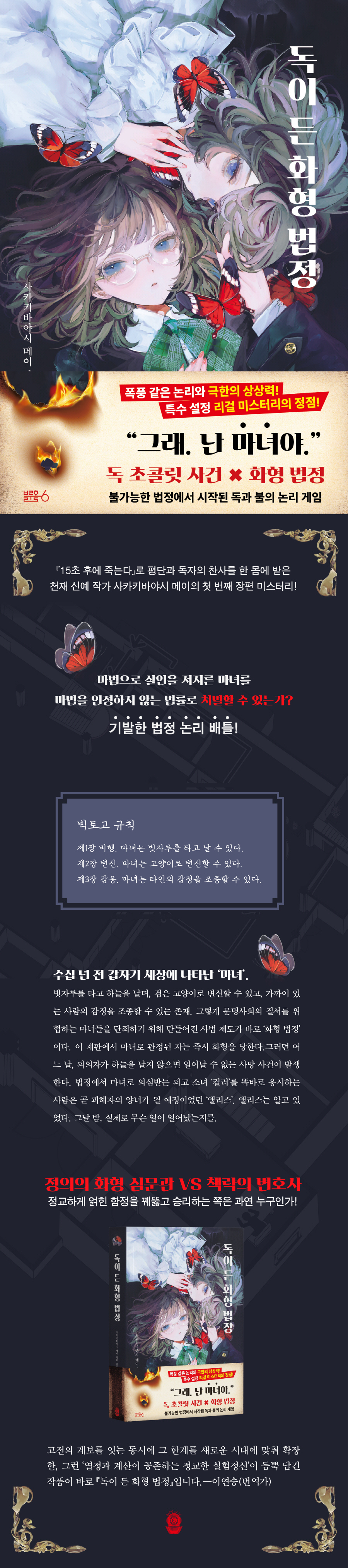 ¡ºµ¶ÀÌ µç ÈÇü ¹ýÁ¤¡»ÀÇ ÀÛ°¡ »çīŰ¹Ù¾ß½Ã ¸ÞÀÌ´Â 2021³â Á¦21ȸ ¡®¹Ì½ºÅ͸®Áî! ½ÅÀÎ»ó¡¯ ÀÔ¼±ÀÛÀÎ ¡¸15ÃÊ¡¹°¡ Æ÷ÇÔµÈ µ¥ºß ´ÜÆíÁý ¡º15ÃÊ ÈÄ¿¡ Á״´١»¸¦ ³»³õÀ¸¸ç ÇÑÀÏ ¾ç±¹¿¡¼ ÁÖ¸ñ¹Þ¾Ò´Ù. ±×·± ÀÛ°¡ÀÇ µÎ ¹øÂ° Ãâ°£ÀÛÀÌÀÚ ÃÖÃÊÀÇ ÀåÆí ¹Ì½ºÅ͸®°¡ ¹Ù·Î ¡ºµ¶ÀÌ µç ÈÇü ¹ýÁ¤¡»ÀÌ´Ù. ÀÌ ÀÛǰÀº ÀÛ°¡°¡ µ¥ºßÀÛ¿¡¼ º¸¿©ÁØ ½ÇÇèÁ¤½ÅÀ» ÇÑÃþ ±Ø´ëÈÇÑ ÀÛǰÀÌÀÚ ³í¸®¿Í »ó»ó·ÂÀ» ±ØÇѱîÁö ¹Ð¾îºÙÀΠƯ¼ö ¼³Á¤ º»°Ý ¹Ì½ºÅ͸®´Ù. ƯÈ÷ °íÀü Ã߸®¼Ò¼³ÀÇ ±³°ú¼ °ÝÀÎ µÎ ÀÛǰ, Áï ¾Ø¼´Ï ¹öŬ¸®ÀÇ ¡ºµ¶ ÃÊÄݸ´ »ç°Ç(The Poisoned Chocolates Case)¡»(1929)°ú Á¸ µñ½¼ Ä«ÀÇ ¡´ÈÇü ¹ýÁ¤(The Burning Court)¡µ(1937)À» ¡®¹ýÁ¤¡¯À̶ó´Â ÇÑ °ø°£ ¾È¿¡¼ °áÇÕÇØ ¡®Æ¯¼ö ¼³Á¤ ¸®°É ¹Ì½ºÅ͸®¡¯¶ó´Â ¿ÏÀüÈ÷ »õ·Î¿î ÇüÅ·ΠÀçź»ýÇÑ ÀÛǰÀÌ´Ù.