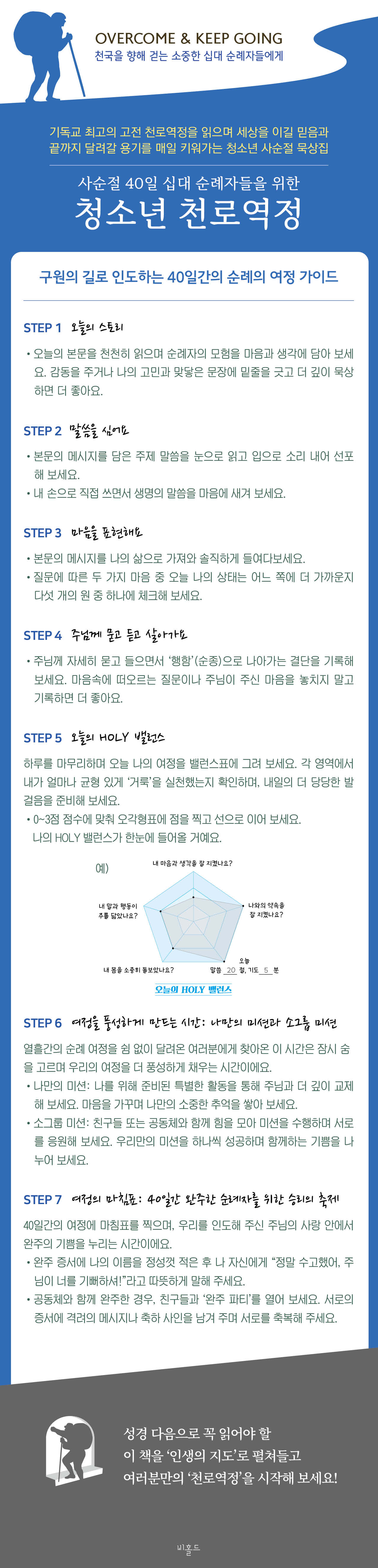 ¸ÕÀú À̾߱⸦ ÅëÇØ Áø¸®¸¦ ¹ß°ßÇÏ°í ³» ¸¶À½À» ¼¼¹ÐÇÏ°Ô »ìÇÇ´Â ¡®¿À´ÃÀÇ ½ºÅ丮(Step 1)¡¯·Î ¹®À» ¿¬ µÚ, ÁÖÁ¦¸»¾¸À» Á÷Á¢ ÇÊ»çÇϸç Áø¸®¸¦ ¸¶À½¿¡ ±íÀÌ »õ±â´Â ¡®¸»¾¸À» ½É¾î¿ä(Step 2)¡¯¿Í ´Ù¼¸ °³ÀÇ ¿ø À§¿¡ ³ªÀÇ ¼ÖÁ÷ÇÑ °¨Á¤À» ´ã¾Æ³»´Â ¡®¸¶À½À» Ç¥ÇöÇØ¿ä(Step 3)¡¯¸¦ ÅëÇØ ÁÖ´Ô ¾Õ¿¡ Áø½ÇÇÏ°Ô ³ª¾Æ°©´Ï´Ù. À̾îÁö´Â ¹¬»óÁú¹®À¸·Î ÁÖ´ÔÀÇ ¸¶À½À» ¾Ë°í ±â»Ú°Ô ¼øÁ¾ÇÏ´Â ¹ýÀ» ¹è¿ì´Â ¡®ÁÖ´Ô²² ¹¯°í µè°í »ì¾Æ°¡¿ä(Step 4)¡¯¿Í ¸ÅÀÏÀÇ ²ÙÁØÇÑ °æ°ÇÈÆ·ÃÀ¸·Î ½Å¾ÓÀÇ ±âÃÊü·ÂÀ» ±â¸£´Â ¡®¿À´ÃÀÇ HOLY ¹ë·±½º(Step 5)¡¯´Â ½Å¾ÓÀ» Ãß»óÀûÀÎ ÀÌ·ÐÀÌ ¾Æ´Ñ ±¸Ã¼ÀûÀÎ »ýȰ ½À°üÀ¸·Î Á¤Âø½Ãŵ´Ï´Ù. ¿©±â¿¡ ´Ù¾çÇÑ ¹Ì¼ÇÀ» ¼öÇàÇϸç Áöüµé°ú ¼ÒÁßÇÑ Ãß¾ï°ú ¿ìÁ¤À» ½×´Â ¡®°³ÀÎ&¼Ò±×·ì ¹Ì¼Ç(Step 6)¡¯°ú õ±¹ ÀÔ¼ºÀ» ±â³äÇÏ´Â ¡®40ÀÏ ¿ÏÁÖ ÀÎÁõ(Step 7)¡¯ Ȱµ¿Àº ½Å¾ÓÈÆ·Ã¿¡ ¼ºÃëÀÇ ±â»ÝÀ» ´õÇØÁÝ´Ï´Ù. ÀÌ·¯ÇÑ ½ÇõÀû ±¸Á¶´Â ´Ü¼øÈ÷ Ã¥ ÇÑ ±ÇÀ» Àд °æÇèÀ» ³Ñ¾î û¼Ò³âµéÀÌ ÀÚ½ÅÀÇ ³»¸éÀ» Á÷Á¢ °¡²Ù°í ¼¼¿ö°¡´Â ¼ÒÁßÇÑ ¼ºÀåÀÇ ±âȸ¸¦ ¼±»çÇϸç, ºÎ¸ð¿Í ±³»ç¿¡°Ô´Â ´ÙÀ½ ¼¼´ë¿Í ±íÀº ´ëȸ¦ ³ª´ ¼ö ÀÖ´Â µçµçÇÑ ´Ù¸®°¡, û¼Ò³âµé¿¡°Ô´Â ¼¼»óÀ» À̰ܳ¾ ¹ÏÀ½ÀÇ µ¿·ÂÀÌ µÇ¾îÁÙ °ÍÀÔ´Ï´Ù.