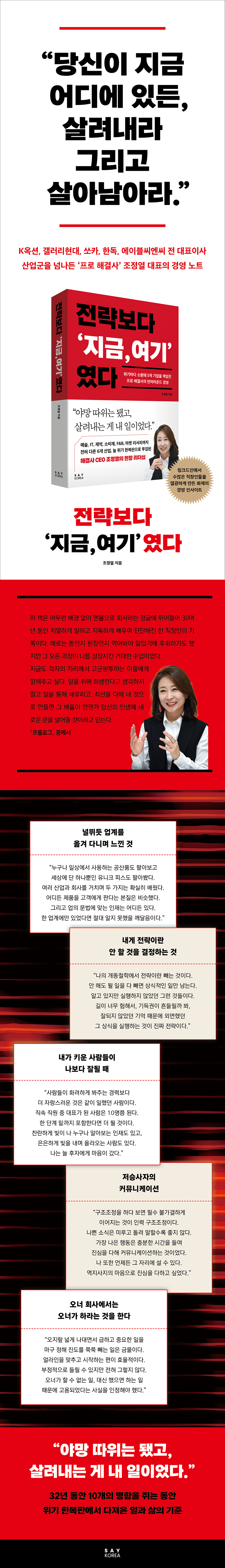 ¡ºÀü·«º¸´Ù ¡®Áö±Ý, ¿©±â¡¯¿´´Ù¡»´Â È·ÁÇÑ ½ºÆåÀ» ¹ÙÅÁÀ¸·Î Å« À§±â ¾øÀÌ ²É±æ¸¸ °É¾î¿Â ¿¤¸®Æ®ÀÇ ±Ù»çÇÑ ¼º°ø´ãÀÌ ¾Æ´Ï´Ù. ¡°¶ËÀÎÁö µÈÀåÀÎÁö ²À ¸Ô¾îºÁ¾ß ¾Æ´Â¡± »ç¶÷À̶ó°í ÀÚ½ÅÀ» ¼Ò°³ÇÑ ÀúÀÚ´Â ¾ÕµÚ¸¦ Àç°í µæ½ÇÀ» µûÁö´Â º¹ÀâÇÑ °è»êÀÌ ¾Æ´Ñ ´Ü¼øÇÑ ½ÇÇà·ÂÀ¸·Î ¸Å ¼ø°£ ¡®Áö±Ý, ¿©±â¡¯¿¡ ÀÖ¾ú´Ù. ¼ºÀå, µµÀü, ¹®Á¦ ÇØ°á, »ç¶÷, ¸®´õ½Ê, ȸ°í¸¦ Ű¿öµå·Î ¿©¼¸ °³ÀÇ Àå¿¡ °ÉÃÄ ÀúÀÚ°¡ Ç®¾î³õ´Â À̾߱â´Â ÀÌ·ÐÀÌ ¾Æ´Ñ °æÇèÀ¸·Î, ¸Ó¸®°¡ ¾Æ´Ñ ¸öÀ¸·Î ºÎµúÄ¡¸ç ±ú´ÞÀº ³¯°ÍÀÇ °æ¿µ ¼ö¾÷ÀÌÀÚ Ä¡¿ÇÑ »ýÁ¸±âÀÌ´Ù.