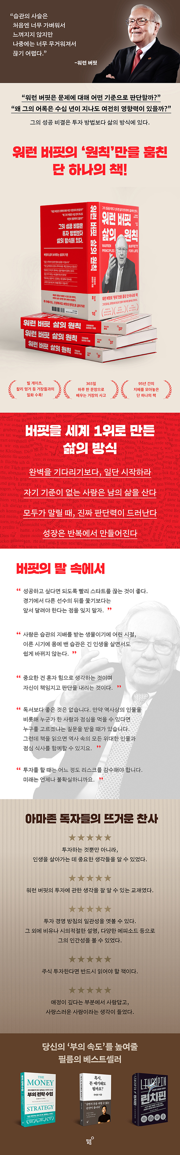 ÀÌ Ã¥¿¡ ´ã±ä ¸»µéÀº ¼¼°è ÃÖ°í ÅõÀÚÀÚÀÇ ¸í¾ðÀÌÁö¸¸, ³î¶ø°Ôµµ Á¤ÀÛ ±× ¸Þ½ÃÁö´Â ¡®µ·À» ¹ö´Â ¹ý¡¯ÀÌ ¾Æ´Ï¶ó ¡®»îÀ» »ì¾Æ°¡´Â ŵµ¡¯¿¡ ¸ÂÃçÁ® ÀÖ´Ù. ¹öÇÍÀº ÀÚ½ÅÀÇ ¿øÄ¢À» ÅõÀÚ»Ó¸¸ ¾Æ´Ï¶ó, »î¿¡ À־µ Àû¿ëÇß´ø °ÍÀ̾ú´Ù. ¡°ÀÏ´Ü ½ÃÀÛÇÏÁö ¾ÊÀ¸¸é Àý´ë ¼º°øÇÒ ¼ö ¾ø½À´Ï´Ù¡±, ¡°½ÇÆÐÇÑ ¹æ¹ýÀ» ±»ÀÌ ¹Ýº¹ÇÒ ÇÊ¿ä´Â ¾ø½À´Ï´Ù¡± µî ¹öÇÍÀÇ ¿øÄ¢ÀÌ ´ã±ä ÇÑ ¹®Àå ÇÑ ¹®ÀåÀ» Àо´Ù º¸¸é ±×°¡ ¾î¶² ¸¶À½À¸·Î ¼¼»óÀ» »ì¾Æ°¬´ÂÁö »Ä¼Ó ±íÀÌ ´À³¥ ¼ö ÀÖÀ» °ÍÀÌ´Ù.