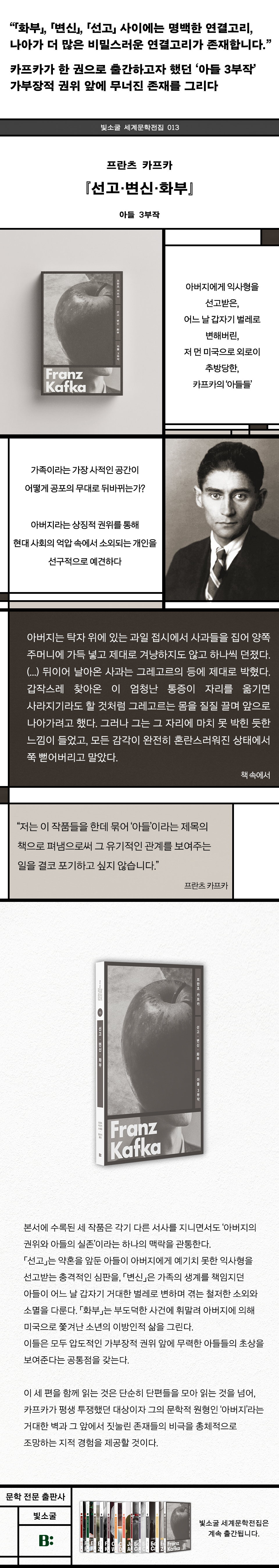 º»¼¿¡ ¼ö·ÏµÈ ¼¼ ÀÛǰÀº °¢±â ´Ù¸¥ ¼»ç¸¦ Áö´Ï¸é¼µµ ¡®¾Æ¹öÁöÀÇ ±ÇÀ§¿Í ¾ÆµéÀÇ ½ÇÁ¸¡¯À̶ó´Â ÇϳªÀÇ ¸Æ¶ôÀ» °üÅëÇÑ´Ù. ¡¸¼±°í¡¹´Â ¾àÈ¥À» ¾ÕµÐ ¾ÆµéÀÌ ¾Æ¹öÁö¿¡°Ô ¿¹±âÄ¡ ¸øÇÑ ÀÍ»çÇüÀ» ¼±°í¹Þ´Â Ãæ°ÝÀûÀÎ ½ÉÆÇÀ», ¡¸º¯½Å¡¹Àº °¡Á·ÀÇ »ý°è¸¦ Ã¥ÀÓÁö´ø ¾ÆµéÀÌ ¾î´À ³¯ °©Àڱ⠰ŴëÇÑ ¹ú·¹·Î º¯ÇÏ¸ç °Þ´Â Ã¶ÀúÇÑ ¼Ò¿Ü¿Í ¼Ò¸êÀ» ´Ù·é´Ù. ÀåÆí ¡º½ÇÁ¾ÀÚ¡»ÀÇ Á¦1ÀåÀ̱⵵ ÇÑ ¡¸ÈºÎ¡¹´Â ºÎµµ´öÇÑ »ç°Ç¿¡ ÈÖ¸»·Á ¾Æ¹öÁö¿¡ ÀÇÇØ ¹Ì±¹À¸·Î ÂѰܳ ¼Ò³âÀÇ À̹æÀÎÀû »îÀ» ±×¸°´Ù. À̵éÀº ¸ðµÎ ¾ÐµµÀûÀÎ °¡ºÎÀåÀû ±ÇÀ§ ¾Õ¿¡ ¹«·ÂÇÑ ¾ÆµéµéÀÇ ÃÊ»óÀ» º¸¿©Áشٴ °øÅëÁ¡À» °®´Â´Ù. ±×·¯³ª ¡¸¼±°í¡¹°¡ ¾Æ¹öÁö¿¡ ´ëÇÑ ½É¸®Àû ±¸¼Ó°ú ó¹ú¿¡ ÁýÁßÇÑ´Ù¸é, ¡¸º¯½Å¡¹Àº ½ÅüÀÇ ¡®¾µ¸ð¡¯¿Í °³ÀÎÀÇ ¼Ò¿Ü ¹× ´ÜÀýÀ», ¡¸ÈºÎ¡¹´Â Ãß¹æÀ» ÅëÇÑ »çȸÀû °í¸³°ú È¥¶õÀ» ºÎ°¢ÇÑ´Ù. ÀÌ ¼¼ ÆíÀ» ÇÔ²² Àд °ÍÀº ´Ü¼øÈ÷ ´ÜÆíµéÀ» ¸ð¾Æ Àд °ÍÀ» ³Ñ¾î, Ä«ÇÁÄ«°¡ Æò»ý ÅõÀïÇß´ø ´ë»óÀÌÀÚ ±×ÀÇ ¹®ÇÐÀû ¿øÇüÀÎ ¡®¾Æ¹öÁö¡¯¶ó´Â °Å´ëÇÑ º®, ±×¸®°í ±× ¾Õ¿¡¼ Áþ´¸° Á¸ÀçµéÀÇ ºñ±ØÀ» ÃÑüÀûÀ¸·Î Á¶¸ÁÇÏ´Â °æÇèÀ̶ó ÇÒ ¼ö ÀÖ´Ù.
