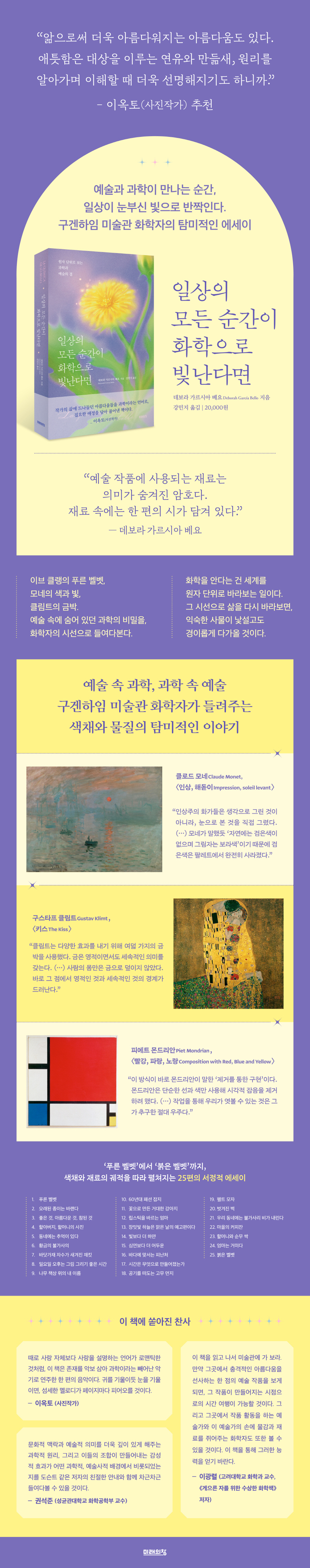 ÄÜÅ©¸®Æ® Æ´¿¡¼ ÇÇ¾î³ ¹Îµé·¹ ÇÑ ¼ÛÀÌ, ±âÂ÷¿ªÀÇ È®¼º±â ¼Ò¸®, ¹Ù´Ù ³¿»õ, Ä¿ÇÇÀÜÀÇ ÄÚ¹ßÆ®ºí·ç. ¿ì¸®´Â ÀÌ ¸ðµç °ÍÀ» ¡®°¨°¢¡¯À̶ó°í ºÎ¸£Áö¸¸, ±× À̸鿡´Â ¿øÀÚ¿Í ºÐÀÚ°¡ ¸¸µé¾î³»´Â Á¤±³ÇÑ ¿òÁ÷ÀÓÀÌ ÀÖ´Ù. ±¸°ÕÇÏÀÓ ¹Ì¼ú°ü¿¡¼ Àç·á°úÇÐÀ» °¡¸£Ä¡´Â ÈÇÐÀÚ µ¥º¸¶ó °¡¸£½Ã¾Æ º£¿ä´Â ¡¶ÀÏ»óÀÇ ¸ðµç ¼ø°£ÀÌ ÈÇÐÀ¸·Î ºû³´Ù¸é¡·¿¡ ½º¹°´Ù¼¸ ÆíÀÇ ¼Á¤ÀûÀÎ ¿¡¼¼ÀÌ·Î ÀÌ ³î¶ó¿î °¨°¢ÀÇ ÃþÀ§µéÀ» ¼¶¼¼ÇÏ°Ô ½á ³»·Á°¬´Ù. ¡®Çª¸¥ º§ºª¡¯¿¡¼ ½ÃÀÛÇØ ¡®ºÓÀº º§ºª¡¯À¸·Î ³¡³ª´Â ¿©Á¤À» µû¶ó°¡´Ù º¸¸é, ¿¹¼ú°ú °úÇÐ, °¨Á¤°ú ±¸Á¶, »ç¹°°ú Á¸ÀçÀÇ °æ°è°¡ Çã¹°¾îÁø´Ù. °¥¸Å±â ¼Ò¸®¿¡¼ ºÐÀÚÀÇ Áøµ¿À», ¼®¾ç¿¡¼ ºûÀÇ ÆÄÀåÀ», ¿À·¡µÈ Èæ¹é»çÁø ¼Ó¿¡¼´Â Àº ÀÔÀÚÀÇ ¸¶¹ýÀ» ¹ß°ßÇÏ°Ô µÉ °ÍÀÌ´Ù. ÈÇÐÀ» ¾È´Ù´Â °Ç, ¼¼°è¸¦ ¿øÀÚ ´ÜÀ§·Î ¹Ù¶óº¸´Â ÀÏÀ̴ϱî. Ã¥À» ÀÐ°í ³ª¸é, ¹«½ÉÈ÷ Áö³ªÃÆ´ø »ç¹°µéÀÌ Á¶¿ëÇÑ ºûÀ» ¸Ó±Ý°í ÀüÇô ´Ù¸¥ ¾ó±¼·Î ´Ù°¡¿À±â ½ÃÀÛÇÒ °ÍÀÌ´Ù.