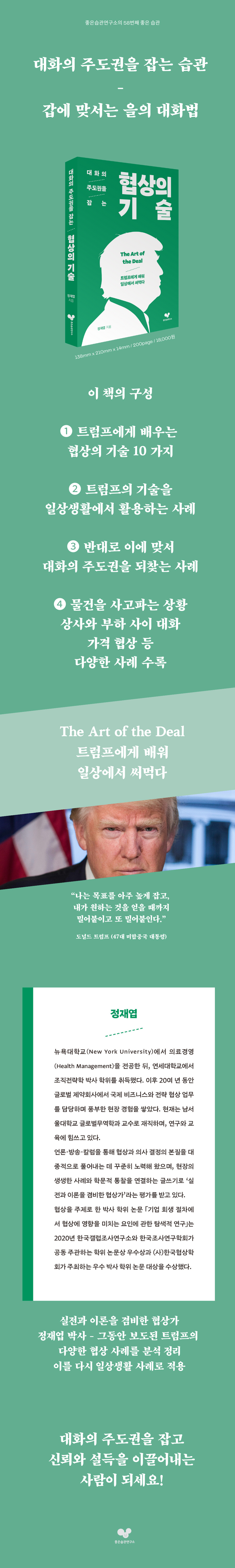 Ã¥¼Ò°³¡°Çù»óÀÇ ´ÞÀΡ±, ¡°°Å·¡ÀÇ ´ÞÀΡ±À̶ó ÀÏÄþîÁö´Â µµ³Îµå Æ®·³ÇÁ ¹Ì±¹ ´ëÅë·ÉÀÇ Çù»óÀÇ ±â¼úÀ» ºÐ¼® Á¤¸®Çß´Ù. ÃÑ 10°³ÀÇ Çù»óÀÇ ±â¼úÀ» »Ì°í, °¢ Çù»ó ±â¼úÀ» ÀÏ»ó»ýȰ¿¡¼ ¾î¶»°Ô Ȱ¿ëÇÒ ¼ö ÀÖÀ»Áö, ¹Ý´ë·Î ÀÌ·¯ÇÑ ±â¼úÀ» ¾²´Â »ó´ë¹æÀ» ¸¸³µÀ» ¶§ ¾î¶»°Ô ´ëÀÀÇϸé ÁÁÀ»Áö¸¦ ¾Ë¾Æº¸¾Ò´Ù. ´ëÈÀÇ ÁÖµµ±ÇÀ» Àâ°í ½Å·Ú¿Í ¼³µæÀ» À̲ø¾î³»´Â »ç¶÷ÀÌ µÇ´Â µ¥ ÇÊ¿äÇÑ ÁÁÀº ½À°üÀÌ´Ù.