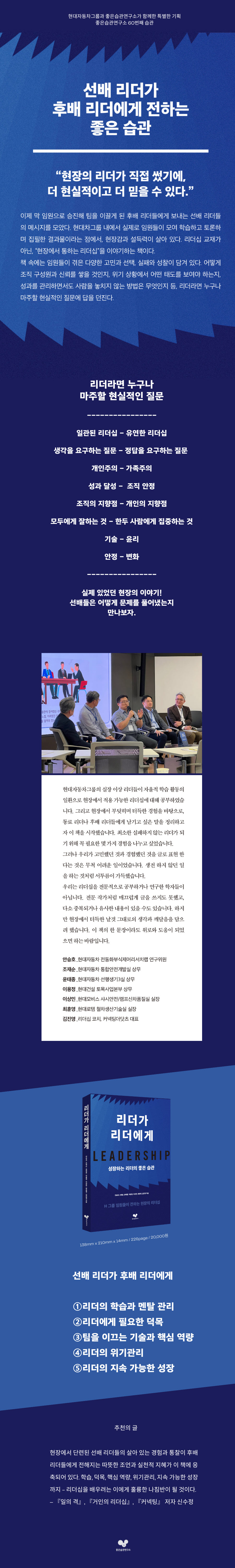 Ã¥¼Ò°³ÇöÀå¿¡¼ Á¶Á÷À» À̲ø¾î¿Â Çö´ëÂ÷±×·ì ÀÓ¿øµéÀÌ ÈÄ¹è ¸®´õµé¿¡°Ô ÀüÇÏ´Â Áø¼ÖÇÑ Á¶¾ð°ú °æÇè´ãÀ» ´ãÀº Ã¥ÀÌ´Ù. ¸®´õ½Ê ±³Àç°¡ ¾Æ´Ñ, ¡°ÇöÀå¿¡¼ ÅëÇÏ´Â ¸®´õ½Ê¡±À» À̾߱âÇÑ´Ù. Çö´ëÂ÷±×·ì ³»¿¡¼ ½ÇÁ¦·Î ÀÓ¿øµéÀÌ ¸ð¿© ÇнÀÇϰí Åä·ÐÇϸç ÁýÇÊÇÑ °á°ú¹°À̶ó´Â Á¡¿¡¼ ÇöÀå°¨°ú ¼³µæ·ÂÀÌ »ì¾Æ ÀÖ´Ù. ÇнÀ°ú ¸àÅ» °ü¸®, ÇÊ¿äÇÑ ´ö¸ñ°ú ÇÙ½É ¿ª·®, À§±â°ü¸® ¿ä·É ±×¸®°í ¸®´õ¿¡°Ôµµ ²À ÇÊ¿äÇÑ ¼ºÀå±îÁö. ÇÊ¿äÇÑ ½À°üÀ» ÇÑ ±Ç¿¡ ¸ð¾Ò´Ù.
