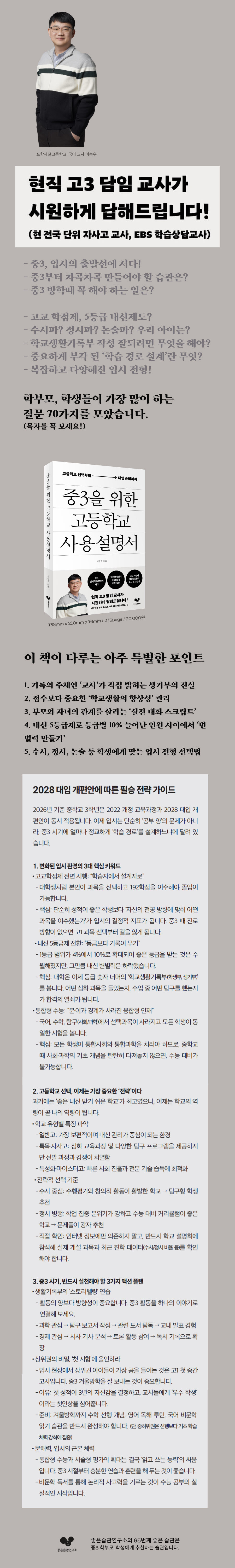 ÀÌ Ã¥Àº ÀÌ·¯ÇÑ °í¹Î¿¡¼ Ãâ¹ßÇØ Áß3 ½ÃÁ¡¿¡¼ ¹Ýµå½Ã ¾Ë¾Æ¾ß ÇÒ °íµîÇб³ ¼±Åðú °í±³ 3³âÀÇ ÇнÀ Àü·«, ±×¸®°í ´ëÀÔ ÁغñÀÇ ¹æÇâÀ» ü°èÀûÀ¸·Î Á¤¸®ÇÑ ¾È³»¼´Ù. ÇöÁ÷ ±³»ç°¡ Çб³ ÇöÀå¿¡¼ Çлý°ú Çкθ𸦠»ó´ãÇÏ¸ç °¡Àå ¸¹ÀÌ ¹Þ¾Ò´ø Áú¹®À» Áß½ÉÀ¸·Î, °íµîÇб³ ÀÔÇÐ ÀüºÎÅÍ ÁغñÇØ¾ß ÇÒ ÇÙ½É »çÇ×°ú ½ÇÁ¦ Çб³»ýȰ¿¡¼ ½×¾Æ¾ß ÇÒ °æÇèµéÀ» ±¸Ã¼ÀûÀ¸·Î ¼³¸íÇÑ´Ù.