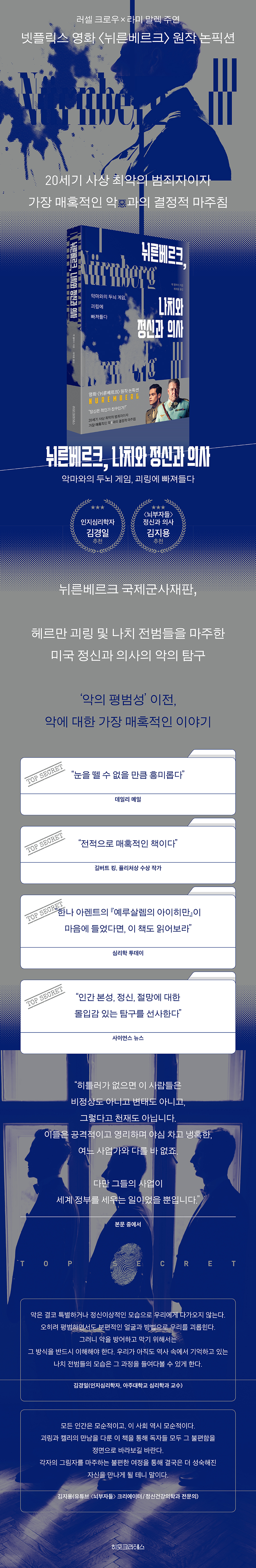 ·¯¼¿ Å©·Î¿ì, ¶ó¹Ì ¸»·º ÁÖ¿¬ÀÇ ¿µÈ ¡´´µ¸¥º£¸£Å©¡µ·Î ¿µÈÈµÈ ¿øÀÛ ³íÇȼÇÀÎ Àè ¿¤ÇÏÀÌÀÇ ¡º´µ¸¥º£¸£Å©, ³ªÄ¡¿Í Á¤½Å°ú Àǻ硻(¿øÁ¦: The Nazi and the Psychiatrist: Hermann Göring, Dr. Douglas M. Kelley, and a Fatal Meeting of Minds at the End of WWII)´Â ¾ÇÀÇ Á߽ɿ¡ °¡Àå °¡±îÀÌ ´Ù°¡°¬´ø Á¤½Å°ú ÀÇ»ç ´õ±Û·¯½º Ä̸®ÀÇ À̾߱⸦ ´Ù·é´Ù. ´µ¸¥º£¸£Å© ±¹Á¦±º»çÀçÆÇÀÇ ¾ç»ó¿¡ ÁýÁßÇÑ ¿µÈ¿Í ´Þ¸® Ã¥Àº Ä̸®°¡ °æÇèÇÑ Ç츣¸¸ ±«¸µ µî 22¸í Àü¹üµéÀÇ ½É¸®¿Í Çൿ, ±×¸®°í ±×µéÀÇ ¸¶Áö¸· ¸ð½ÀÀ» Áý¿äÇÏ°Ô µÚÂѴ´Ù. ¶ÇÇÑ ¿µÈ¿¡¼ »ý·«µÈ ±¹Á¦±º»çÀçÆÇ ÀÌÈÄ Ä̸®°¡ °æÇèÇÑ ¶Ç ´Ù¸¥ ¾ÇÀÇ ¸ð½À°ú ÆÄ±¹Àû °á¸»À» ÃßÀûÇϸç Áö±Ý ¿ì¸® ½Ã´ë¿¡ ´Ù½Ã±Ý µÇ»õ°Ü¾ß ÇÒ ¾Ç¿¡ ´ëÇÑ ÇÑ °üÁ¡°ú ±× ÆÄ±«Àû ÀÏ»ó¼ºÀ» ÀλóÀûÀ¸·Î Á¦½ÃÇÑ´Ù.