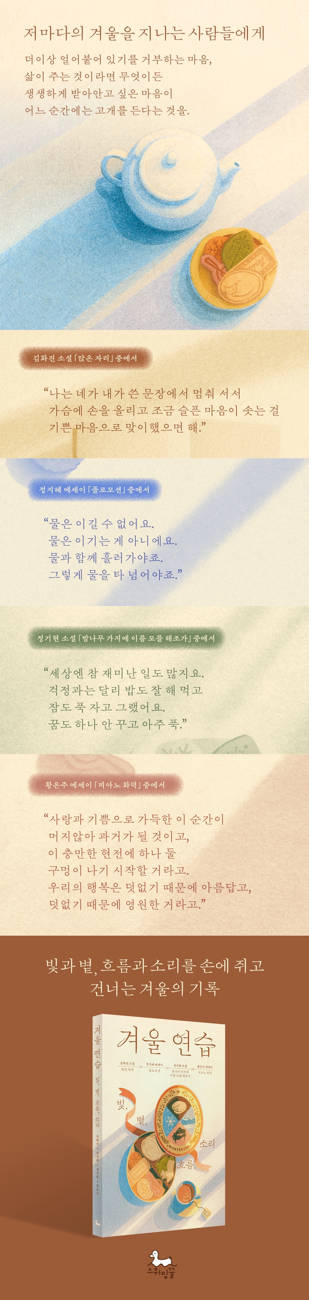 ¡º°Ü¿ï ¿¬½À-ºû, ºµ, È帧, ¼Ò¸®¡»´Â Àú¸¶´ÙÀÇ °Ü¿ïÀ» Áö³ª´Â »ç¶÷µéÀ» À§ÇÑ ¾Ø¼Ö·¯Áö·Î, Ȥµ¶ÇÑ ½Ã°£À» °Ç³Ê°¡±â À§ÇÑ »ó¡Àû ¹æ¹ýµéÀ» ´ã°íÀÚ Çß´Ù. ¼Ò¼³°¡ ±èÈÁø°ú Á¤±âÇöÀÇ ´ÜÆí¼Ò¼³, ¿µÈ Æò·Ð°¡ Á¤ÁöÇý¿Í ¹ø¿ª°¡ ȲÀºÁÖÀÇ ¿¡¼¼À̸¦ ÅëÇØ ȯÇÑ ºû°ú µû¶æÇÑ ºµ, ¶Ç ¾óÁö ¾Ê°í ²÷ÀÓ¾øÀÌ ¿òÁ÷ÀÏ ¼ö ÀÖ´Â È帧°ú ¼Ò¸®¿¡ ´ëÇÑ °¨°¢À» °æÇèÇØº¸±æ ¹Ù¶õ´Ù. °Ü¿ïÀ» °Þ°í ÀÖ´Â ´©±º°¡°¡ ÀÌ Ã¥°ú ÇÔ²² ±× ½Ã±â¸¦ ¹«»çÈ÷ Åë°úÇÒ ¼ö Àֱ⸦.