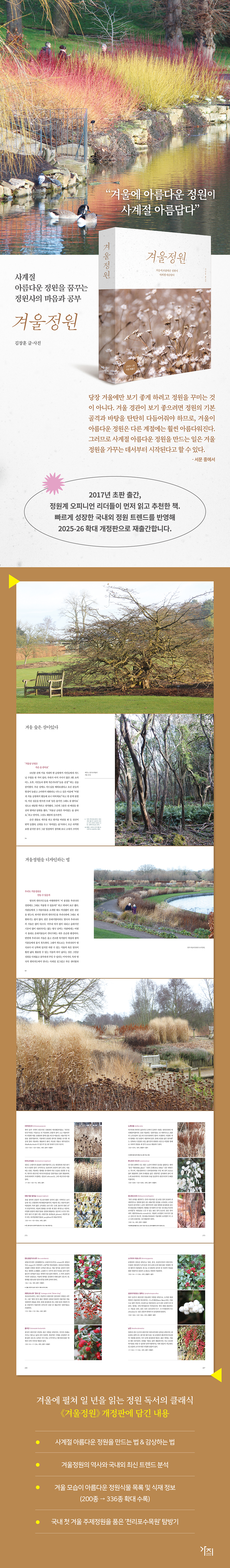 ¡¶°Ü¿ïÁ¤¿ø¡·Àº Á¤¿ø ¹®È°¡ ¹ß´ÞÇÑ À¯·´¿¡¼ Ưº°ÇÑ »ç¶ûÀ» ¹ÞÀ¸¸ç ÁøÈÇØ ¿Â À©ÅͰ¡µçÀÇ °³³äÀ» ±¹³»¿¡ óÀ½ ¼Ò°³Çϰí, »ç°èÀý ¾Æ¸§´Ù¿î Á¤¿øÀ» ¸¸µé±â À§ÇØ Á¤¿ø»çµéÀÌ ³õÄ¡Áö ¸»¾Æ¾ß ÇÒ µðÀÚÀÎÀÇ ±âÃʸ¦ Àü¼öÇÑ´Ù. °Ü¿ï³¯ÀÇ Á¤¿ø¿¡ ²À ´ã°Ü¾ß ÇÒ ¾Æ¸§´Ù¿òÀ» °Ü¿ï³ª¹«ÀÇ ¼Ó»ì, ±×¶ó½º¿Í ¸¶¸¥ ½Ä¹°, »ó·Ï¼º ³ª¹«¿Í Ç®, °Ü¿ï¿¡¸¸ º¼ ¼ö ÀÖ´Â ²É°ú ¿¸Å µî ¼¼ºÎ ÁÖÁ¦·Î ³ª´² ±¸¼ºÇÑ ±ÛÀº Á¤¿ø ½Ç¹«¿¡ °üÇÑ ÀλçÀÌÆ®°¡ °¡µæÇϸ鼵µ ½±°í ¼Á¤ÀûÀÎ ¹®ÀåÀ¸·Î ¾²¿© Á¤¿ø ¹× ½Ä¹° °¨»óÀ» Áñ±â´Â ¾ÖÈ£°¡µé¿¡°Ôµµ ±³¾çÀ» ³ÐÇôÁÙ ÁÁÀº ÀÐÀ»°Å¸®´Ù. À̹ø °³Á¤ÆÇ¿¡´Â ±¹³» ÃÖÃÊÀÇ °Ü¿ï ÁÖÁ¦Á¤¿øÀ¸·Î ²Ù¸çÁø ¡®Ãµ¸®Æ÷¼ö¸ñ¿ø ¿øÅͰ¡µç¡¯ÀÇ µðÀÚÀÎ ºÐ¼®°ú ÇÔ²², ¿ì¸®³ª¶ó °Ü¿ïÁ¤¿ø¿¡ ½ÉÀ¸¸é Àß ¾î¿ï¸®´Â ½Ä¹° ¸ñ·ÏÀ» ±âÁ¸ 200¿© Á¾¿¡¼ ÃÑ 366Á¾À¸·Î ´ëÆø º¸°ÇØ ¼ö·ÏÇß´Ù.