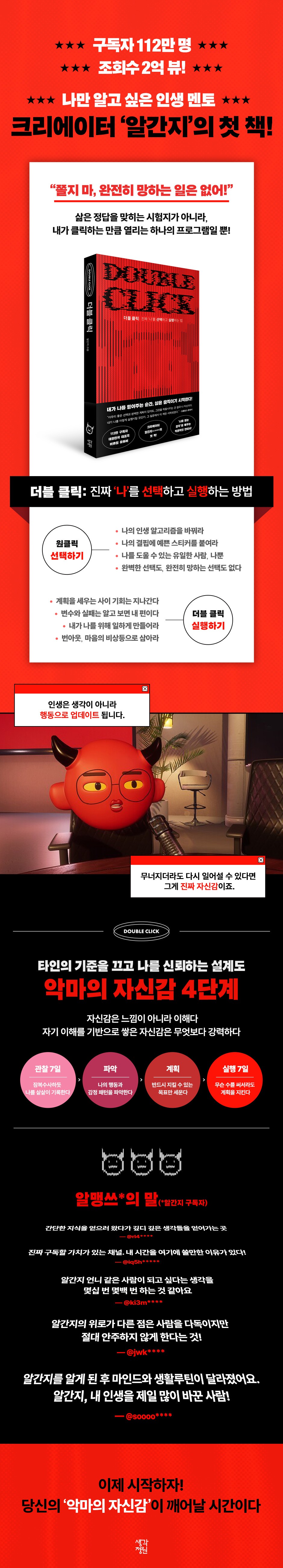 ¡°Àý´ë ½±°Ô ŸÇùÇÏÁö ¸»ÀÚ.¡± ´«¾ÕÀÇ Á¶È¸ ¼öº¸´Ù °¡Ä¡, ¼Óµµº¸´Ù ¹æÇâÀ» ¿ì¼±¼øÀ§¿¡ µÎ´Â ¾Ë°£Áö. ÀÚ±â ÀڽŰúÀÇ Å¸ÇùÀ» °æ°èÇÒ ¶§ ºñ·Î¼Ò ÀÚ½ÅÀ» ÀÒÁö ¾Ê´Â´Ù´Â °Í, ¹Ù·Î À¯Æ©¹ö·Î¼ ±×ÀÇ »î°ú ±ÛÀÌ ´øÁö´Â ÇÙ½É ¸Þ½ÃÁö´Ù. ¡¶´õºí Ŭ¸¯¡·Àº ÀڽŸ¸ÀÇ ±âÁØÀ» ¼¼¿ì°í Áö۱â À§ÇØ, ±×¸®°í Èçµé¸®´Â ¼ø°£¸¶´Ù ´Ù½Ã ¡®³ª¡¯¸¦ Ŭ¸¯ÇØ ¿Â ÀúÀÚÀÇ Ä¡¿ÇÑ ±â·ÏÀÌ´Ù. ¼±Åðú ½ÇÇà ¾Õ¿¡¼ ¸Á¼³ÀÌ´Â À̵鿡°Ô, ÀÌ Ã¥Àº °¡Àå Çö½ÇÀûÀÎ ¿ë±â¸¦ ÁÖ°í »îÀÇ ºÐ¸íÇÑ ¹æÇâÀ» °¡¸®Å²´Ù.