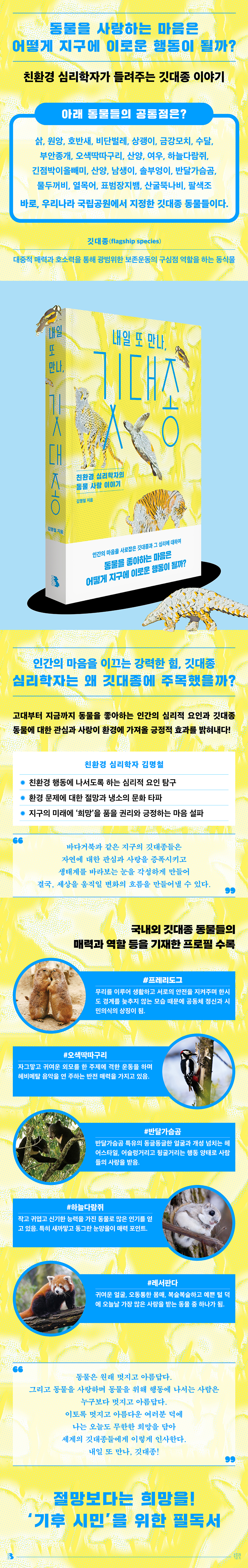 ¡¶³»ÀÏ ¶Ç ¸¸³ª, ±ê´ëÁ¾¡·Àº ȯ°æ ¹®Á¦¸¦ ´ëÇÏ´Â ±àÁ¤Àû ¸¶À½À» °Á¶ÇÑ´Ù´Â Ãø¸é¿¡¼ ¾Õ¼± Ã¥ ¡¶Áö±¸¸¦ À§ÇÏ´Â ¸¶À½¡·°ú ´à¾Æ ÀÖ´Ù. ¸Å·ÂÀûÀÎ ±ê´ëÁ¾ µ¿¹°µé¿¡ ´ëÇØ ¾Ë°í ³ª¸é ±×µéÀ» ´õ »ç¶ûÇÏ°Ô µÇ°í, ±× »ç¶ûÀÇ ÈûÀÌ ¿ì¸®¸¦ ģȯ°æ ÇൿÀ¸·Î À̲ø¾îÁÙ °ÍÀÌ´Ù. |