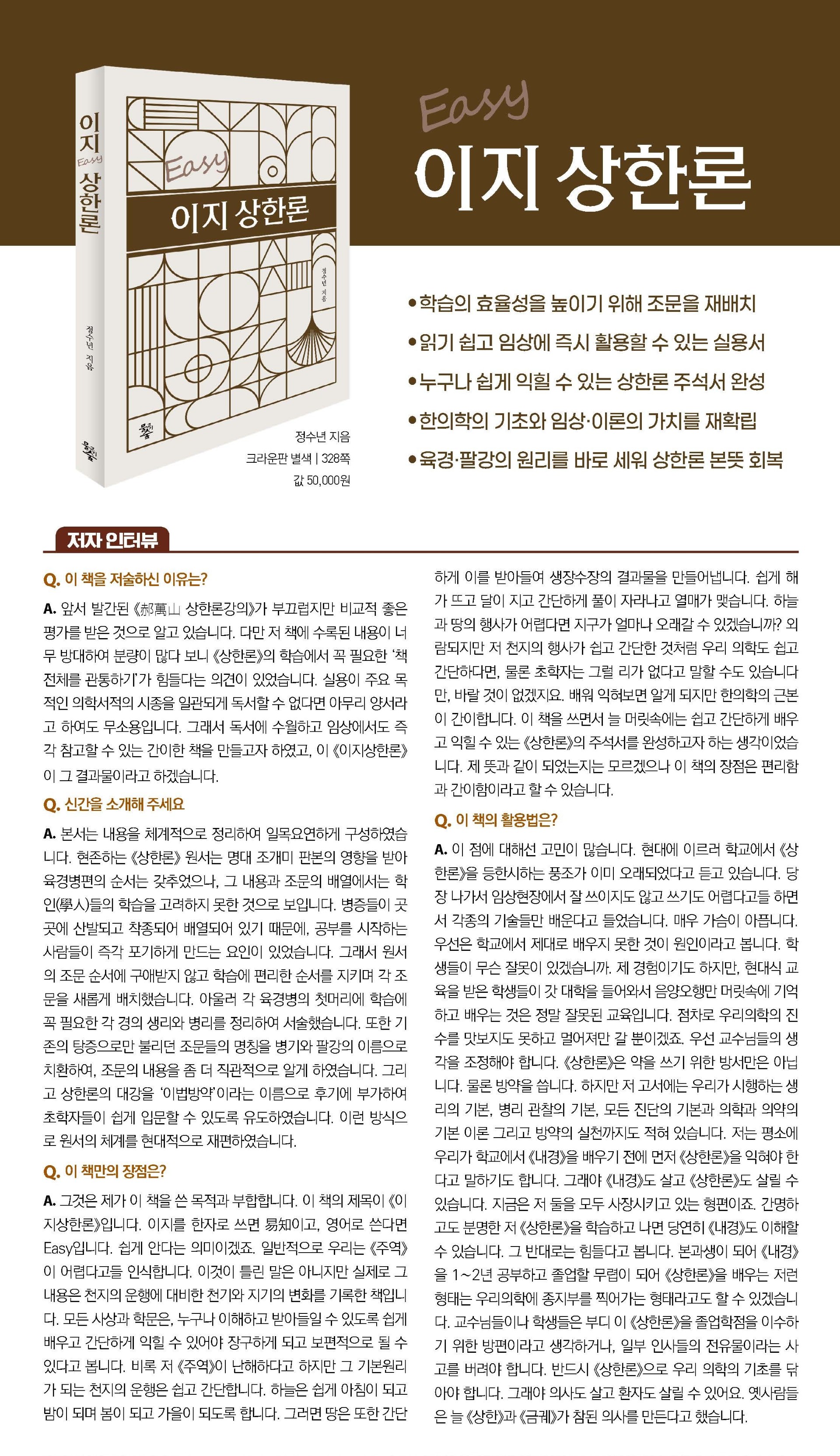 ¿ì¸® ÀÇÇÐÀ» Àü°øÇÏ´Â ÇлýµéÀº ÀÌ Ã¥À¸·Î ¿Ã¹Ù¸¥ ÇÑÀÇÇÐÀÇ ±âÃʸ¦ Á¤¸³Çϸé ÁÁ°Ú½À´Ï´Ù. ÀÓ»ó¿¡ Á¾»çÇÏ´Â ÇÑÀÇ»çµéÀº ÀÌ Ã¥À» ÅëÇØ ȯÀÚ¿¡°Ô °¡Àå ÀûÀýÇÑ ¸Á¹®¹®ÀýÀÇ Áø´ÜÀ» ½ÃÇàÇÒ ¼ö ÀÖ°í º´¿¡ ÀûÇÕÇÑ ¹æ¾àÀ» ¼±ÅÃÇÒ ¼öµµ ÀÖ½À´Ï´Ù. ±³´ÜÀÇ ¼±»ý´ÔµéÀº À½¾ç°ú Ç¥¸®ÇÑ¿Çã½Ç ¹× À°°æÀÇ Á¤È®ÇÑ ÀÇÀǸ¦ Âü°íÇÏ½Ç ¼ö ÀÖ½À´Ï´Ù. ¾Æ¿ï·¯ ÇÑÀÇÇÐ ¿¬±¸Àڵ鵵 ³í¸®¿Í ÀÓ»óÀÌ ÀϰüµÈ ¡¶»óÇѷС·ÀÇ °¡Ä¡¿¡ ´ëÇÑ ÀνÄÀ» ÀçÁ¤¸³ÇÒ ¼ö ÀÖÀ¸¸®¶ó »ý°¢ÇÕ´Ï´Ù.
